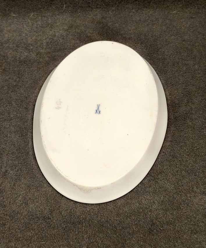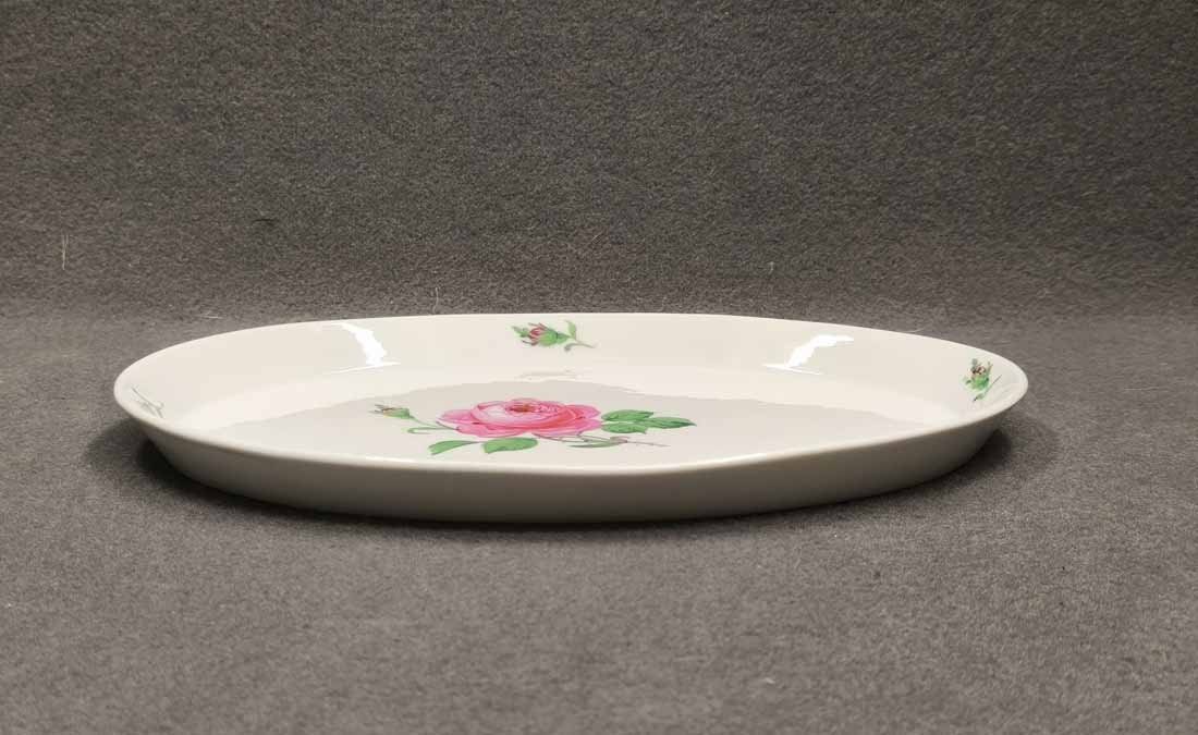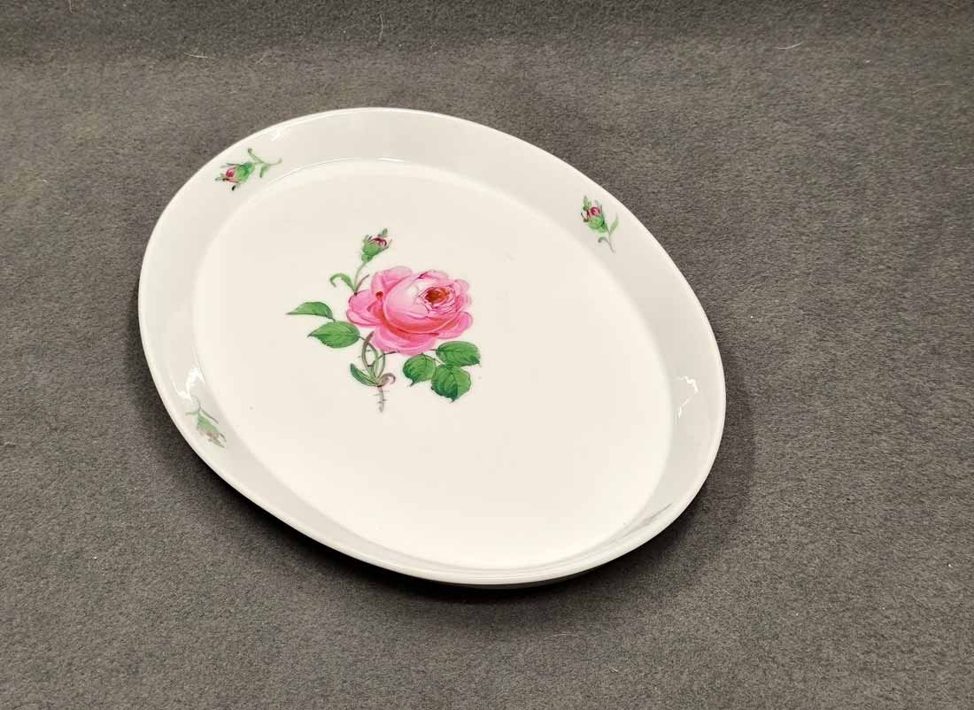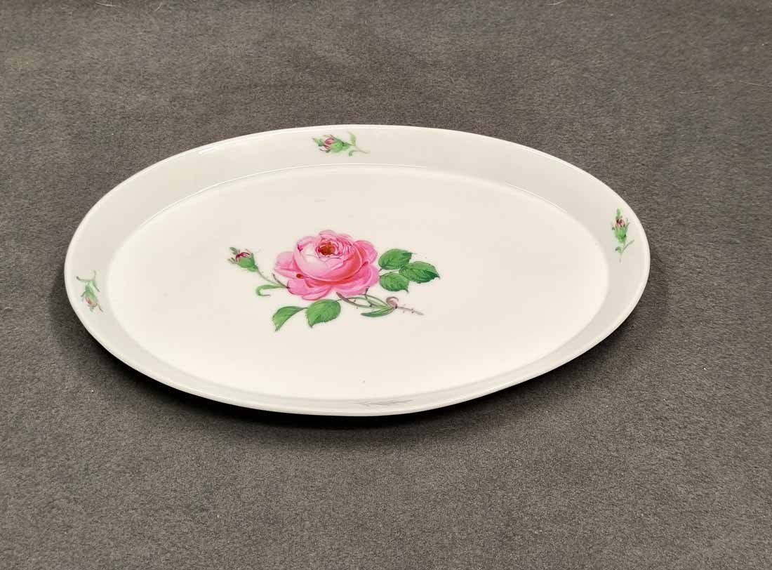 Meissen, Schale oder Tablett, Dekor Rote Rose. Ovale Schale mit Rand, L. x B. 30 x 22 cm, H. 2,5 cm. Sehr guter Zustand ohne Beschädigungen. Herstellungsbedingt der Rand etwas formungenau. Schwertermarke der manufaktur Meissen zwei x gestrichen.