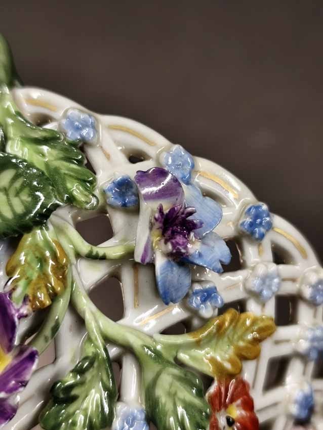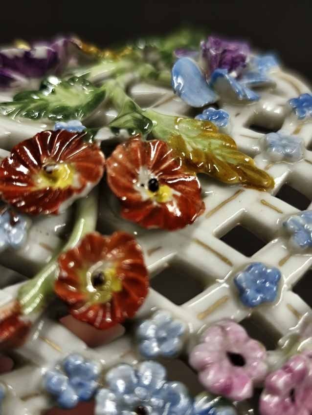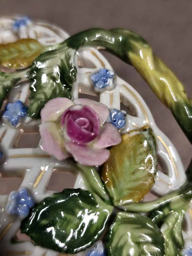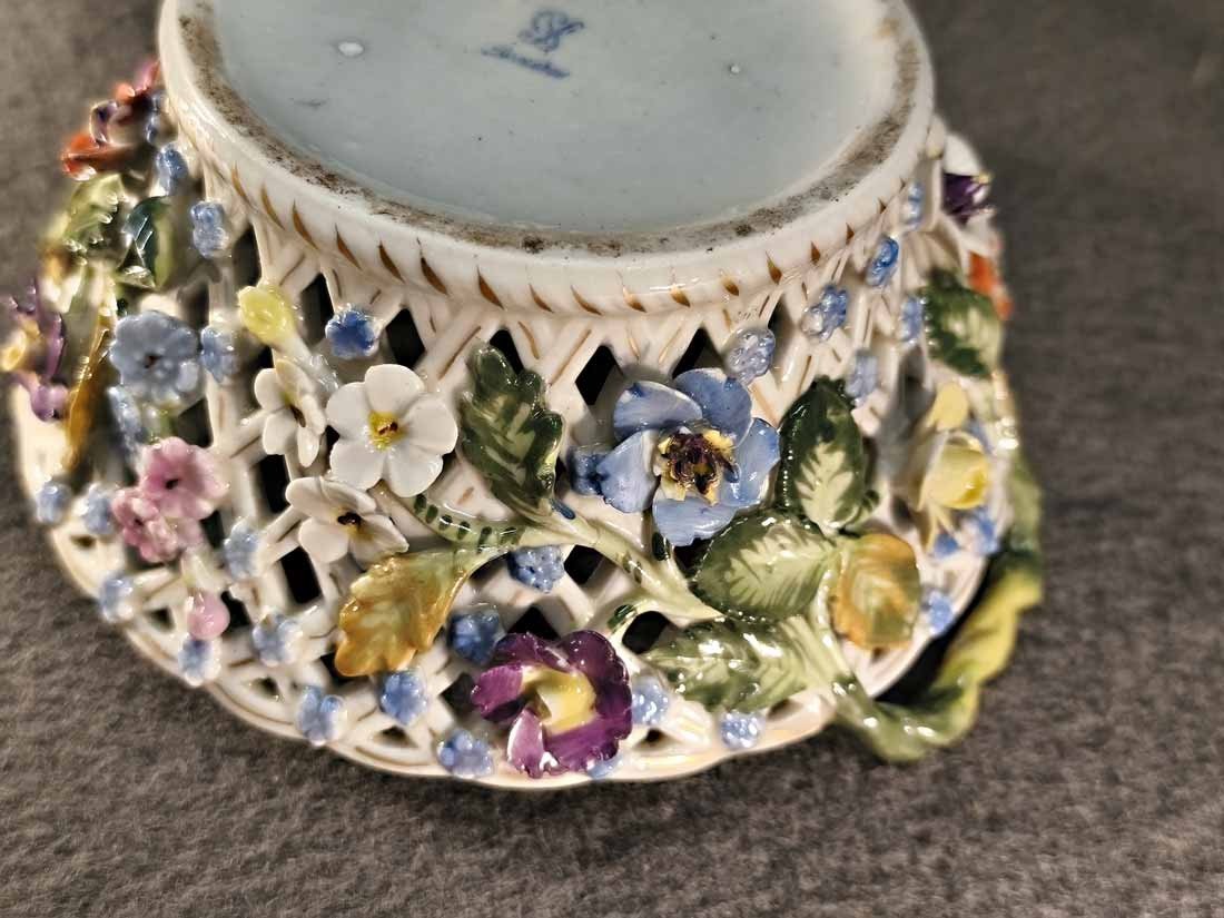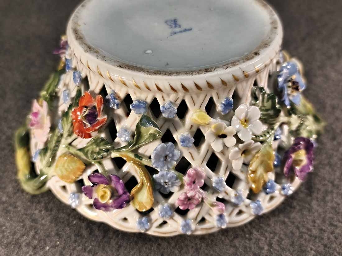 Korbschale mit reichem Blütenbesatz und Blumenmalerei. Sächsische Porzellanmanufaktur Dresden. Guter Zustand, wenige Blüten gering bestoßen, des weiteren ohne Beschädigungen. H. 6,5 cm, D. 13 cm.