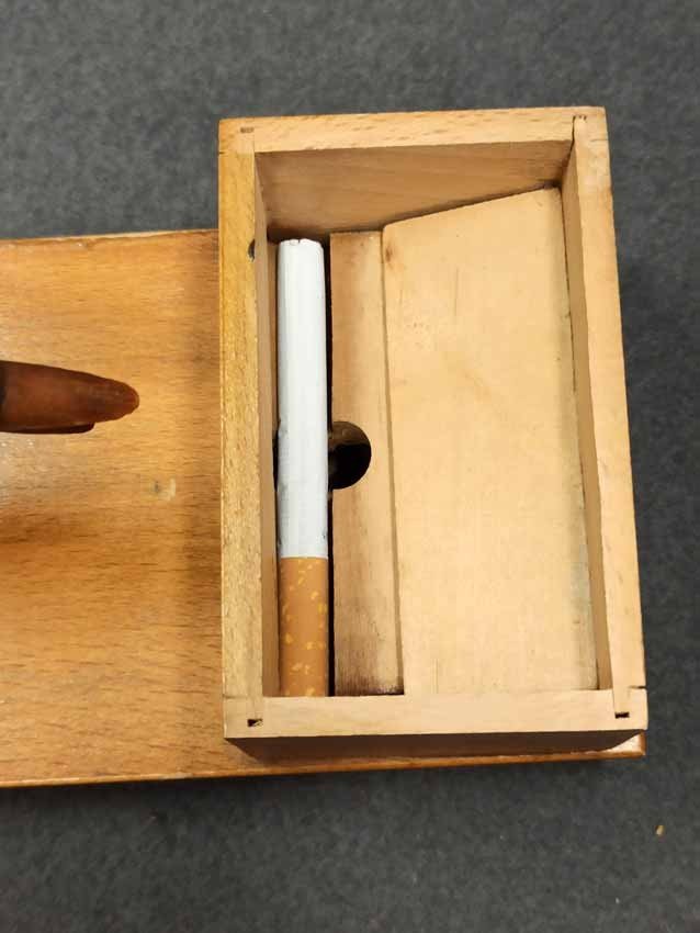 Zigarettenspender Holz mit Pickvogelmechanik. Wer es nicht kennt: Das Kästchen füllt man mit Zigaretten. Wenn man den Vogel nach vorn drückt öffnet sich automatisch der kleine Schubkasten unter dem Vorratsbehälter. In diesem liegt dann eine Zigarette, welche im Schnabel des Vogels präsentiert wird. H. 10 cm, B. 18 cm, T. 10 cm. Guter Zustand mit geringen Gebrauchsspuren, siehe Foto.