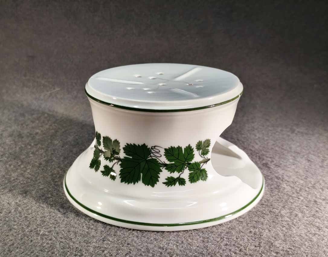 Meissen, Stövchen, Dekor Weinlaub mit Defekt. Risse in der Wärmeplatte verm. durch Temperatur, seitlich ein Haarriss.