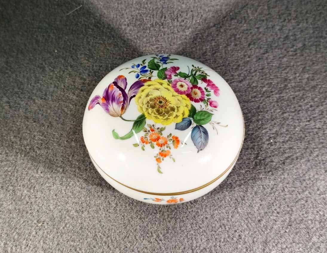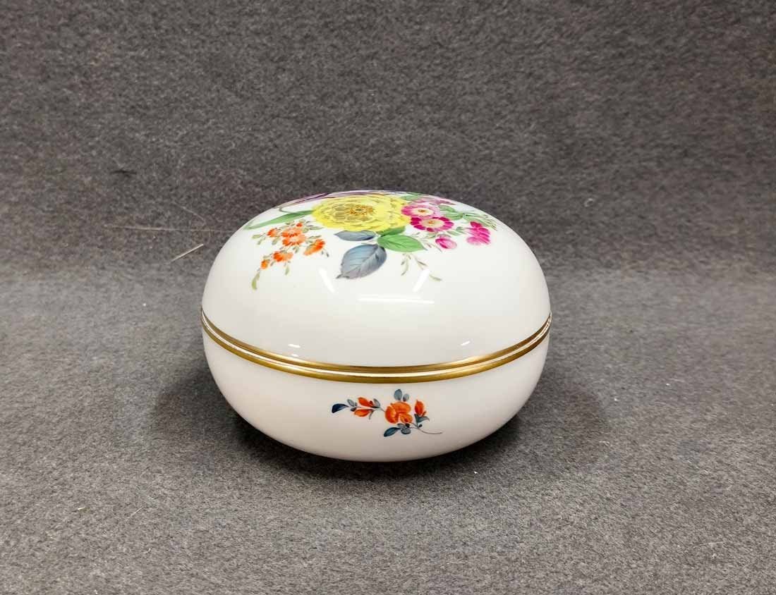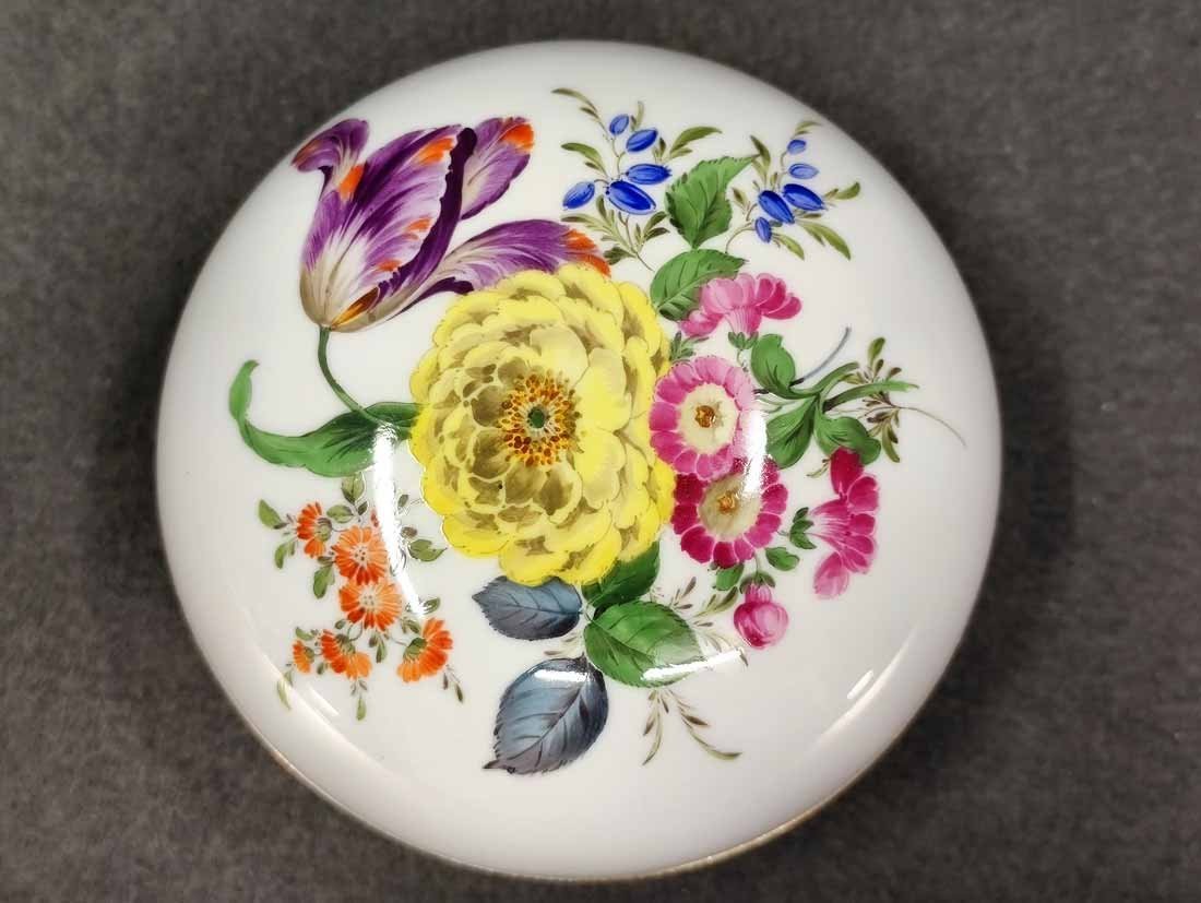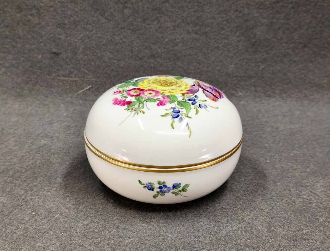 Meissen, große Deckeldose mit reich gemaltem Blumenbukett. D. 12, 5 cm, H. ca 8 cm. Sehr gut erhalten, ohne Beschädigungen. Schwertermarke von Meissen 2x gestrichen.