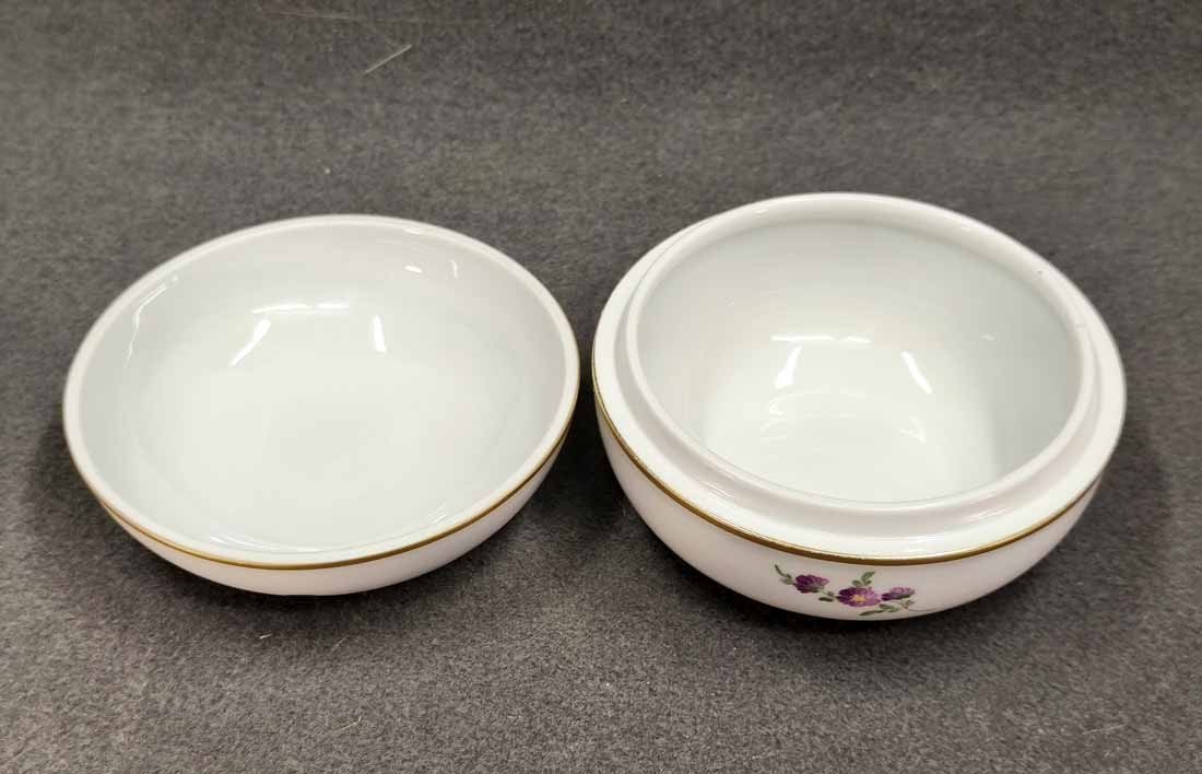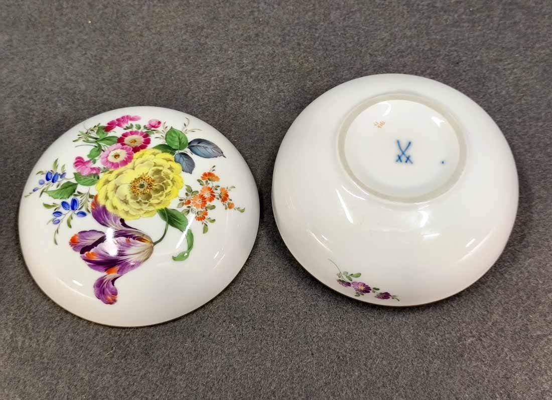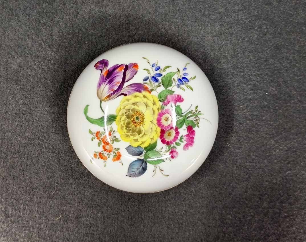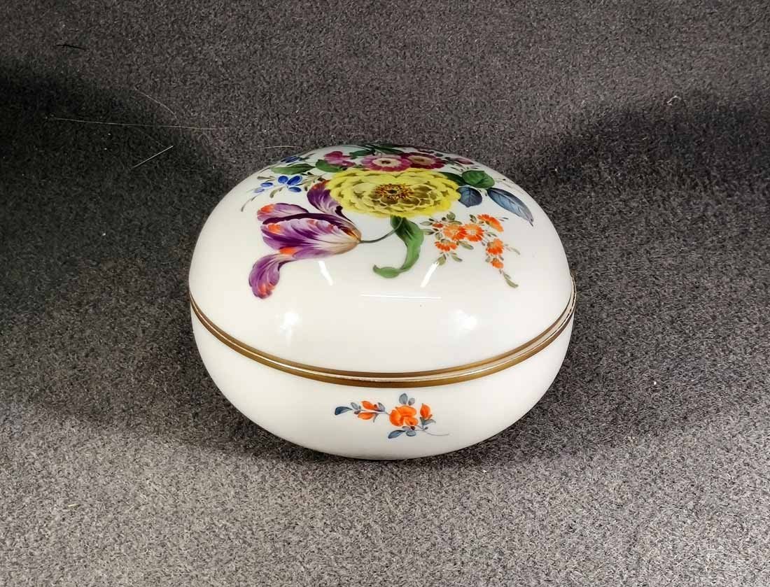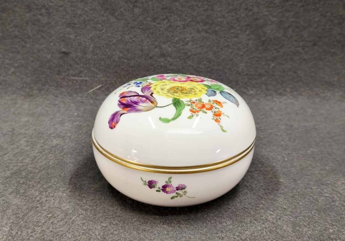 Meissen, große Deckeldose mit reich gemaltem Blumenbukett. D. 12, 5 cm, H. ca 8 cm. Sehr gut erhalten, ohne Beschädigungen. Schwertermarke von Meissen 2x gestrichen.