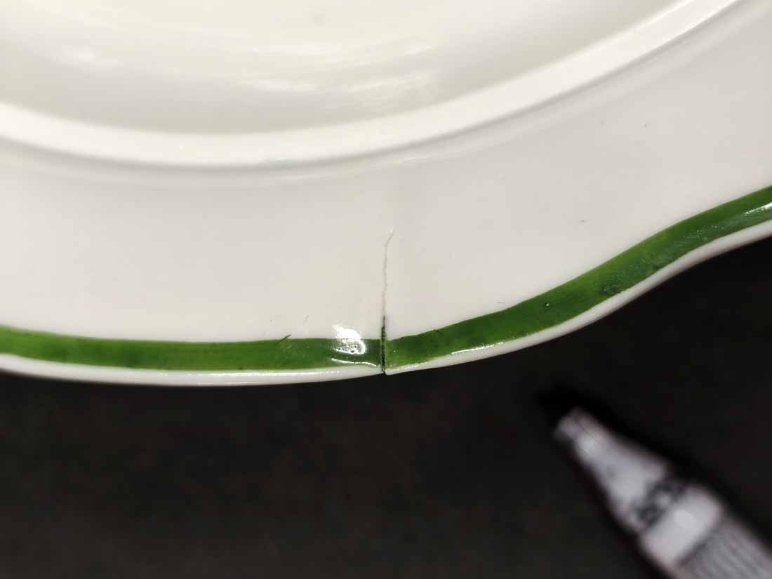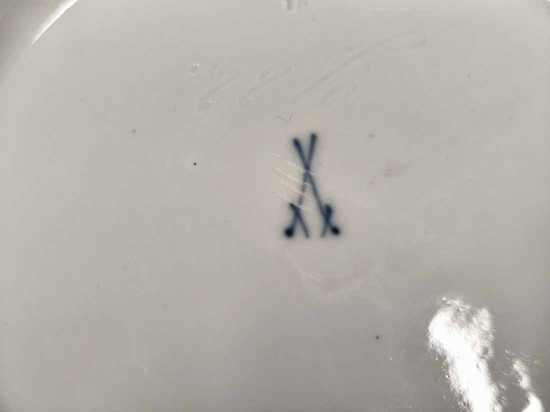 Meissen um 1880, Deckelterrine, Dekor Weinlaub. B. (über Handhaben) 33 cm, D. 27,5 cm, H. ca 17 cm. Sehr guter Zustand ohne Beschädigungen. Am Rand ein herstellungsbedingter Brandriss (Foto). Schwertermarke der Manufaktur Meissen mit Knaufgriffen, um 1900, 4x gestrichen.