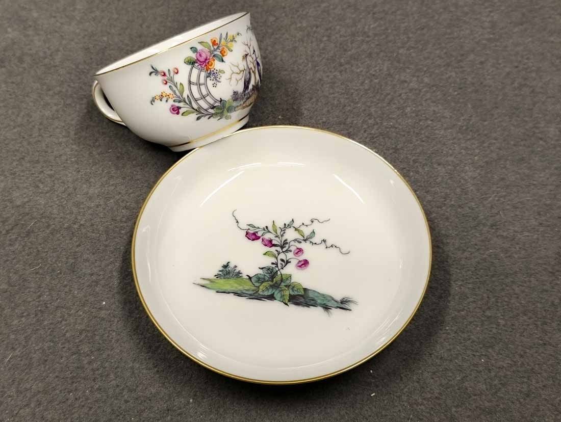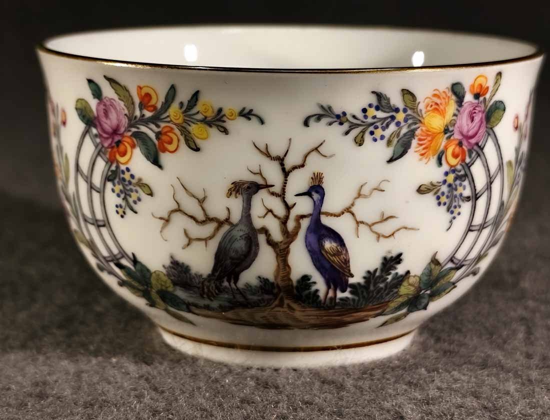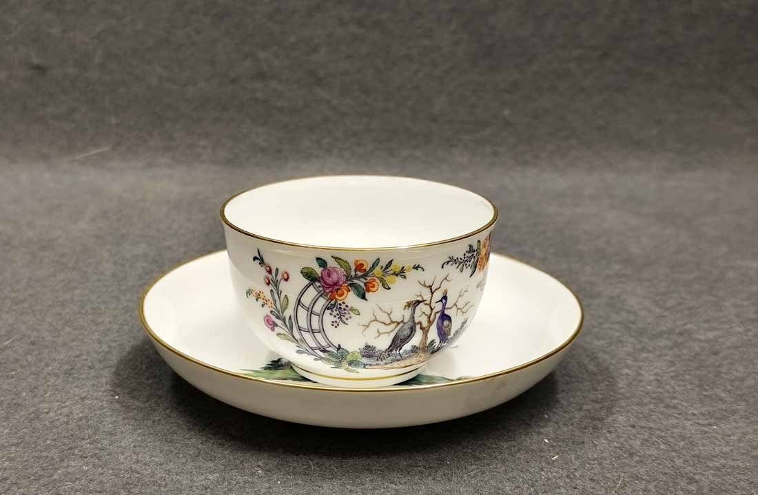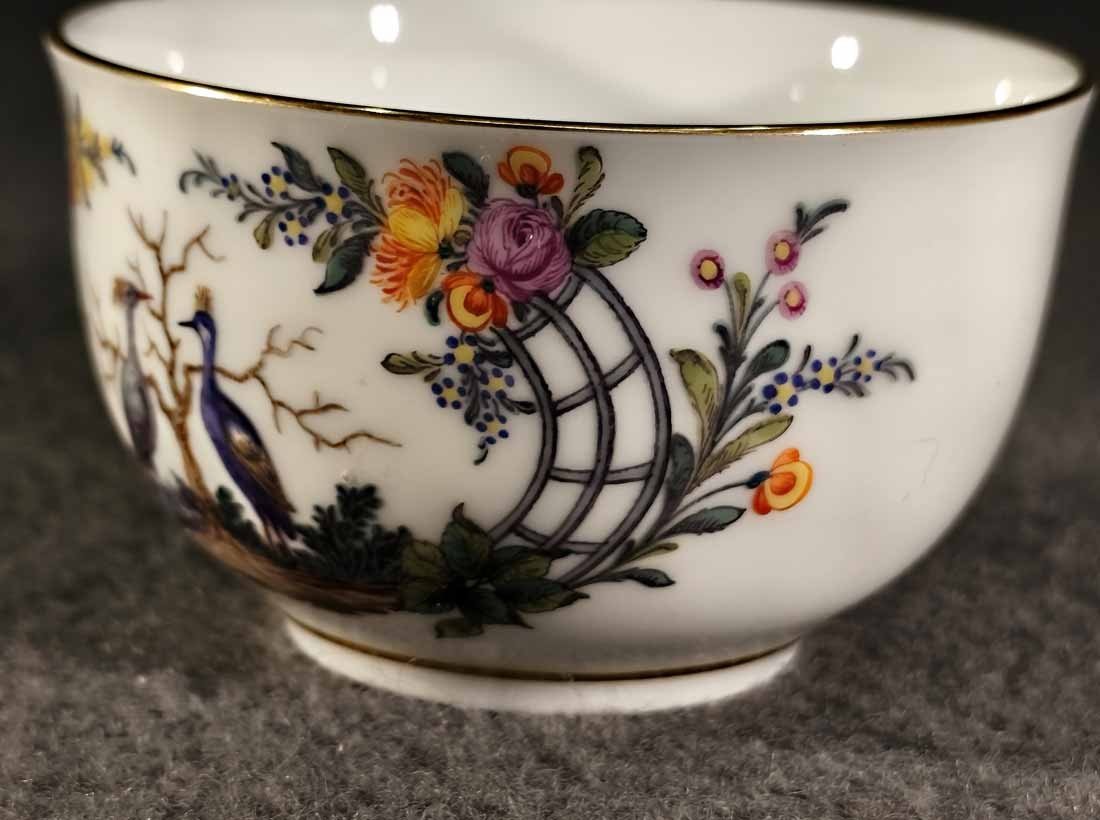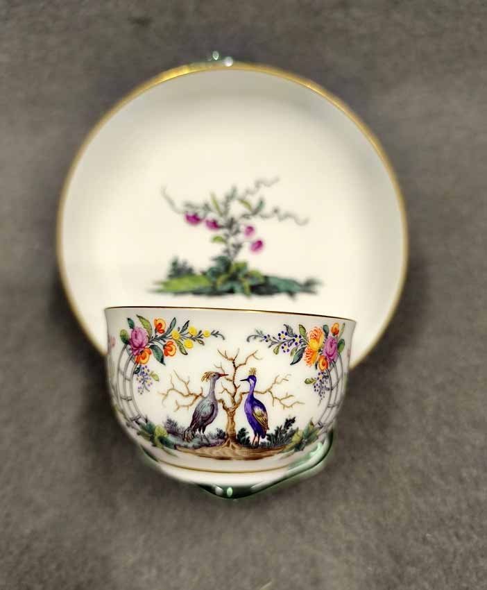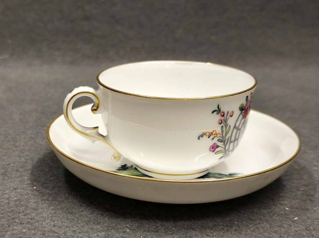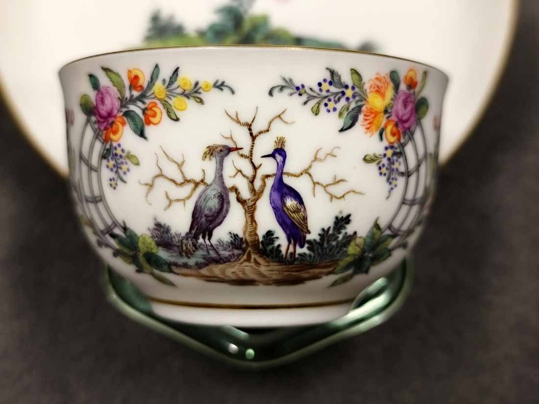 Nymphenburg, Bild- Tasse mit Golddekor; zwei Vögel in Ideal-Landschaft umgeben von Blumenranken. Unterteller mit dezenter Landschaftsmalerei. Sehr guter Zustand ohne Beschädigungen. Tasse D. 7,5 cm, H. 4,6 cm, Untertasse D. 12,5 cm. Am Boden je Wappenmarke von Nymphenburg und versch. Beizeichen (Maler-, Dekor-, Mod.Nr.)