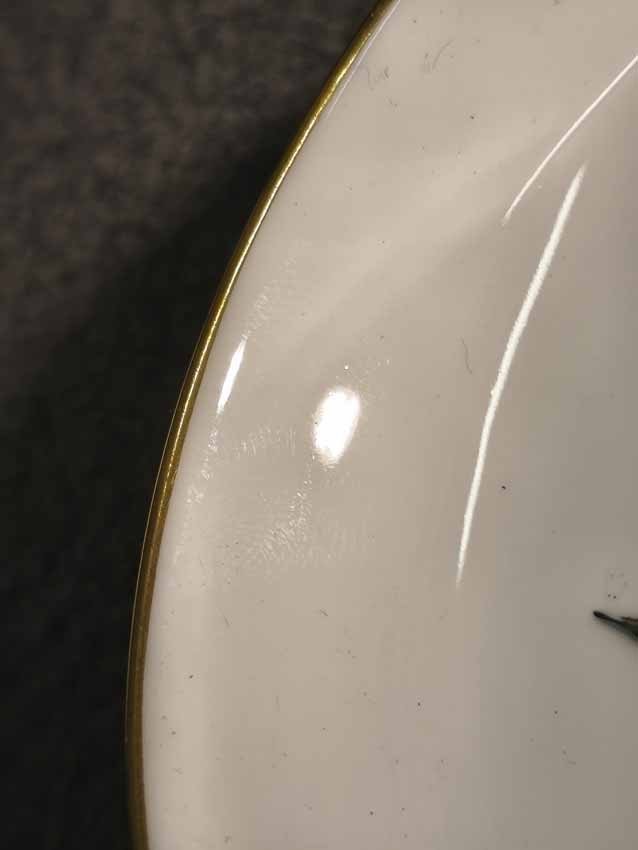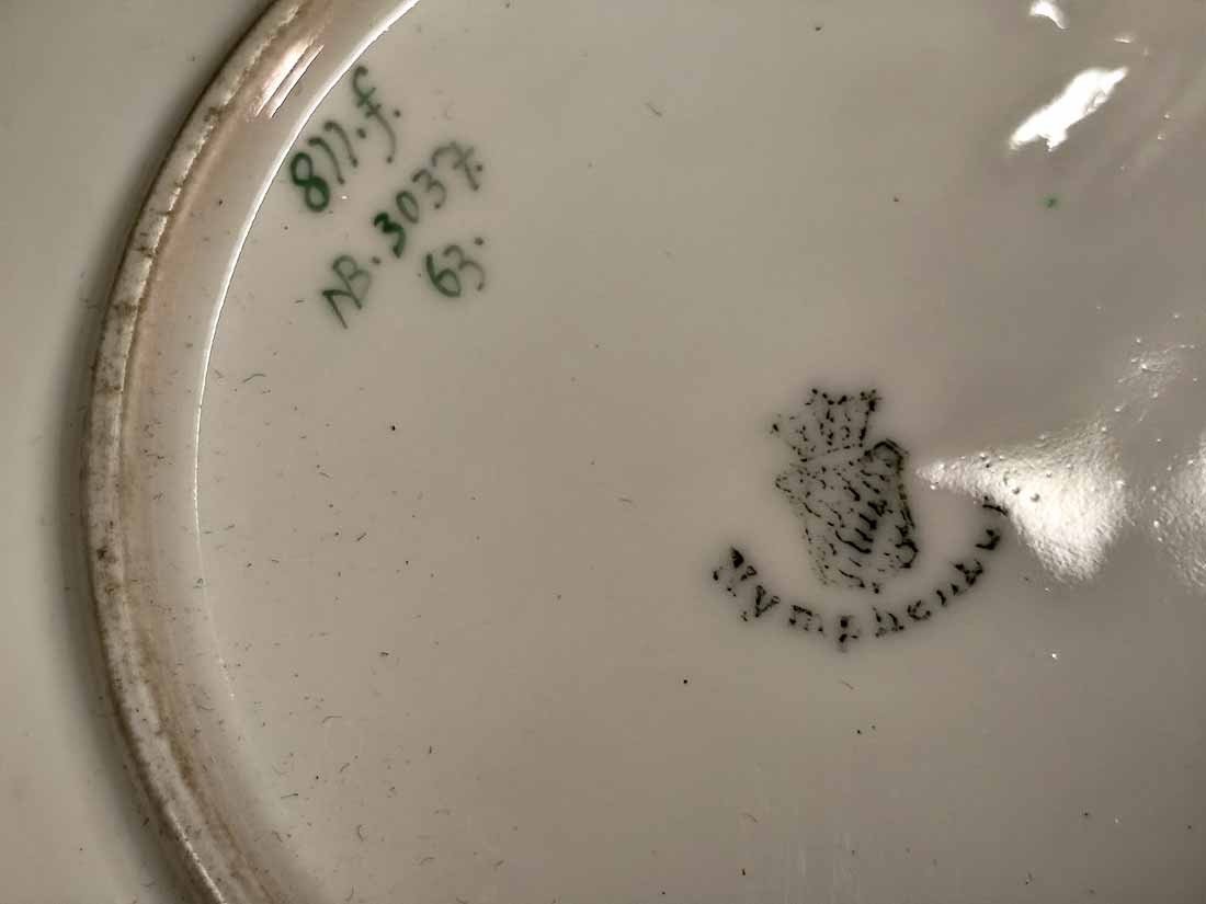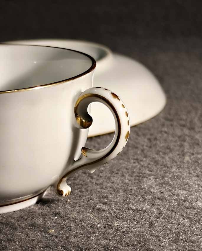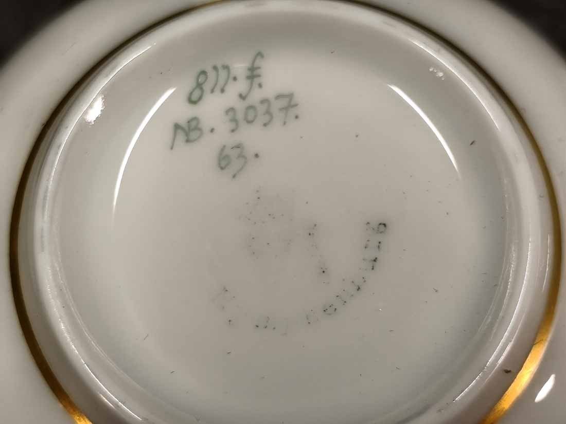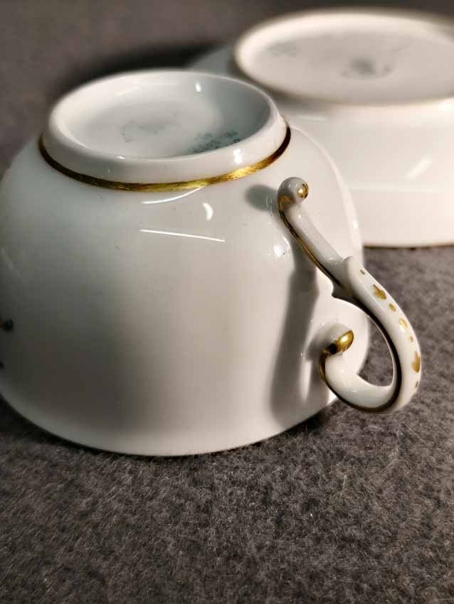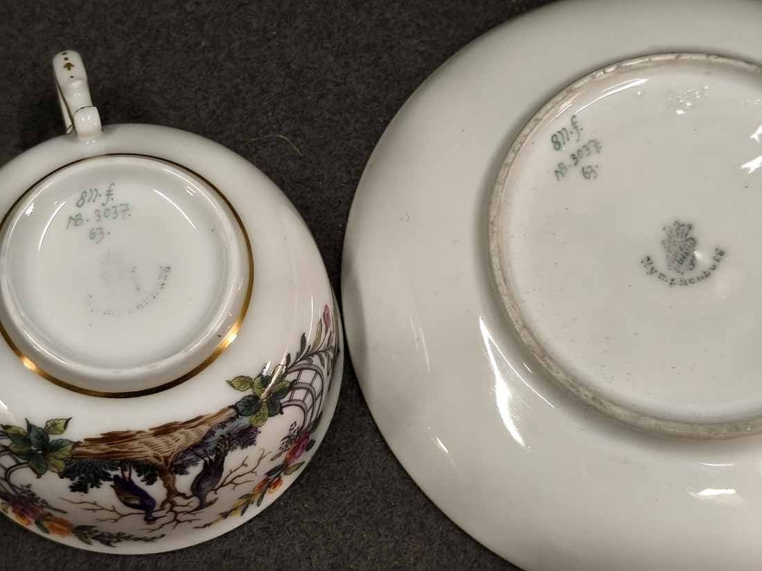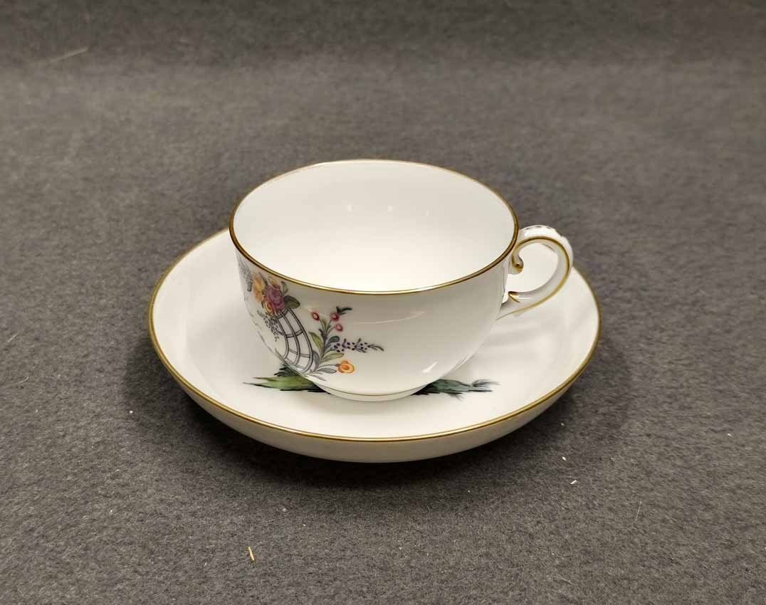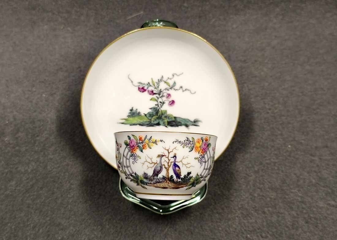Nymphenburg, Bild- Tasse mit Golddekor; zwei Vögel in Ideal-Landschaft umgeben von Blumenranken. Unterteller mit dezenter Landschaftsmalerei. Sehr guter Zustand ohne Beschädigungen. Tasse D. 7,5 cm, H. 4,6 cm, Untertasse D. 12,5 cm. Am Boden je Wappenmarke von Nymphenburg und versch. Beizeichen (Maler-, Dekor-, Mod.Nr.)