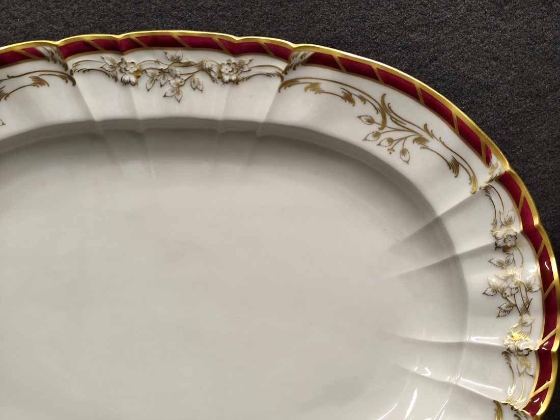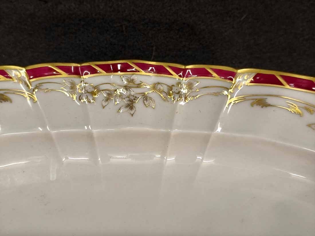 KPM Berlin, Große ovale Vorlegeplatte L. 42 cm. Königin von Holland, Rocaille Rot. Sehr guter Zustand ohne Beschädigungen oder Gebrauchsspuren. Kein Farb- oder Goldabrieb. Zeptermarke der KPM Berlin mit Reichsapfel rot. L. 42 cm, B. 30,5 cm, H. 5,5 cm.