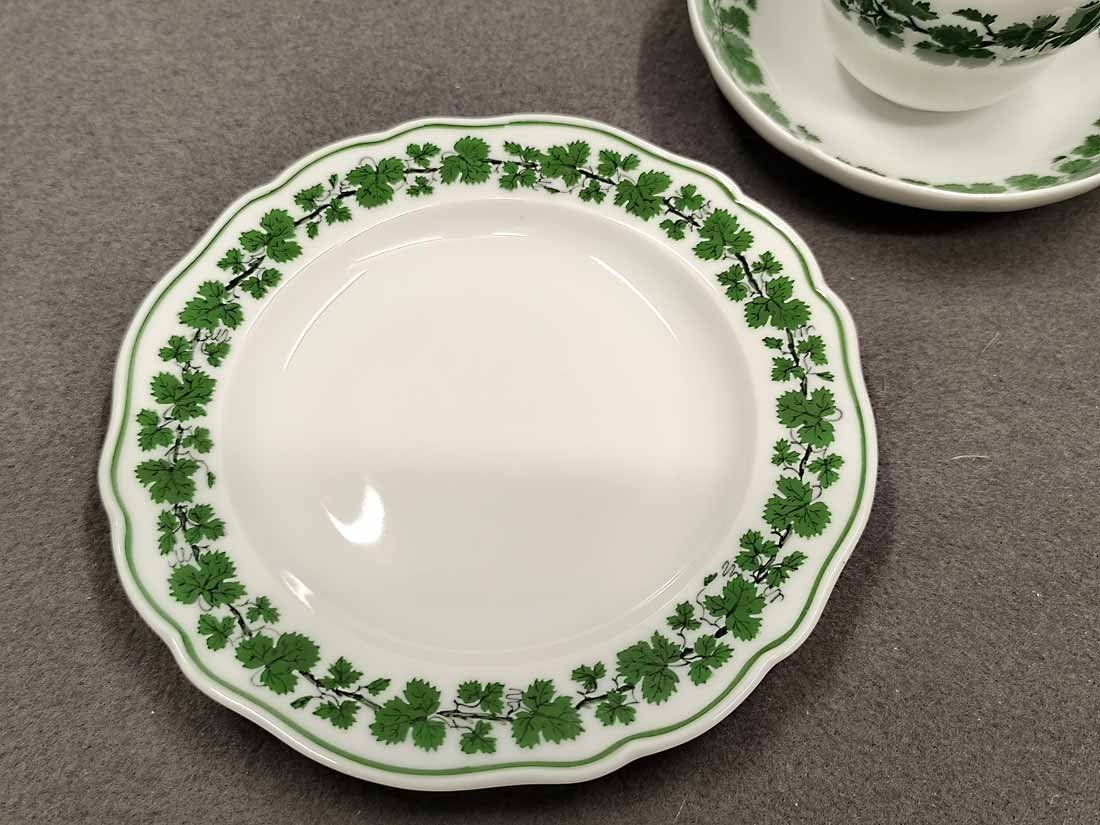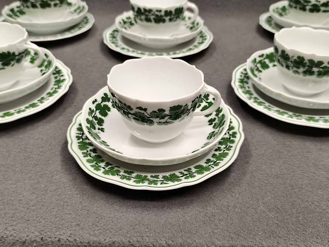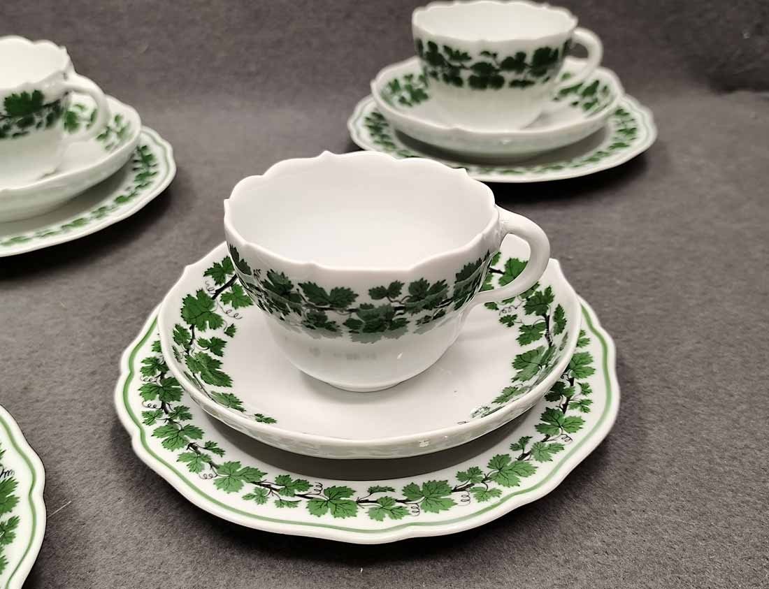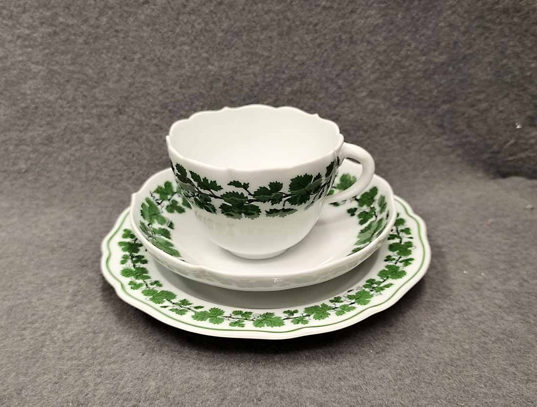 Meissen, Weinlaub. 6 Gedecke, 3 teilig, bestehend aus Tasse mit Untertasse und Kuchenteller. 1. Wahl, Knaufzeit um 1900. Sehr guter Zustand ohne Beschädigungen, keine Chips, Risse oder Abplatzer. Malerei tadellos. Schwertermarke der Manufaktur Meissen mit Knaufgriffen  um 1900 ohne Schleifstriche 1. Wahl. Maße ca: Tasse H. 6,5 cm, D. 8,5 cm, Untertasse D.14 cm, H. 3,5 cm, Kuchenteller D. 17,5 cm.