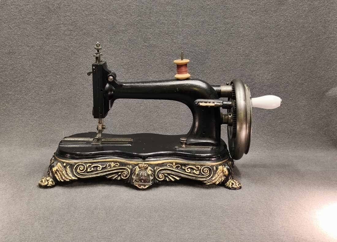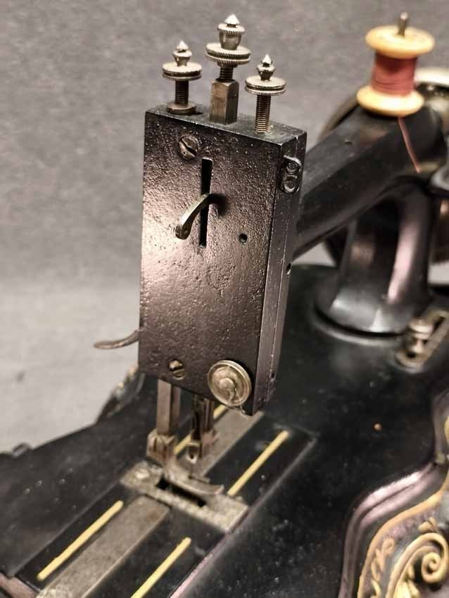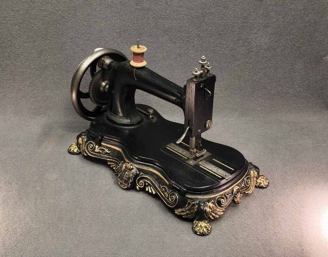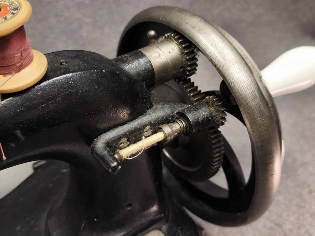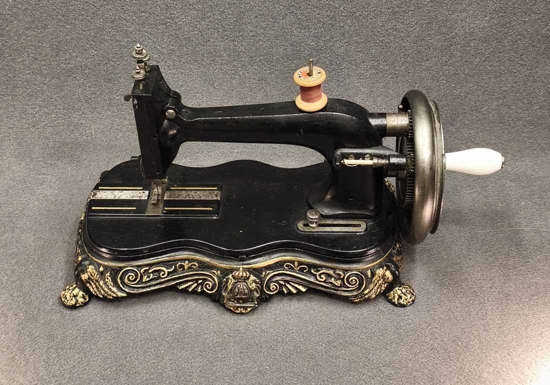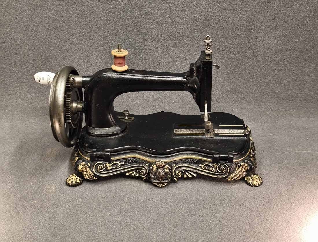 Handkurbel Nähmaschine um 1900. Guter Zustand. Die Mechanik funktioniert, alles bewegt sich gut. L. x B. 38 x 20 cm, H. ca 25 cm.