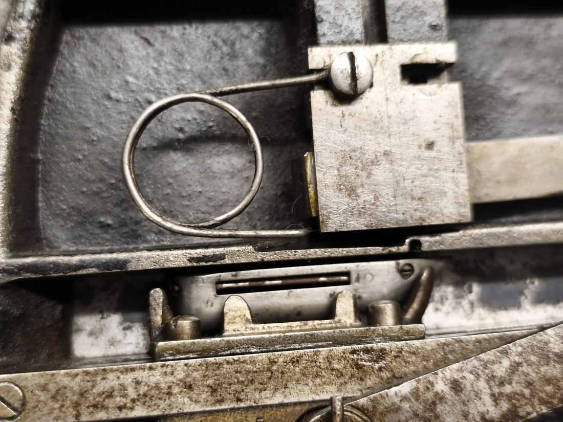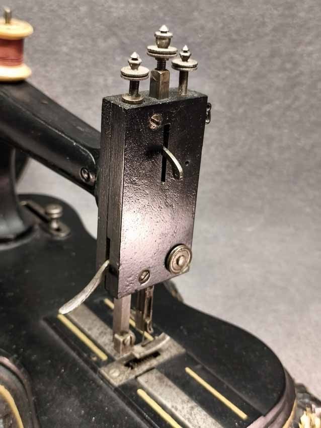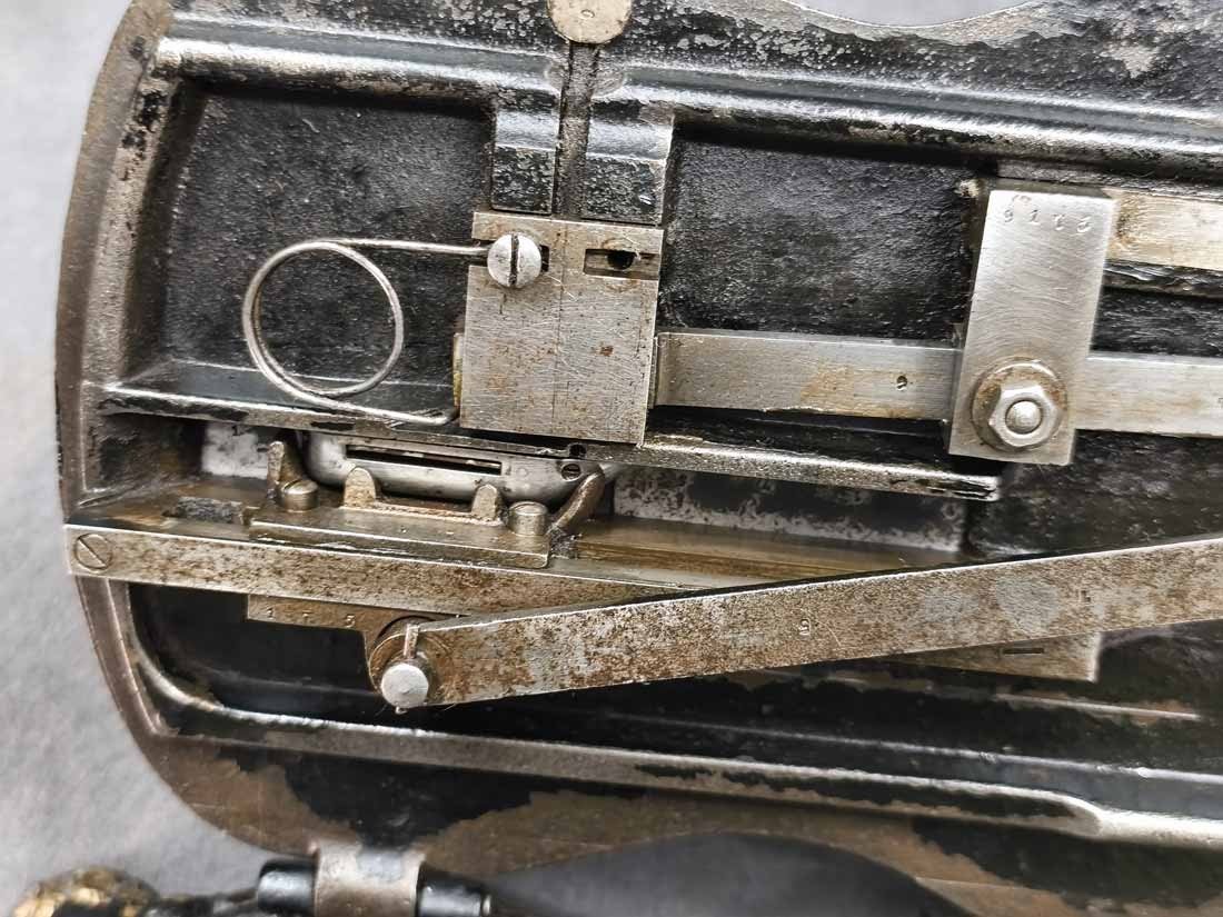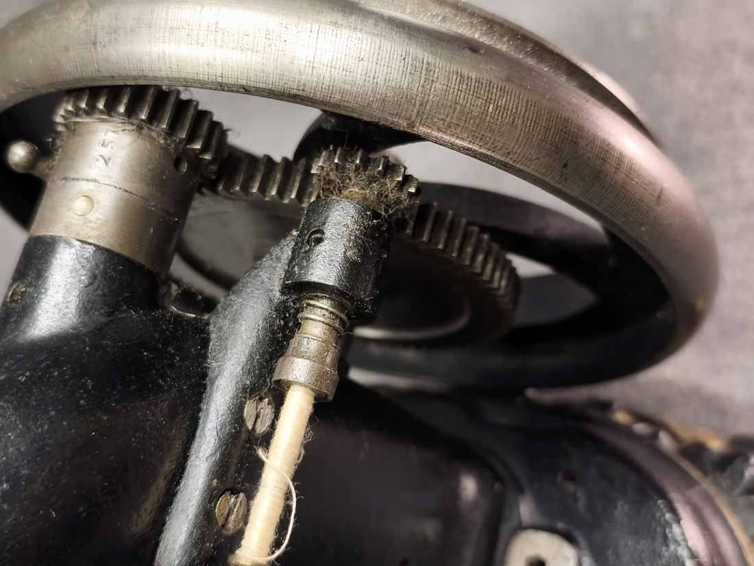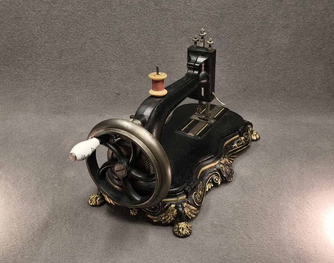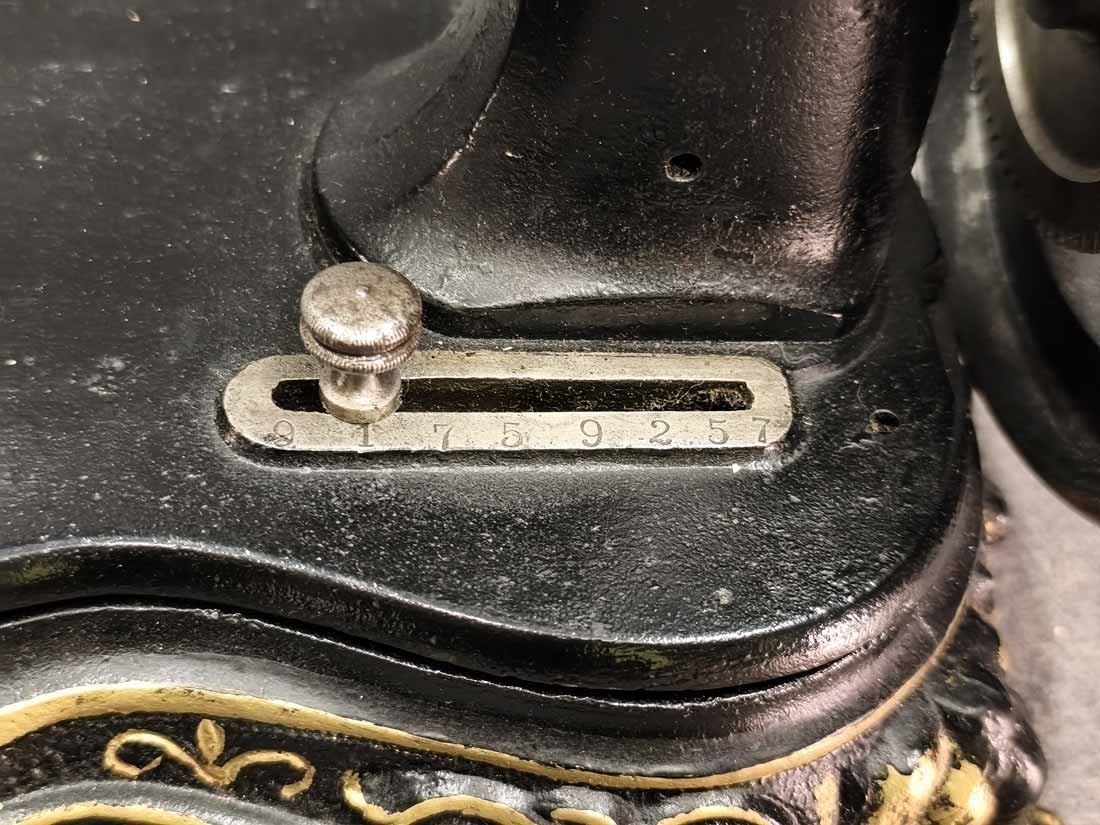 Handkurbel Nähmaschine um 1900. Guter Zustand. Die Mechanik funktioniert, alles bewegt sich gut. L. x B. 38 x 20 cm, H. ca 25 cm.