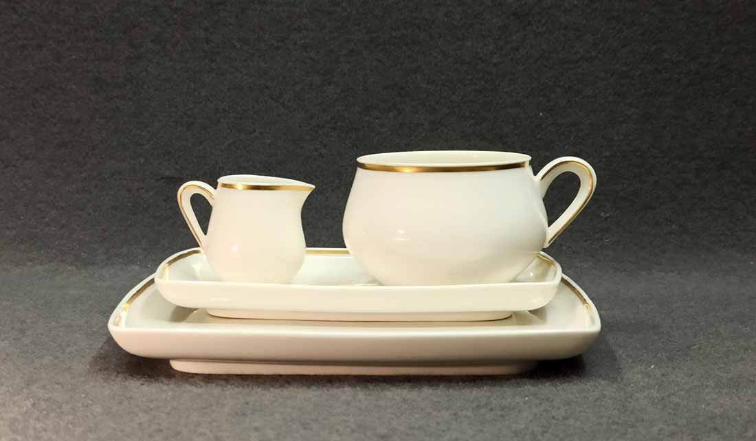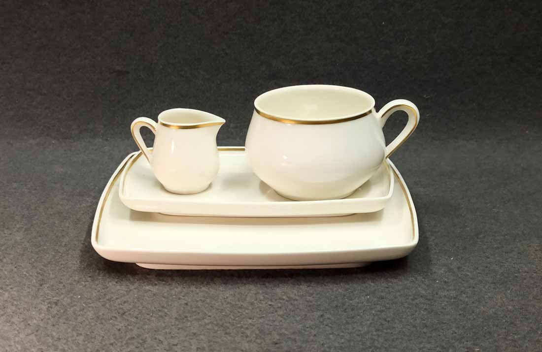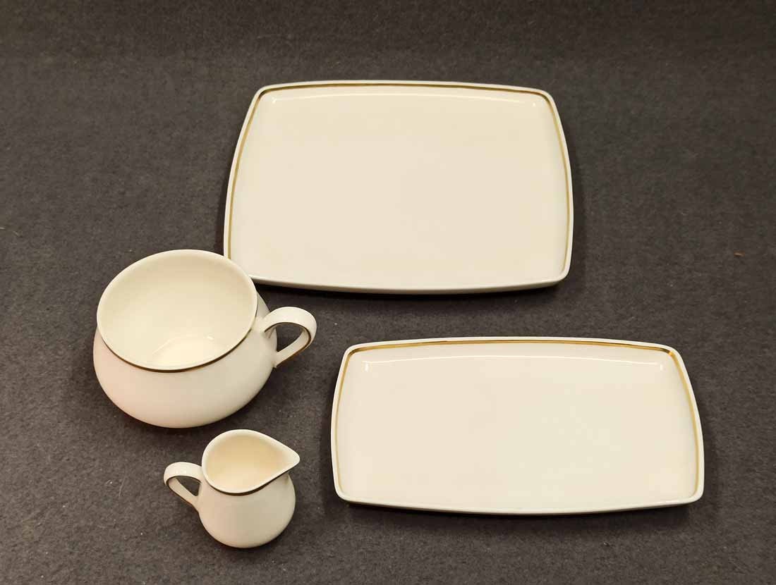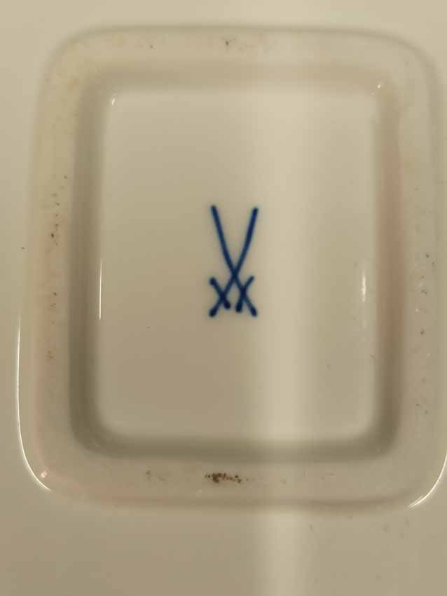 Meissen, seltenes Gedeck bestehend aus Tasse, Untertasse, Teller und Milchkännchen. Untertasse und Teller rechteckig. Der Scherben leicht beige und die Glasur des Milchkännchens tw. craqueliert. Tasse H. 5 cm, Unterteller  9,5 x 16 cm, Teller 16 x 18 cm. 1. Wahl, Schwertermarke der Manufaktur Meissen ohne Schleifstriche.