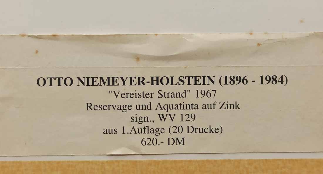 Niemeyer-Holstein, Otto; 1896-1984. "Vereister Strand"  Aquatinta auf Zink, u.re. monogramiert. "ONH". WV 129.  Abb. ca 25 x 32 cm, Ra. 46,5 x 53 cm.
