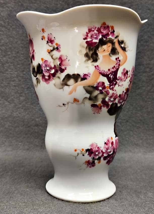 Vase, "Blütenmädchen", verm. Entwurf Heinz Werner für Wallendorf. Ungemarkt, Pressnummer 427. In der Literatur findet man diese Vase mit Wallendorf Marke und Zuschreibung Heinz Werner. Die Zuschreibung an Heinz Werner ist bei der Betrachtung des Dekor unbestritten plausibel. H. 22 cm. Sehr guter Zustand.