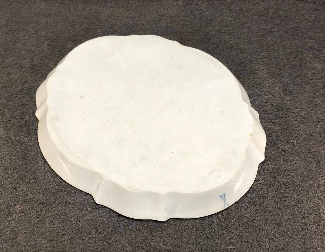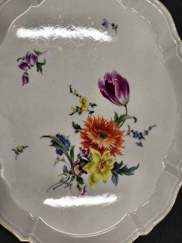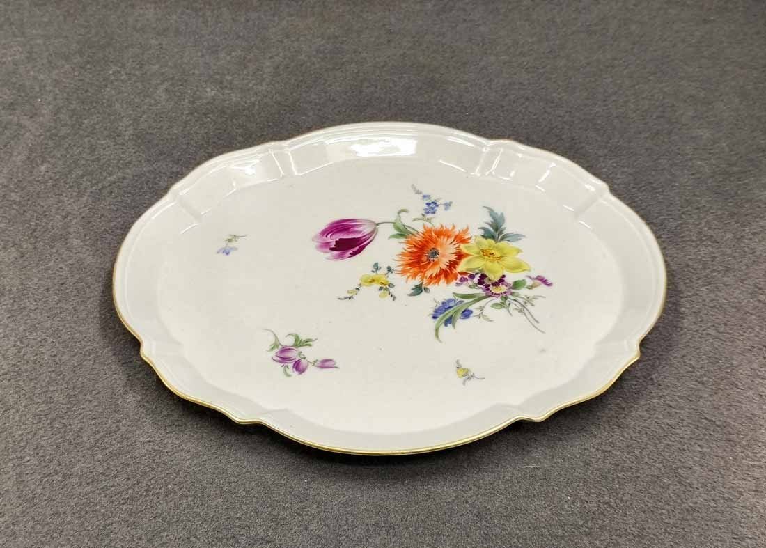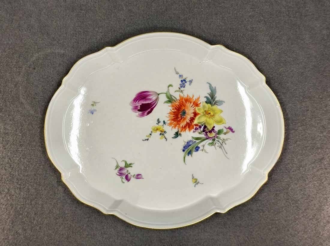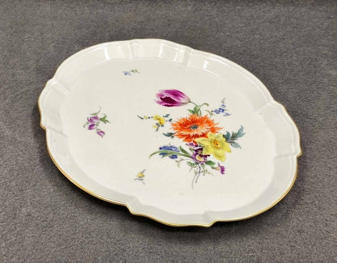 Manufaktur Meissen, Schale oder Tablett mit Blumenmalerei und Goldrand. Geschwungen ovale Platte mit kleinem Rand. L. x B. 28 x 23 cm, H. 2,3 cm. Sehr guter Zustand ohne Beschädigungen. Schwertermarke der Manufaktur Meissen 2x gestrichen.