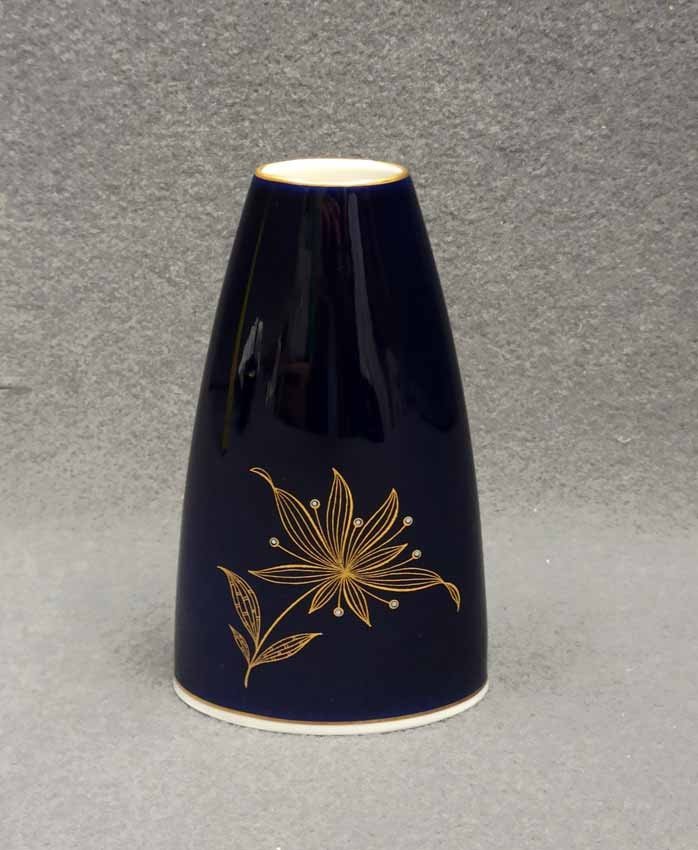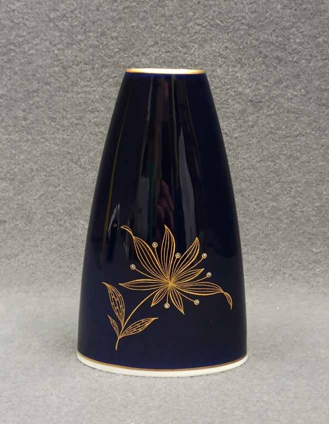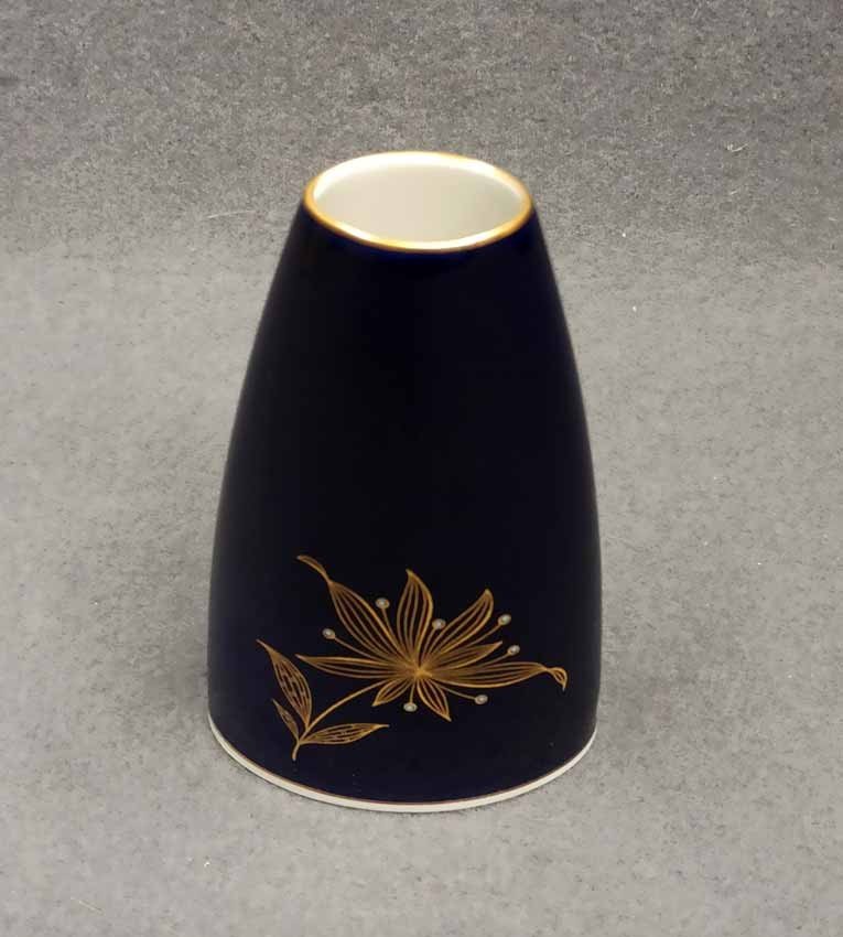 Vase, kobaltblau mit Golddekor, Thüringen, Weimar Porzellan um 1960. Sehr guter Zustand, H. 15,5 cm.