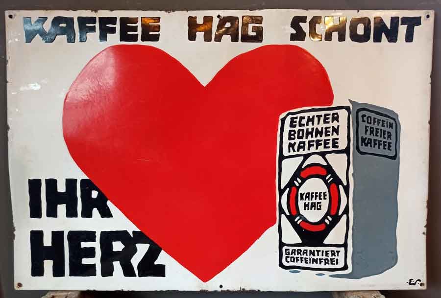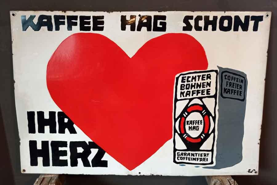 Reklameschild "Kaffee Hag schont ihr Herz" Email auf gewölbter Metallplatte.  Entwurf von Eduard Scotland für Kaffee Hag.