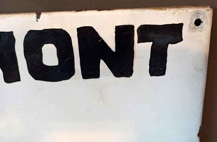 Guter Zustand mit Altersspuren. Am Rand und den Ecken partiell bestoßen. Alte Restaurierungen in der Fläche, kleinflächig. Dekoratives Schild in gutem Zustand.