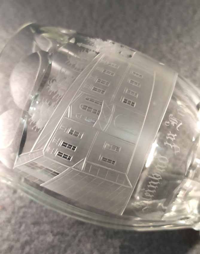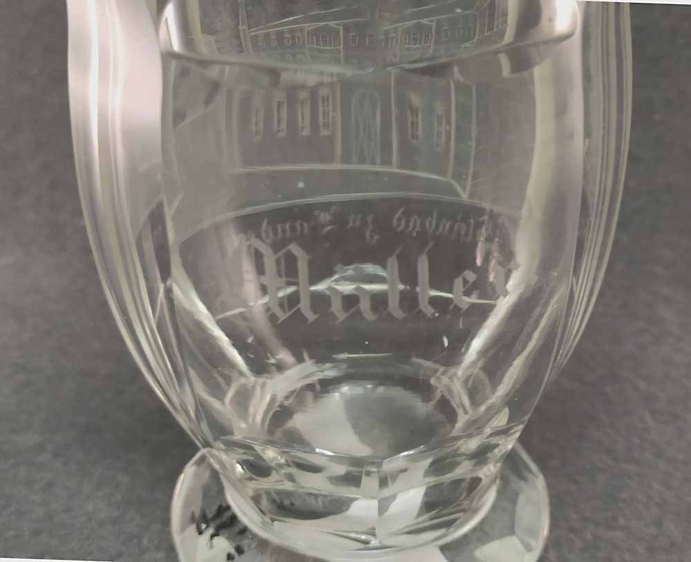 Becher Biedermeier 1.Hälfte 19. Jh. Transparentes Glas mit geschnittener Ansicht von Steinbad zu Landeck. Rs. bezeichnet "Müller". Altes Sammleretikett am Boden. Sehr guter Zustand ohne Beschädigungen. H. 12 cm, D. 7,5 cm.
