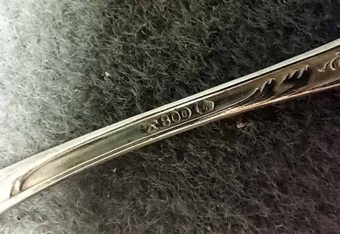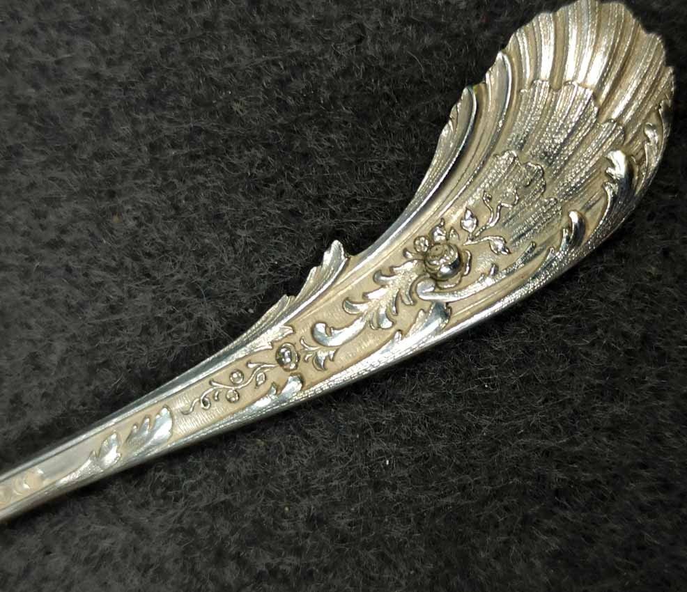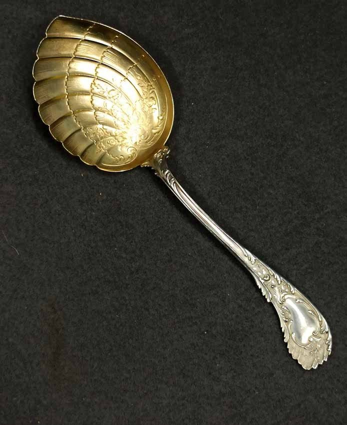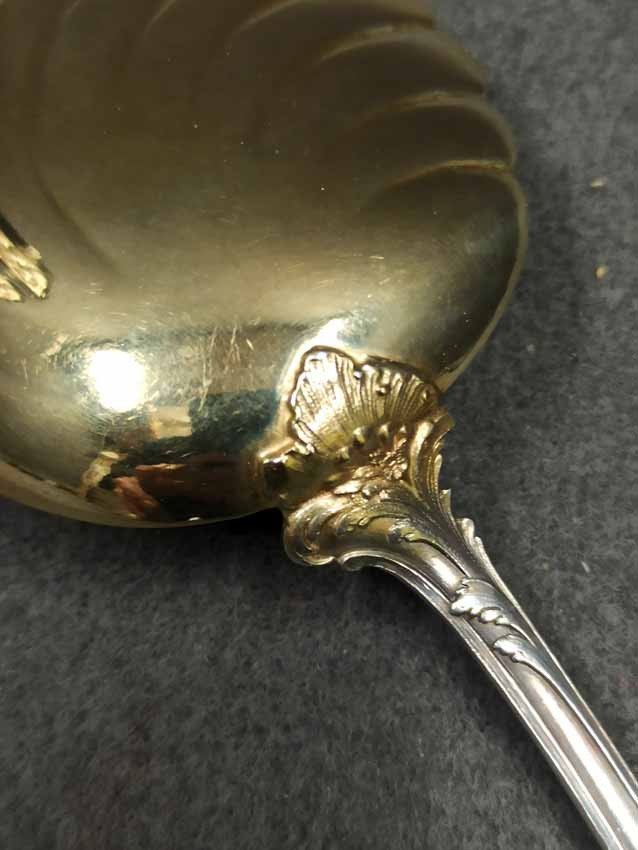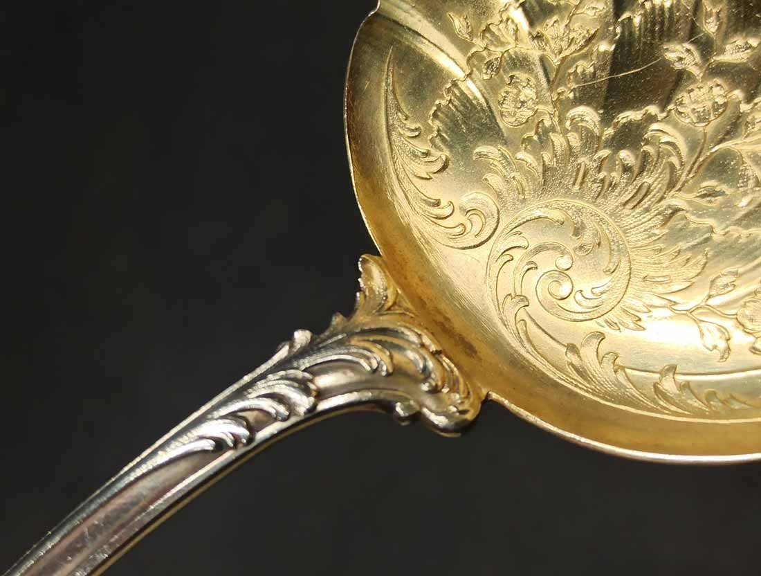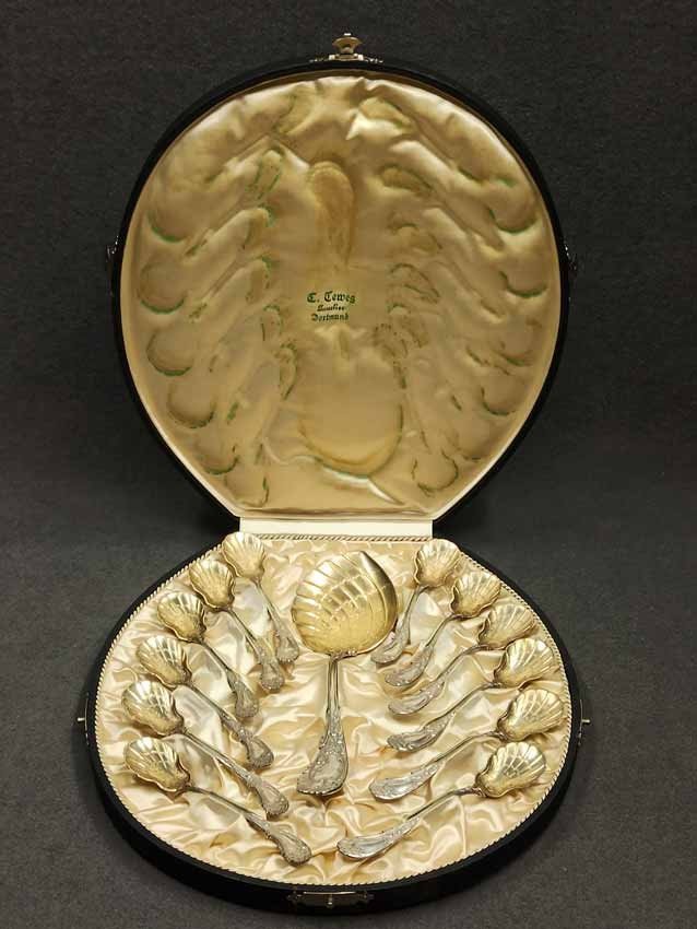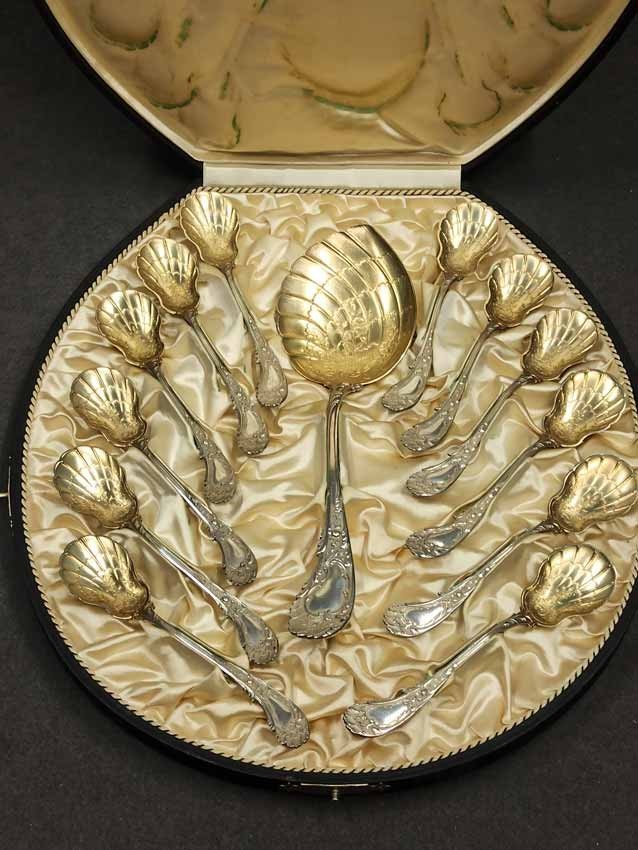 13x Silberlöffel Silber 800er um 1880; 1x großer Sahne- bzw. Vorlegelöffel und 12 Dessertlöffel, Historismus; Laffe als stilisierte Muschel, Griffe fein gestaltet. Laffe vergoldet. Fein ziseliert und zeittypisch gestaltet. Im original Etui. Sehr guter Zustand. Sahnelöffel L. 22 cm (88g), Dessertlöffel L.13 cm (21g), Ges. Gew. ca 340 g. Jeweils gestempelt: "Mond, Krone und 800".
