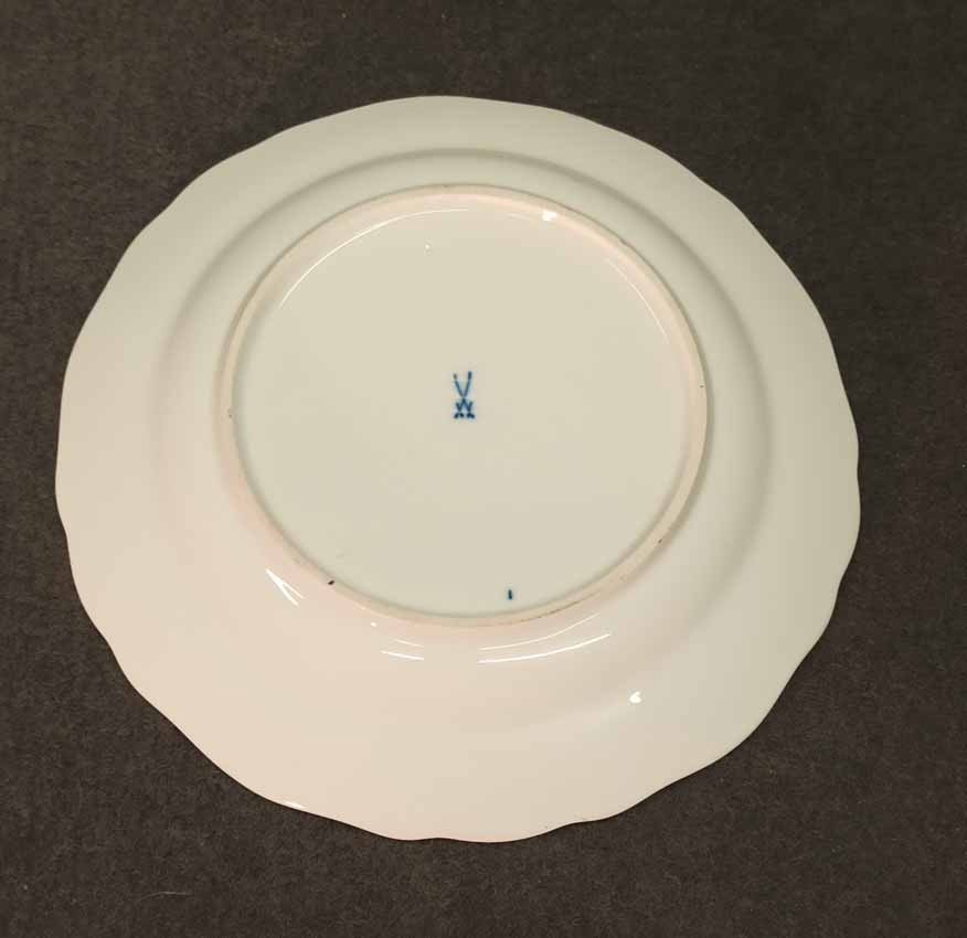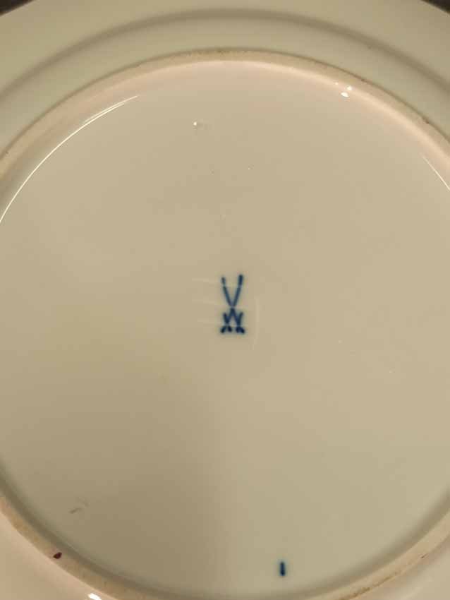 Meissen, Teller Indisch Purpur mit Gold. D. 18 cm. Zustand ohne Beschädigungen. Schwertermarke der Manufaktur Meissen 3x gestrichen, 1x neben den Schwertern.