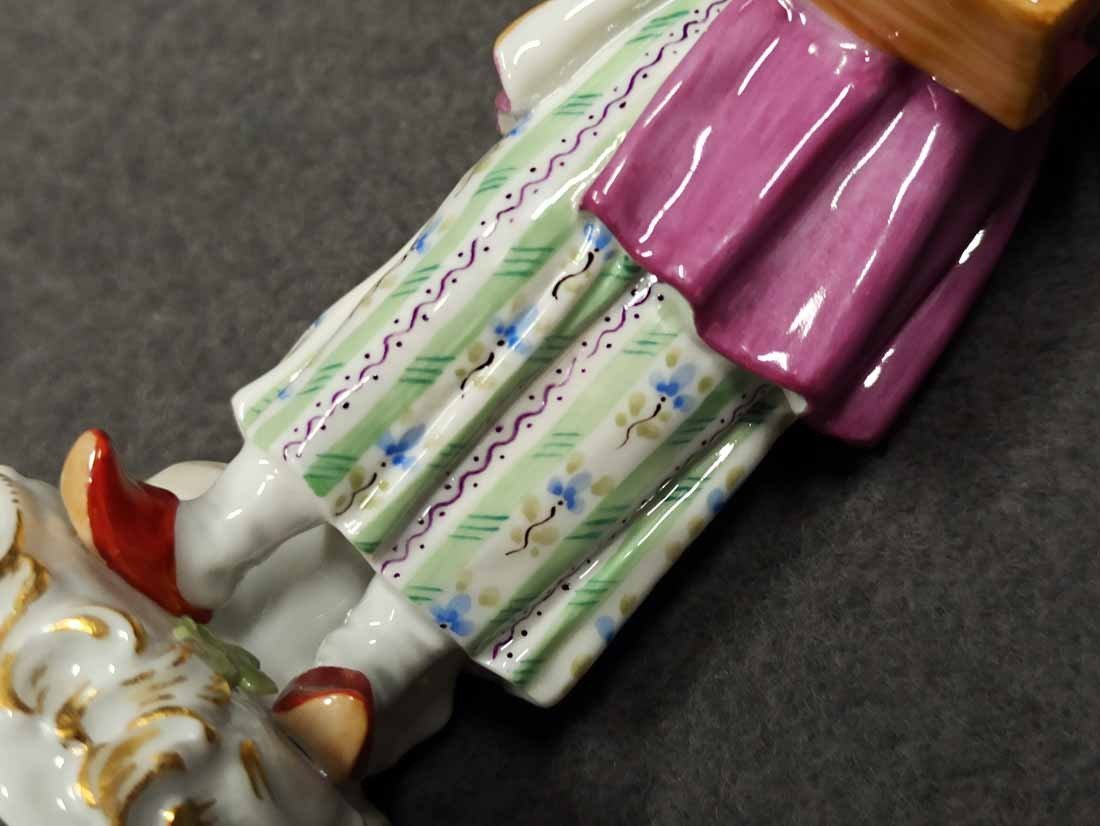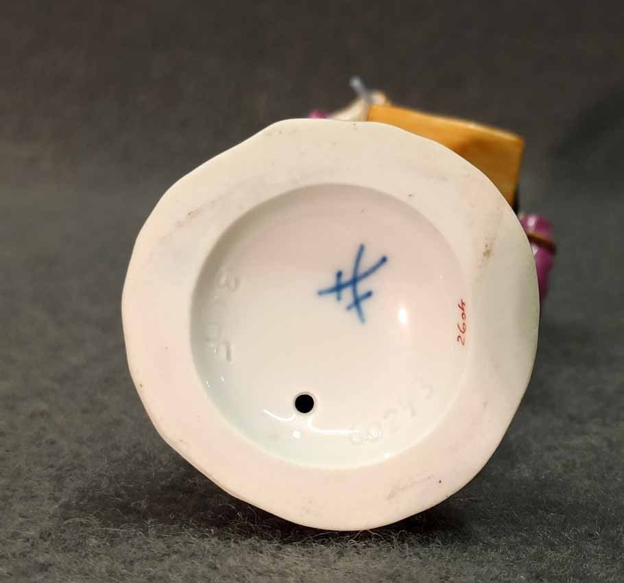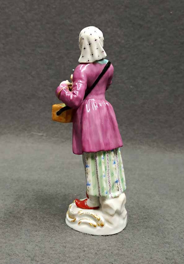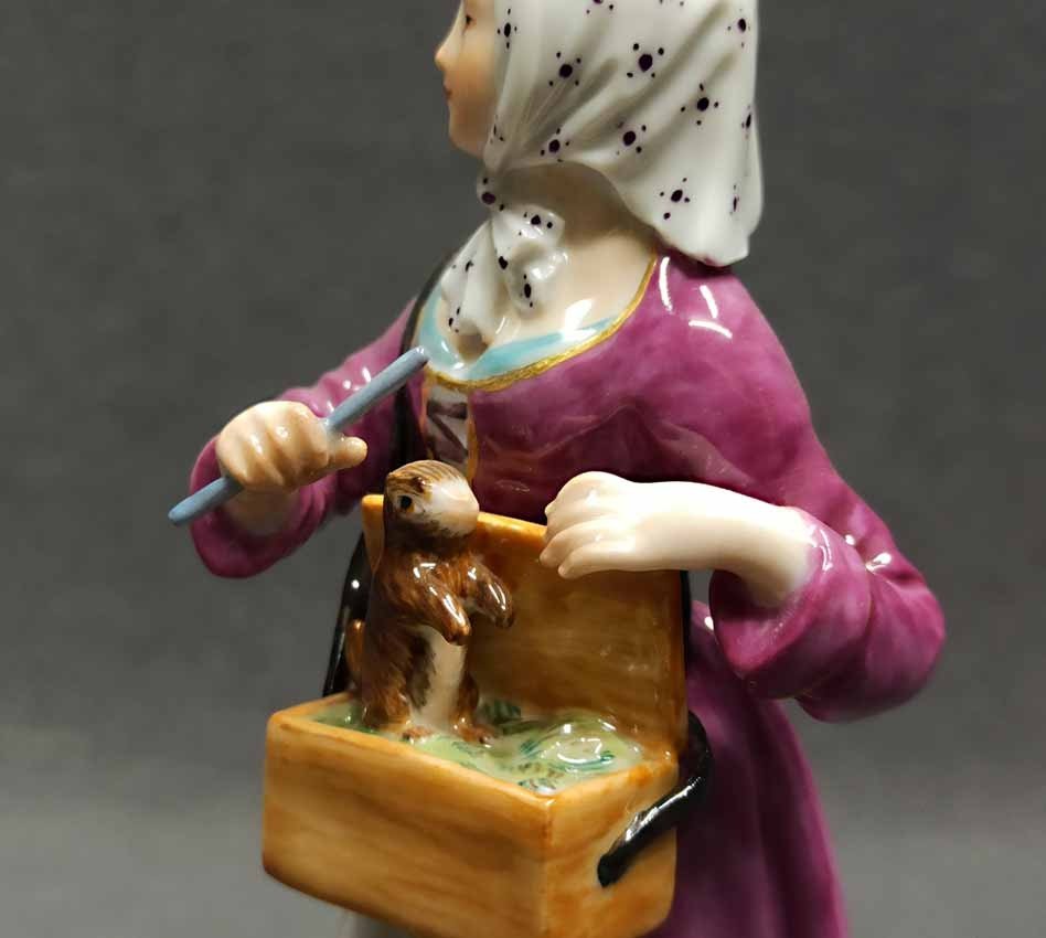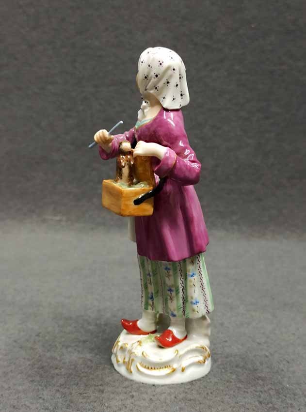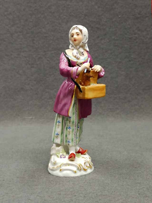 Meissen, "Frau mit Murmeltier", aus der Serie der Pariser Ausrufer bzw. Chris de Paris. Entwurf: Johann Joachim Kaendler im 18.Jh. hier Ausformung vom Ende des letzten Jh. H. 14 cm, Mod.Nr 60243. Sehr guter Zustand ohne Beschädigungen, keine Restaurierungen. Schwertermarke der Manufaktur Meissen ohne Schleifstriche, 1. Wahl.