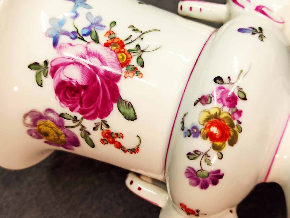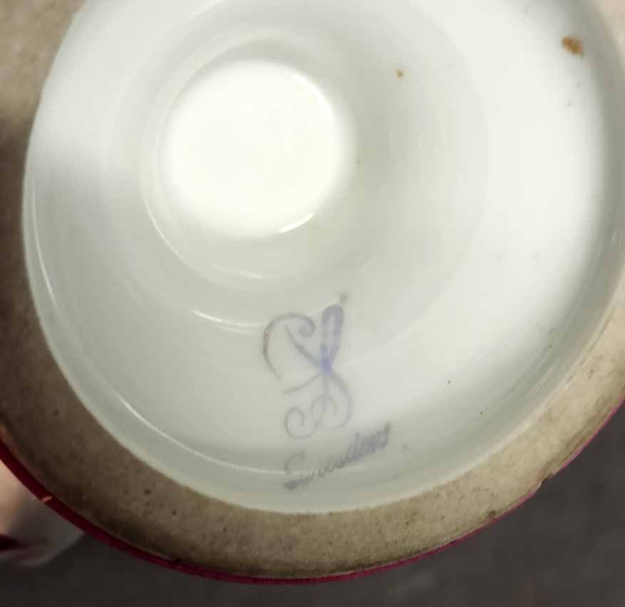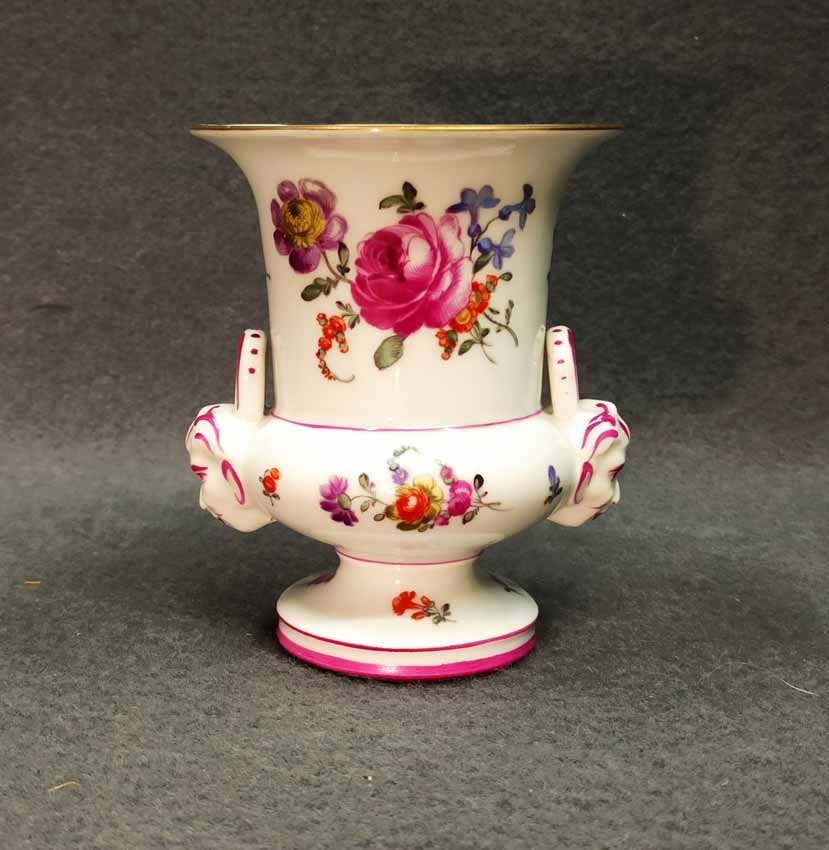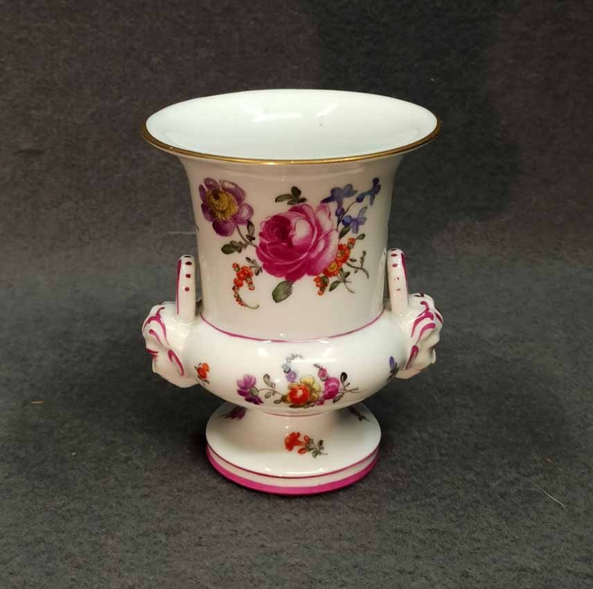 Reserviert! Vase mit Blumenmalerei und Maskarons um 1900. Beidseitig aufwändige Blumenmalerei, seitlich Handhaben mit Maskarons, Rand vergoldet. Sehr guter Zustand ohne Beschädigungen. Kleine herstellungsbedingte Unregelmäßigkeiten, zeittypisch. H. 11,5 cm, D. 9,5 cm. Sächsische Porzellanmanufaktur Dresden; Gemarkt "SP" (verschlungen) und Schriftzug "Dresden".