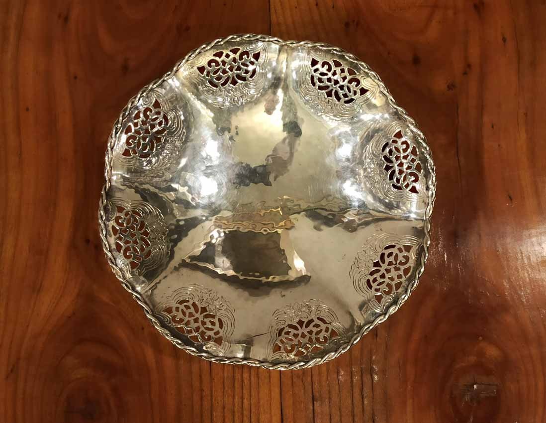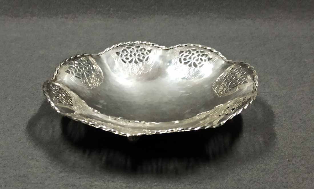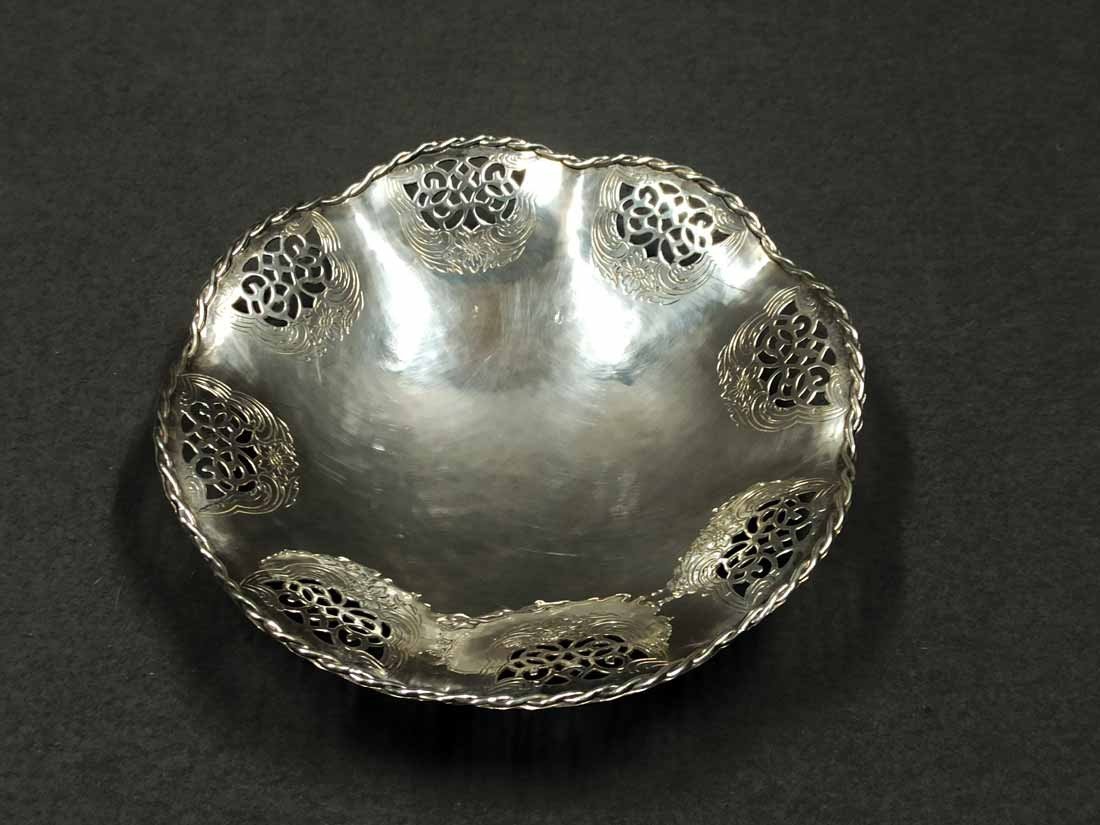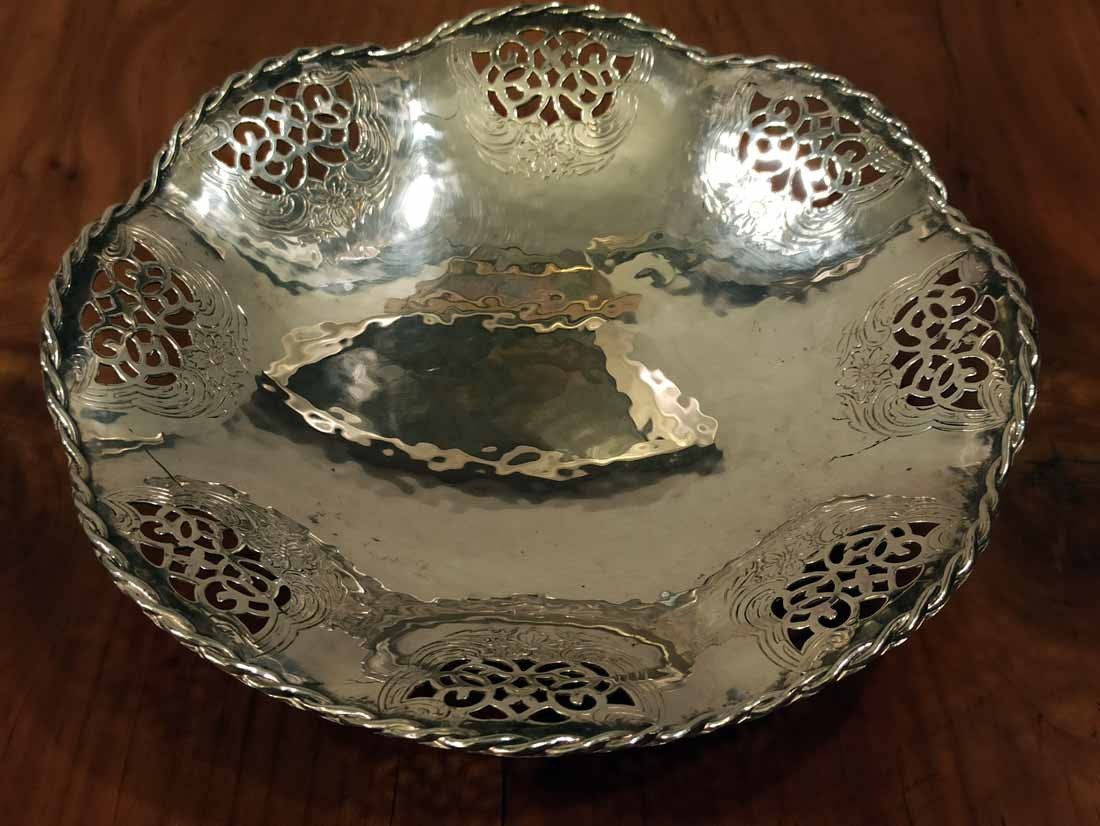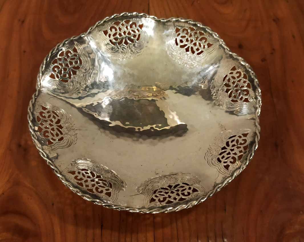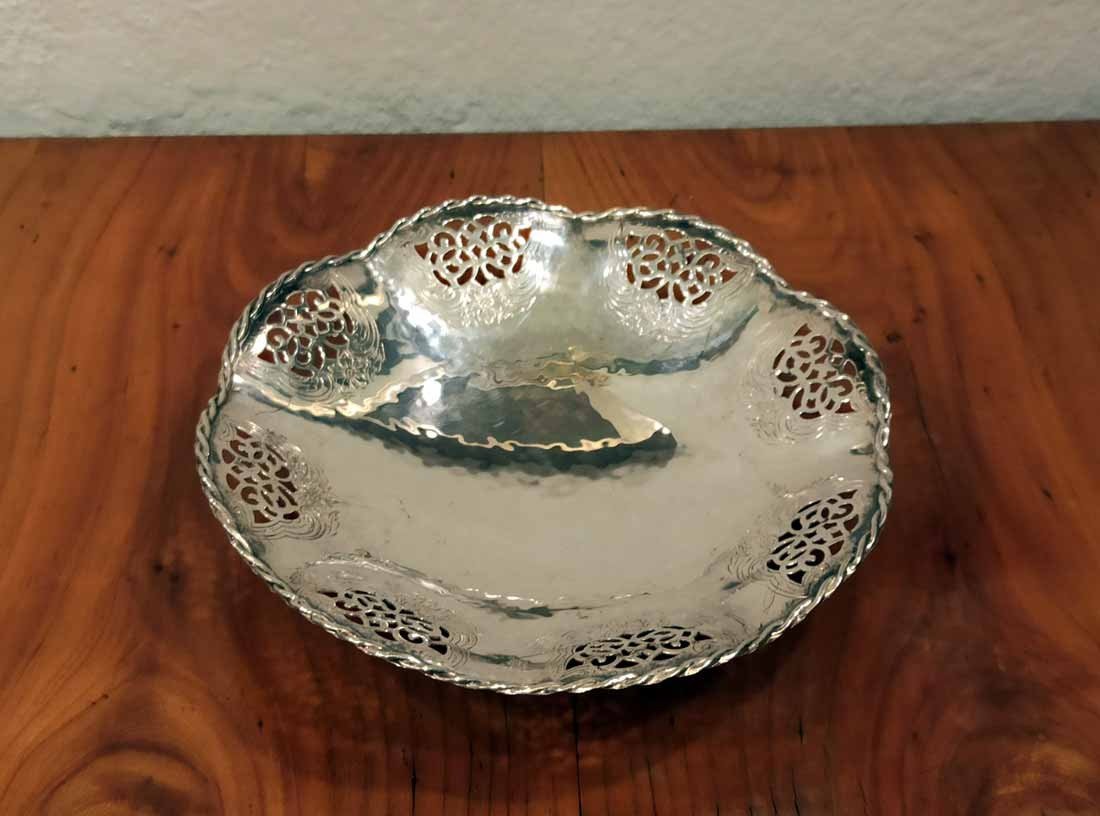 Schale, Gebäckschale versilbert von Quist um 1910. Schale in leichter Hammerschlagoptik mit durchbrochen Randverzierungen sowie geflochtener Randbordüre. D. 18 cm, H. 4 cm.