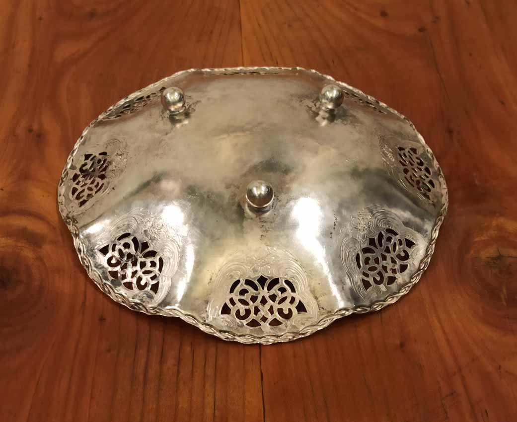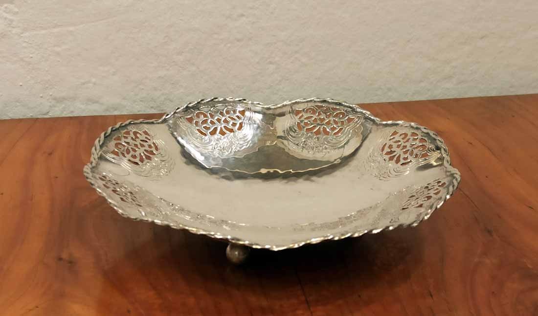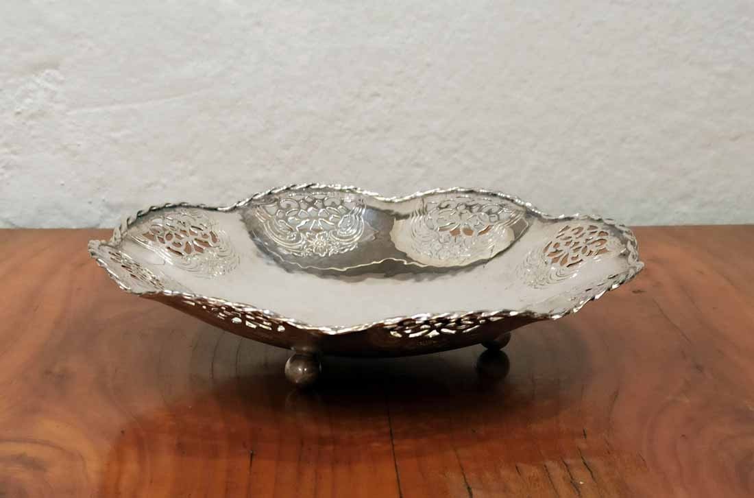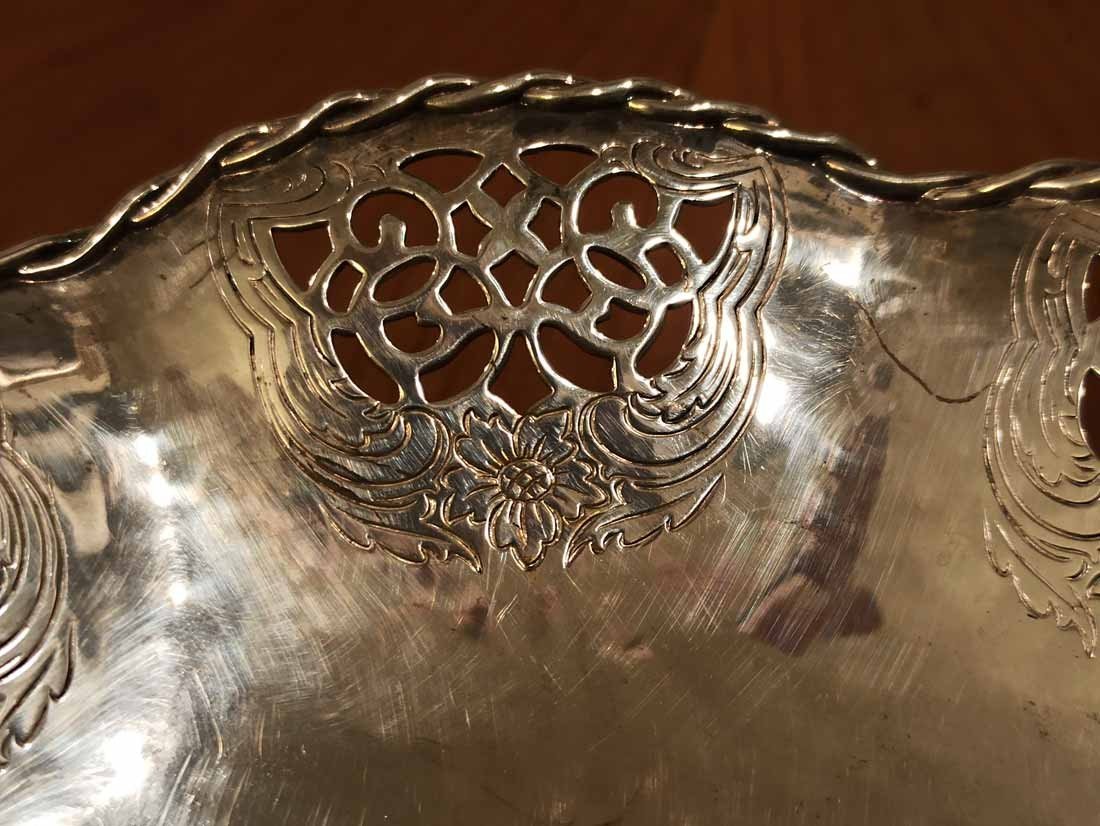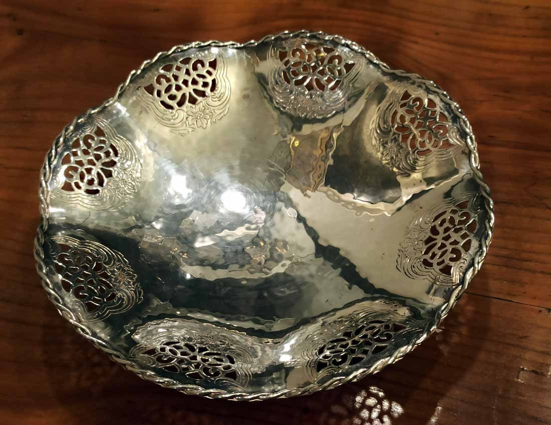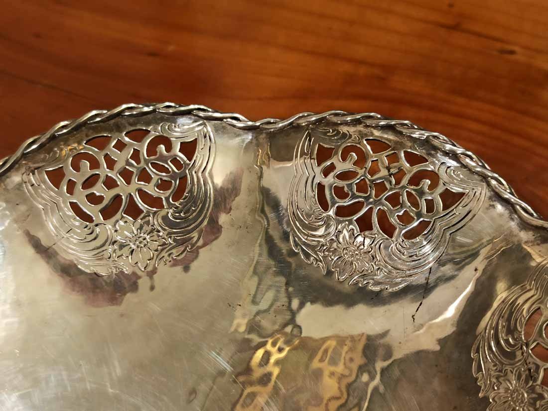 Schale, Gebäckschale versilbert von Quist um 1910. Schale in leichter Hammerschlagoptik mit durchbrochen Randverzierungen sowie geflochtener Randbordüre. D. 18 cm, H. 4 cm.