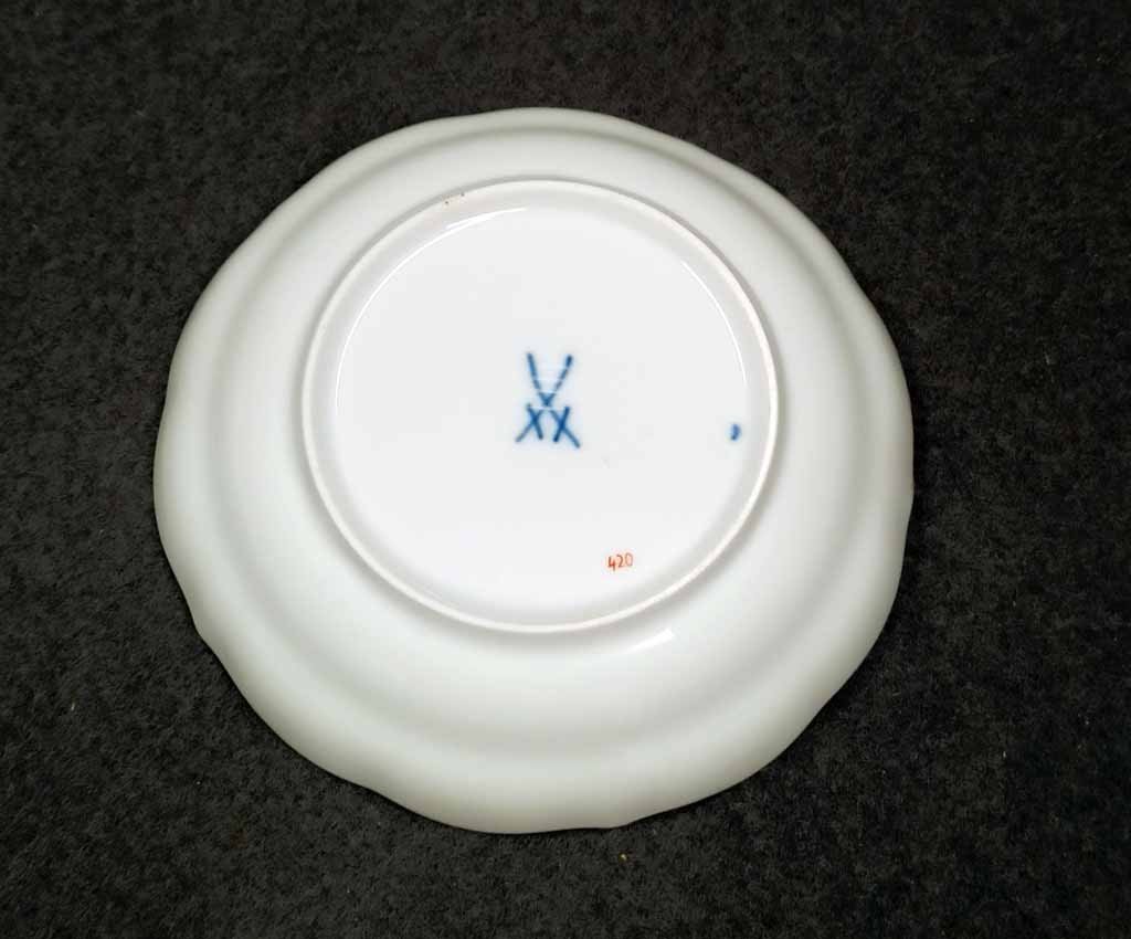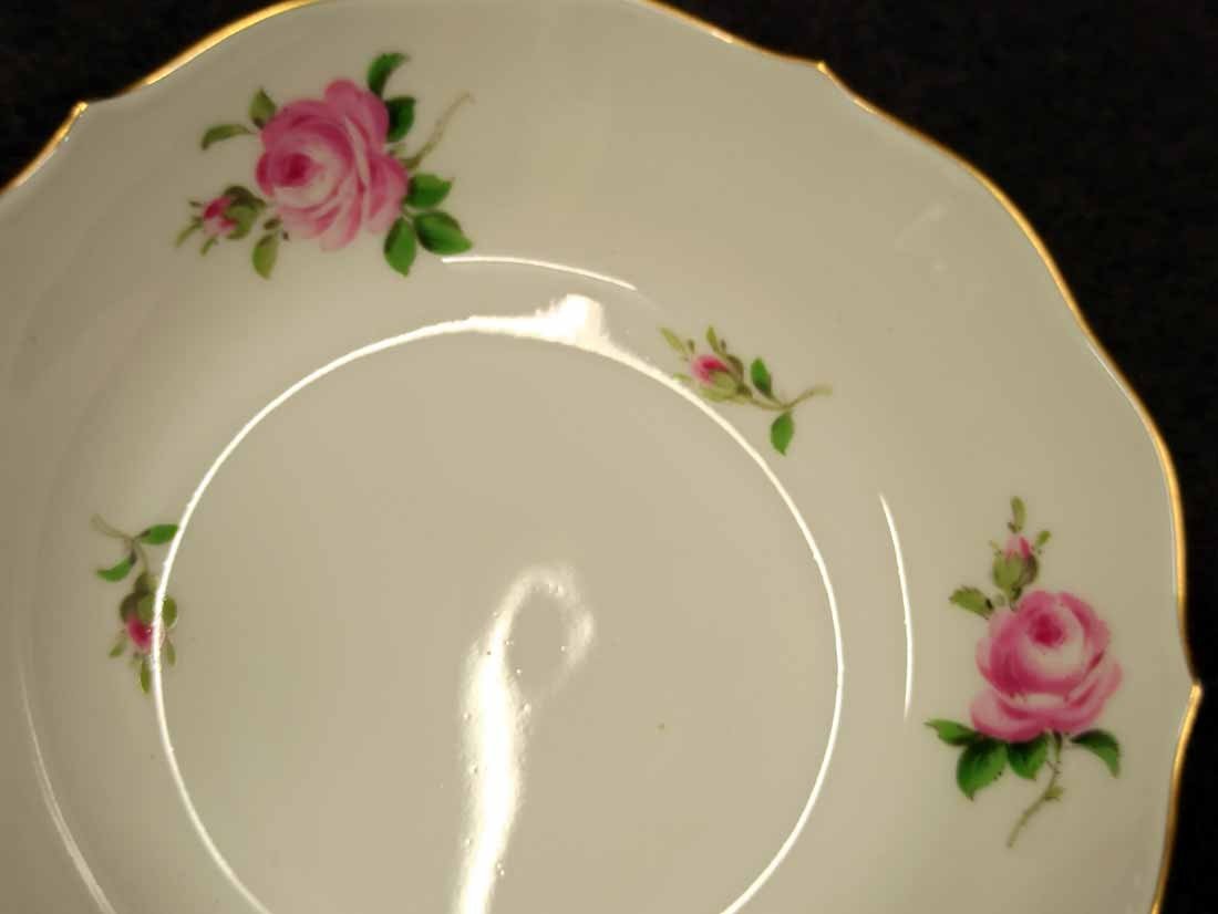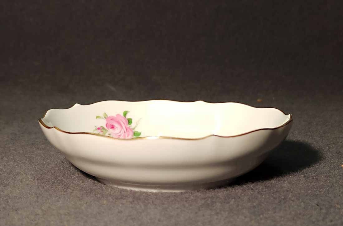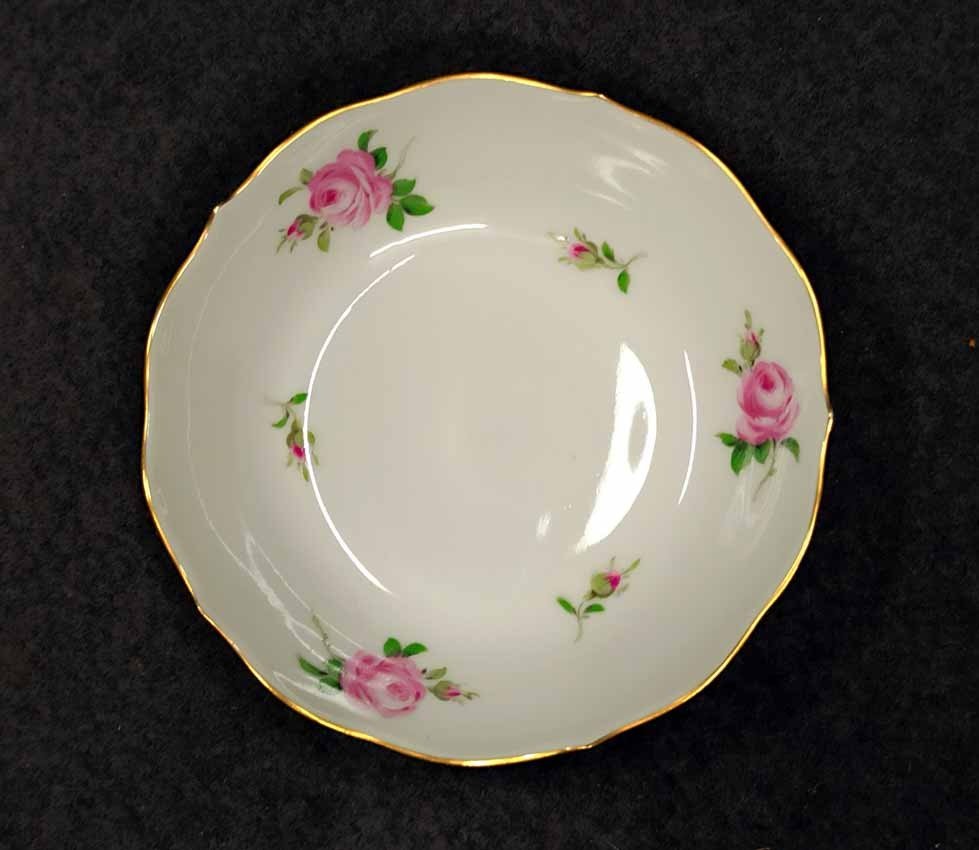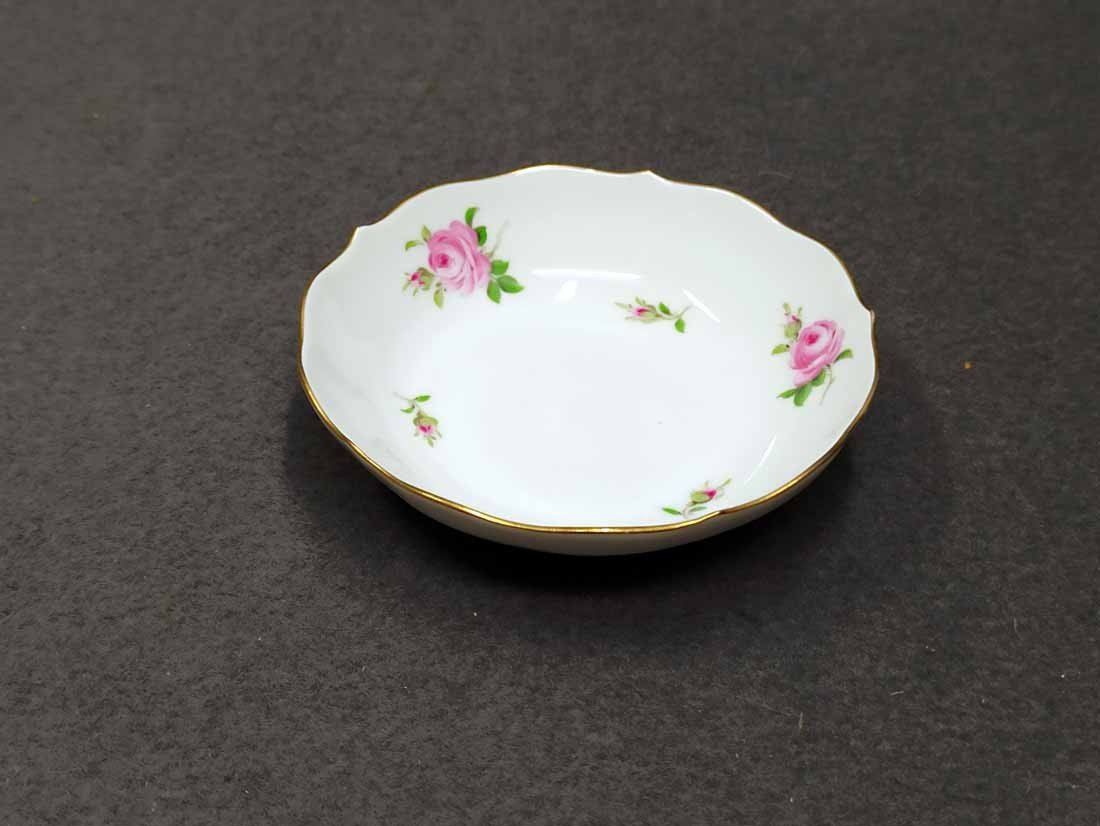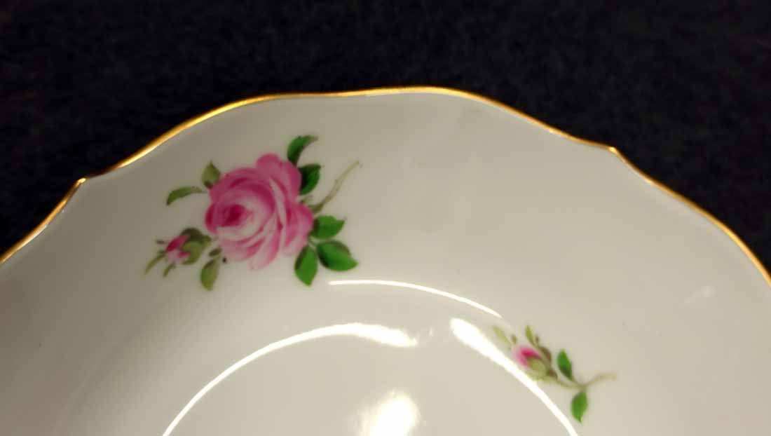 Meissen, kleine Schale mit Rosenmalerei und Goldrand. D. 11 cm, H. 2,7 cm. Schwertermarke der Manufaktur Meissen 4x gestrichen. Sehr guter Zustand ohne Beschädigungen.