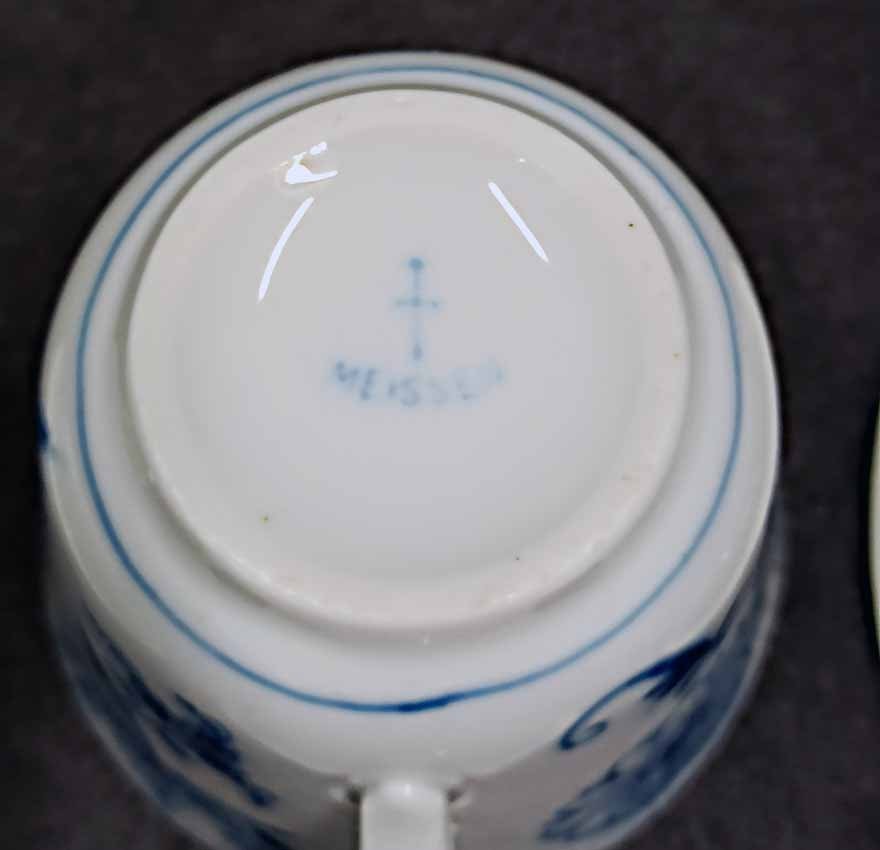 Drei Tassen Zwiebelmuster, Fa. Manufaktur Teichert in Meissen um 1900. Guter Zustand ohne Beschädigungen. Herstellungsbedingte und Teichert-typische Glasurunregelmäßigkeiten. Gemarkt mit der sogen "Ankermarke" : Pfeilkreuz mit gebogenem Schriftzug "Meissen" in Blau sowie der geprägte Stadtname "Meissen". Tasse H. 6,8 cm, D. 8 cm, Teller D. 14 cm.