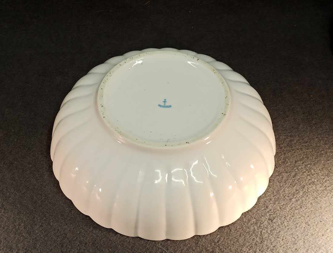 Große Schüssel, Zwiebelmuster, Manufaktur Teichert in Meissen um 1900. D. 25,5 cm, H. 7,5 cm. Guter Zustand keine Beschädigungen. Wenige herstellungsbedingt und Teichert-typische Glasurunregelmäßigkeiten, außenseitig unter dem Boden mehr. Gemarkt mit der sogen "Ankermarke" : Pfeilkreuz mit gebogenem Schriftzug "Meissen" in Blau sowie der geprägte Stadtname "Meissen".