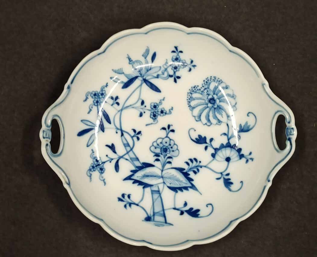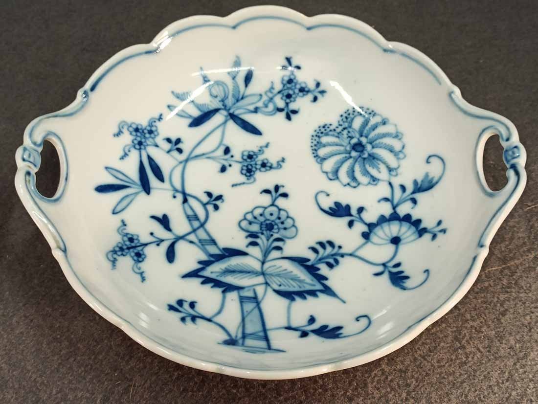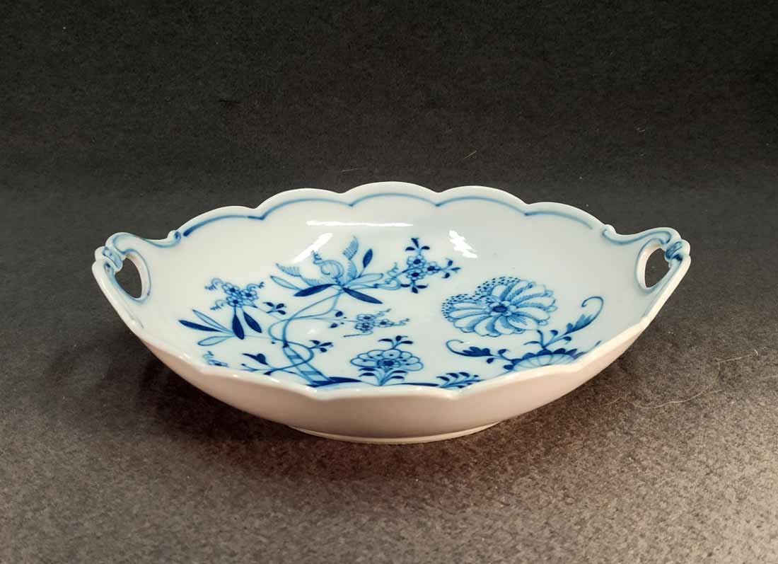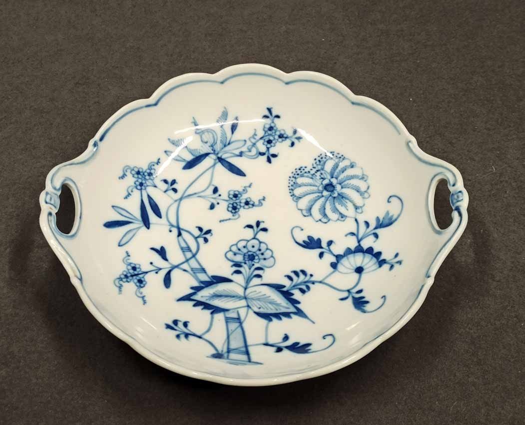 Henkelschale, Zwiebelmuster, Manufaktur Teichert in Meissen um 1900. Geschwungener Rand, seitl. zwei Handhaben. B. 22 cm, H. 5,5 cm. Guter Zustand keine Beschädigungen. Kleinere herstellungsbedingte und Teichert-typische Glasurunregelmäßigkeiten. Gemarkt mit der sogen "Ankermarke" : Pfeilkreuz mit gebogenem Schriftzug "Meissen" in Blau sowie der geprägte Stadtname "Meissen".
