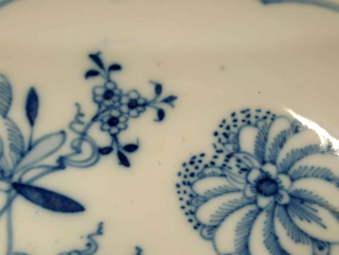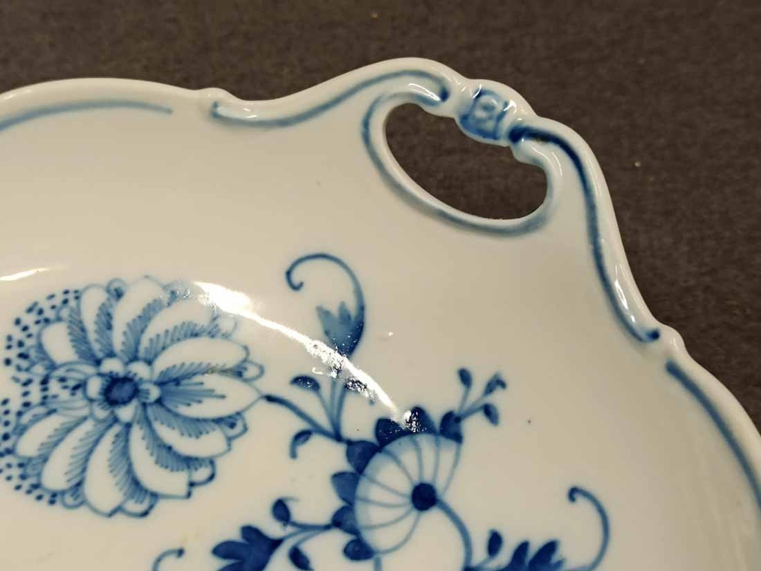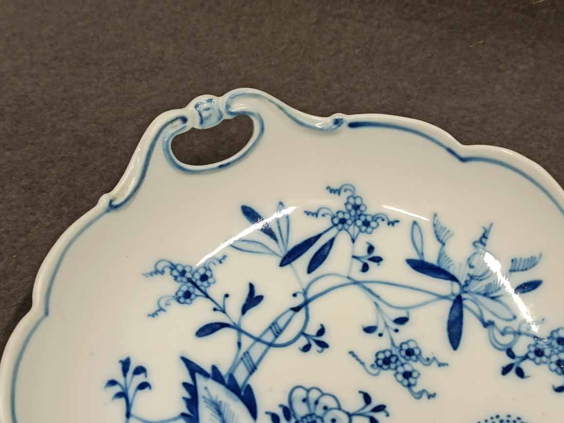 Henkelschale, Zwiebelmuster, Manufaktur Teichert in Meissen um 1900. Geschwungener Rand, seitl. zwei Handhaben. B. 22 cm, H. 5,5 cm. Guter Zustand keine Beschädigungen. Kleinere herstellungsbedingte und Teichert-typische Glasurunregelmäßigkeiten. Gemarkt mit der sogen "Ankermarke" : Pfeilkreuz mit gebogenem Schriftzug "Meissen" in Blau sowie der geprägte Stadtname "Meissen".