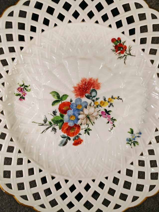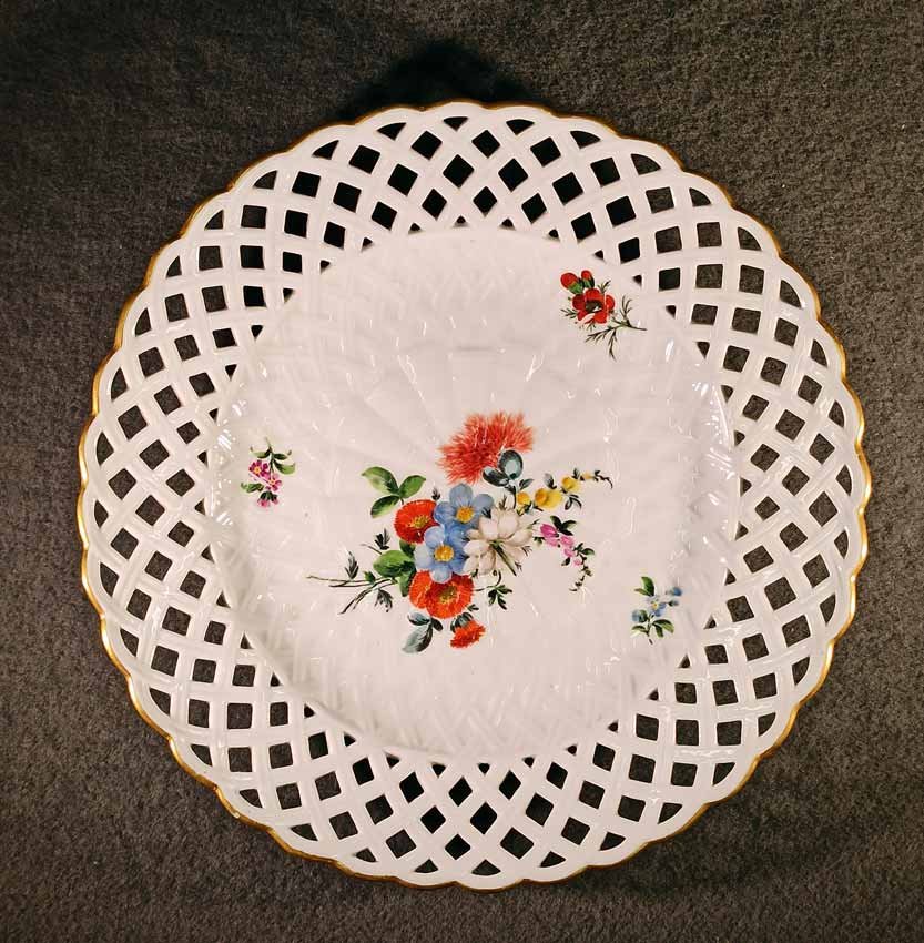 Teller Meissen 2.Drittel 18.Jh. , Durchbruchteller mit Korbrand und Korbrelief im Spiegel, Blumenmalerei und Goldrand. D. 23 cm