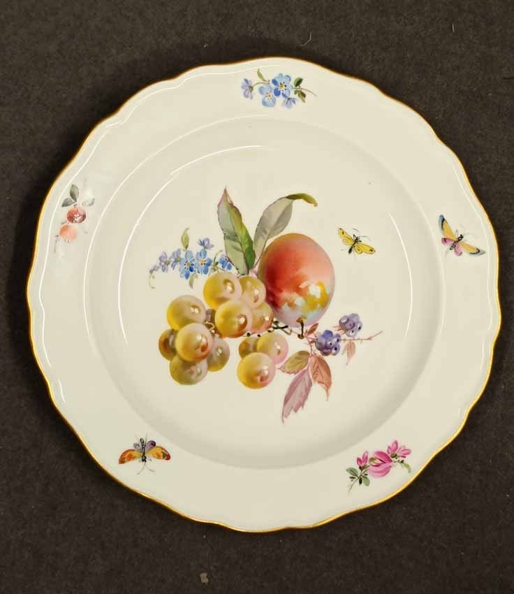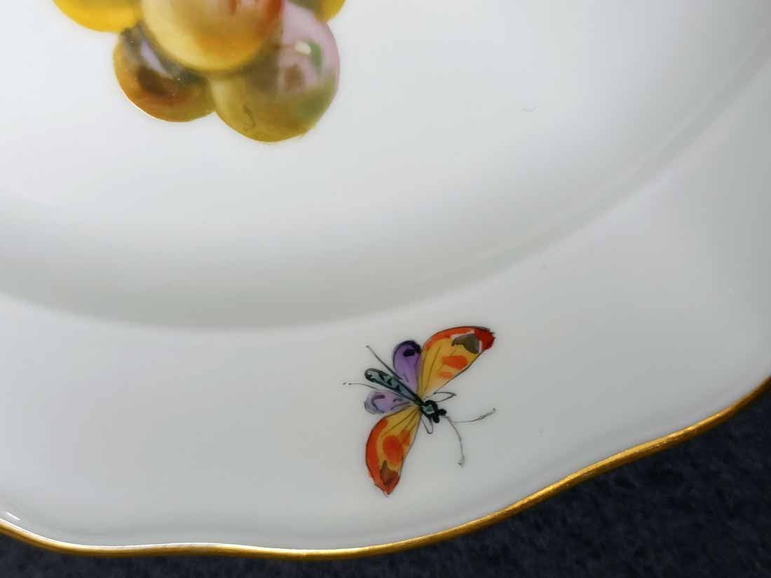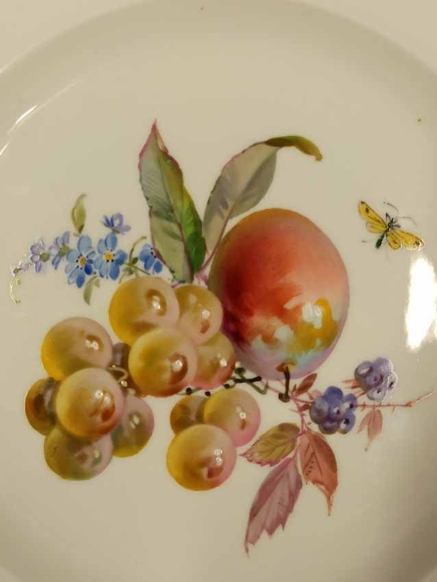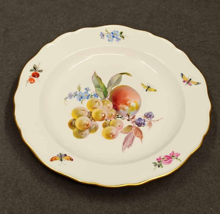 Meisen, Teller mit seltener Obstmalerei, Insektenmalerei und Goldrand. 2.Hälfte 19.Jh. Schwertermarke, Knaufschwerter 1.Wahl ohne Schleifstriche. D. 22 cm