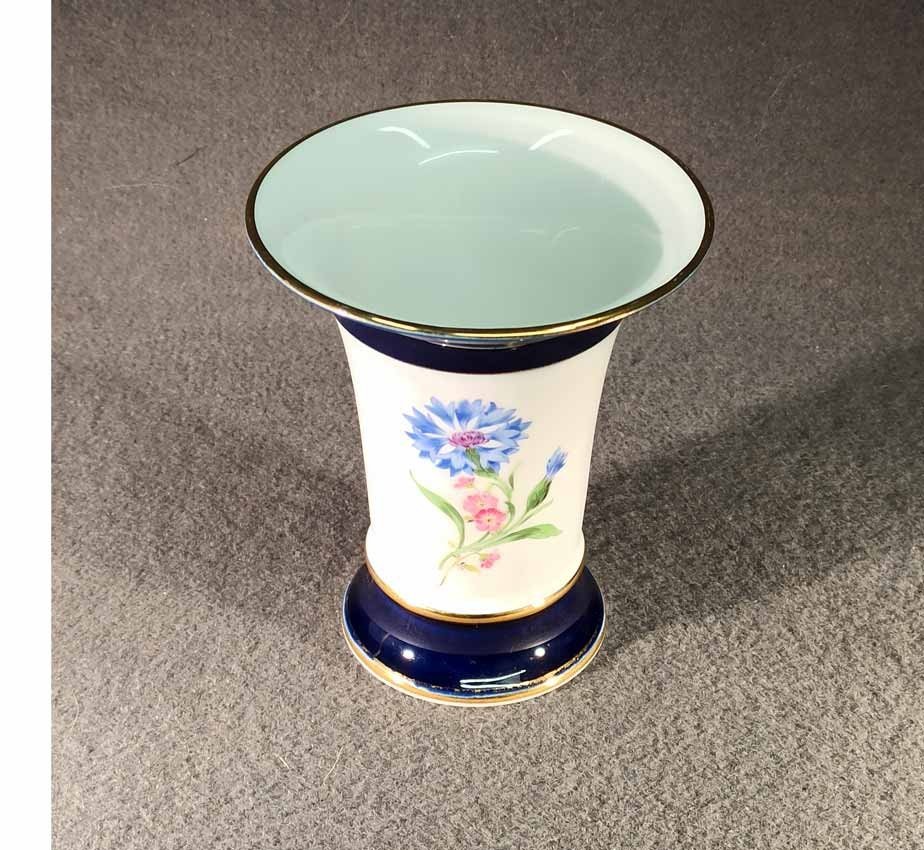Meissen, Kratervase Kobaltblau mit Goldrändern und Blumenmalerei. Blumenmalerei beidseitig. Guter Zustand ohne Beschädigungen, etwas Goldabrieb. Schwertermarke von Meissen 2x gestrichen. H. 14 cm.