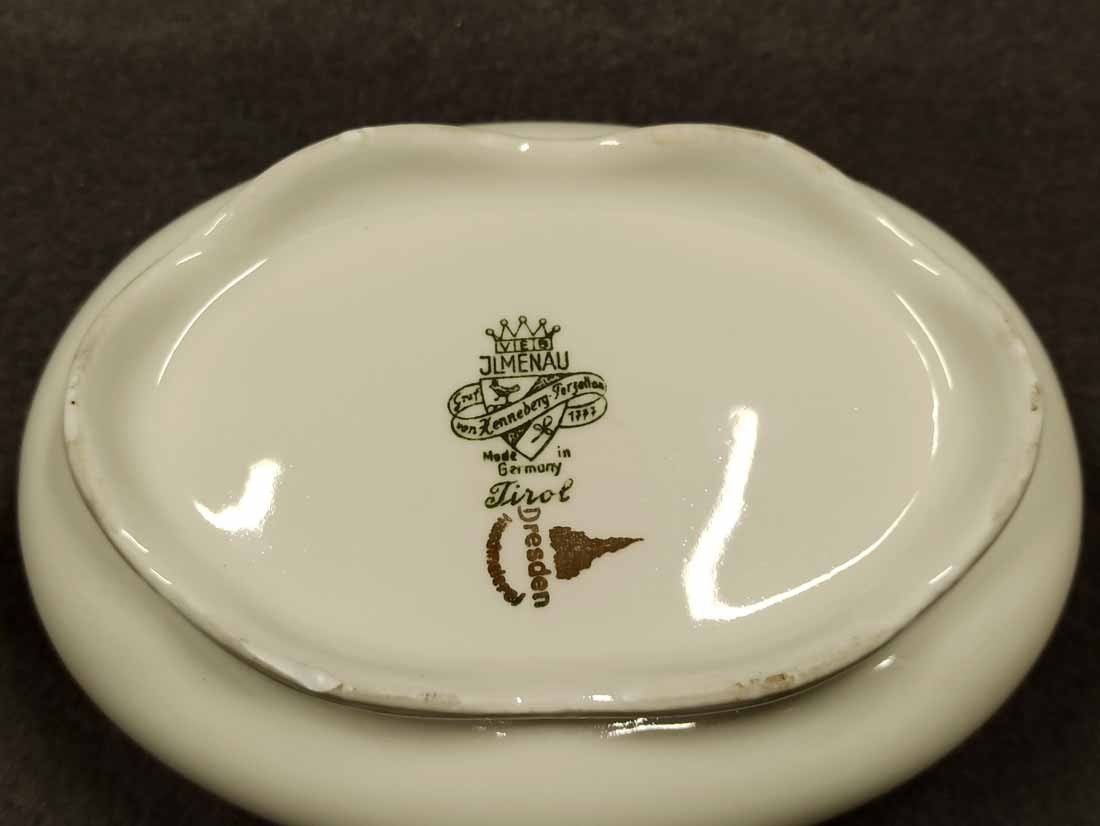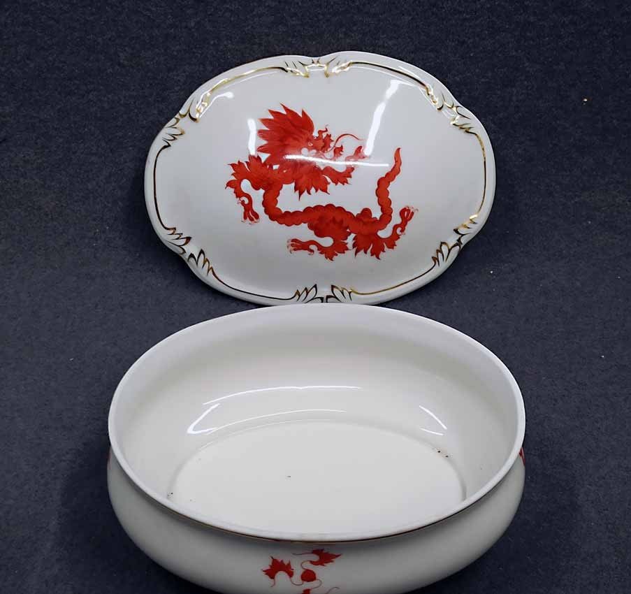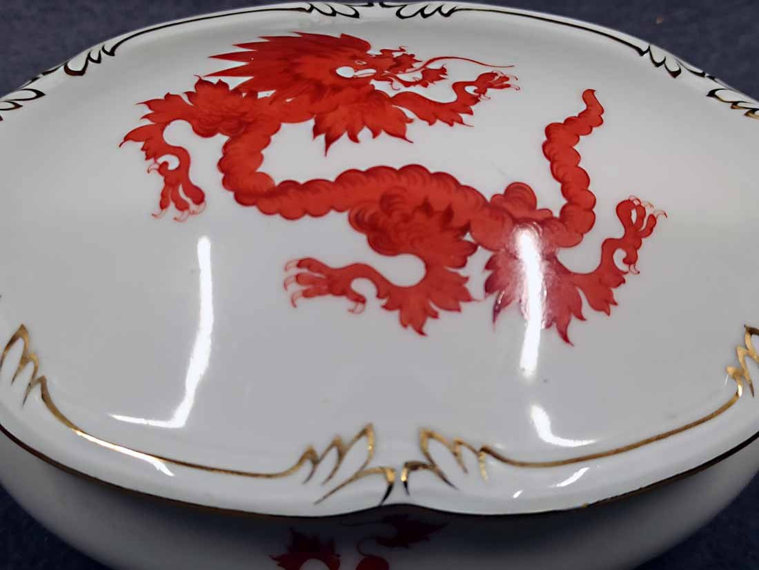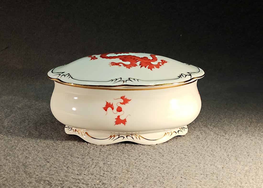 Schmuckdose, Roter Drache mit Goldverzierung. Porzellan Henneberg-Illmenau, Thüringen mit Dresdner Handmalerei. Große Dose L.16 cm, B. 11 cm, H. ca 8,5 cm. Sehr guter Zustand ohne Beschädigungen, im Deckel (innen) mit Widmung, Bodenmarken Illmenau und Dresden.