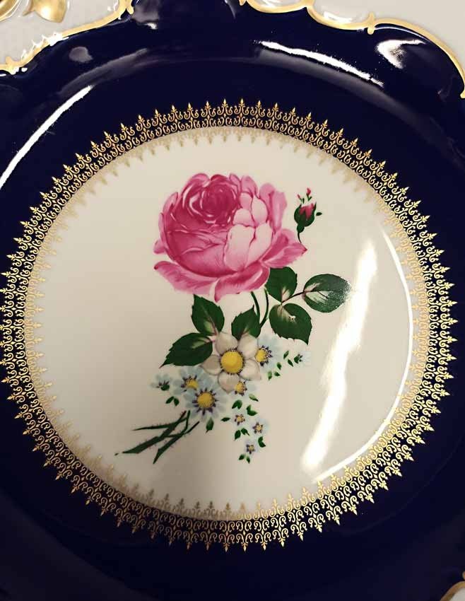 Prunkteller, Kobaltblau mit Gold und Blumenmalerei, Reichenberg, D. 32 cm