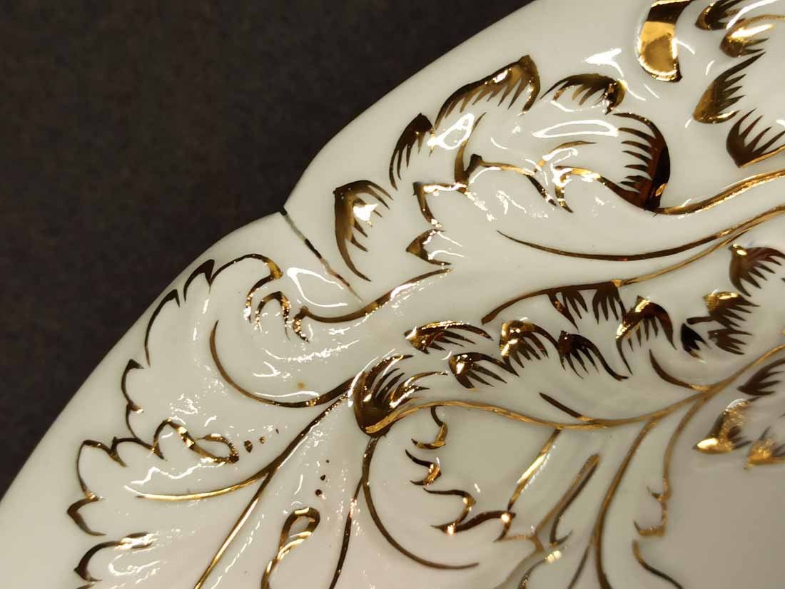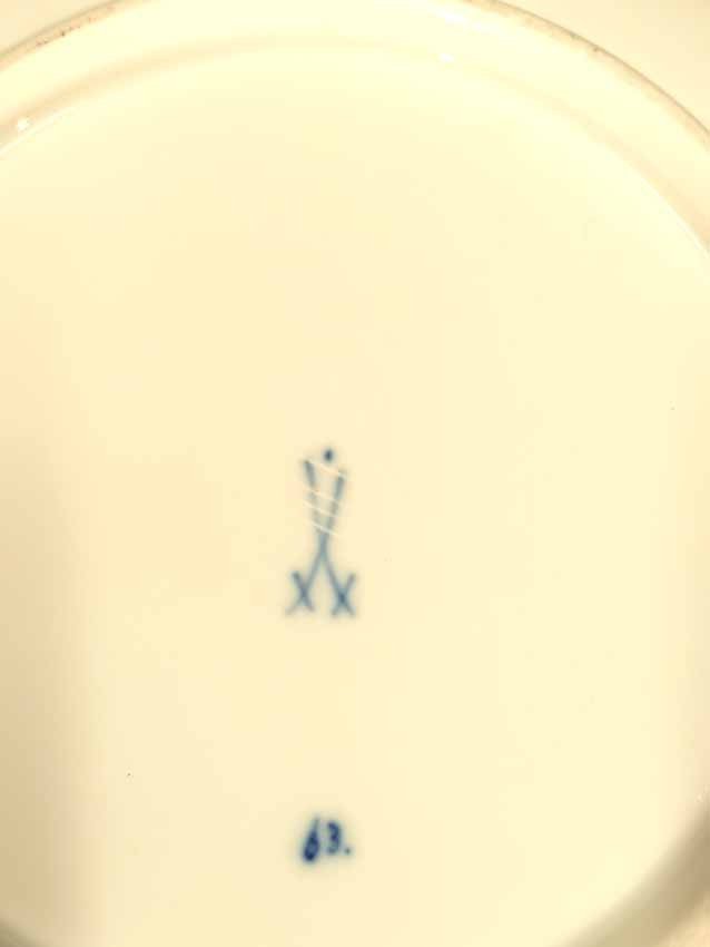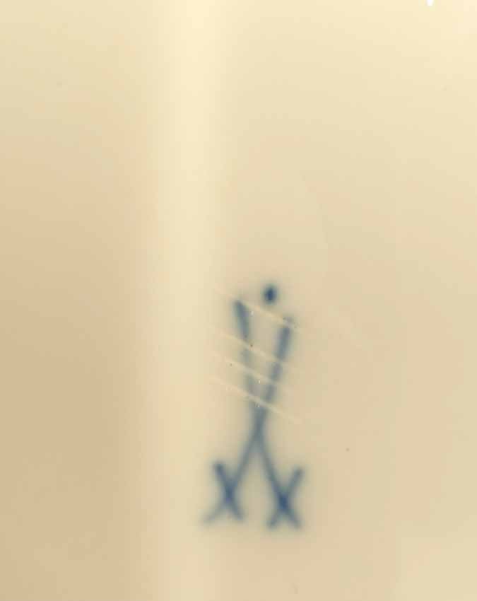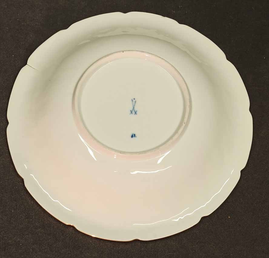 Prunkschale von Meissen mit vergoldetem Reliefrand und Blumenmalerei. Schale mit herstellungsbedingten Mängeln. Ein Brandriss am Rand und eine kleine Porzellanfehlstelle unter dem Rand unter Glasur (herstellungsbedingt), von vorn nicht sichtbar. Blaue Schwertermarke mit Punkt 1920-30er Jahre. Aufgrund der beschriebenen Herstellungsmängel Marke 4x gestrichen. D. 30,5 cm.