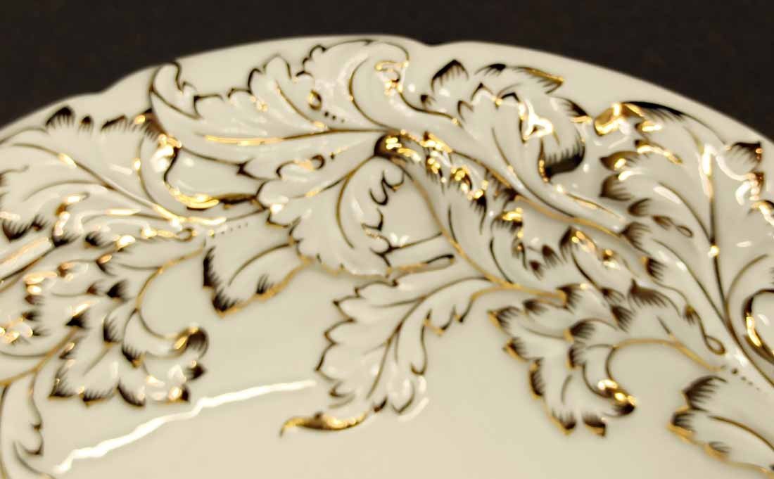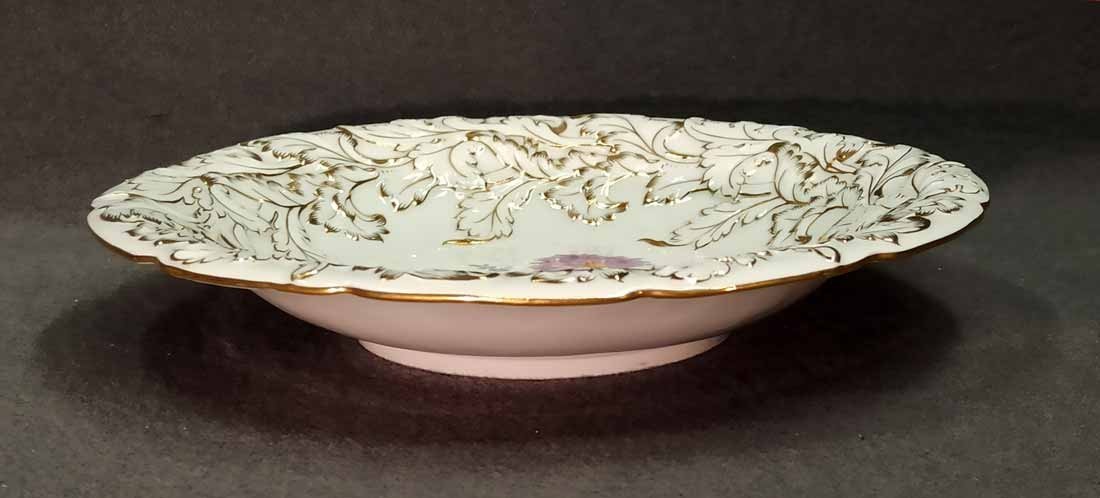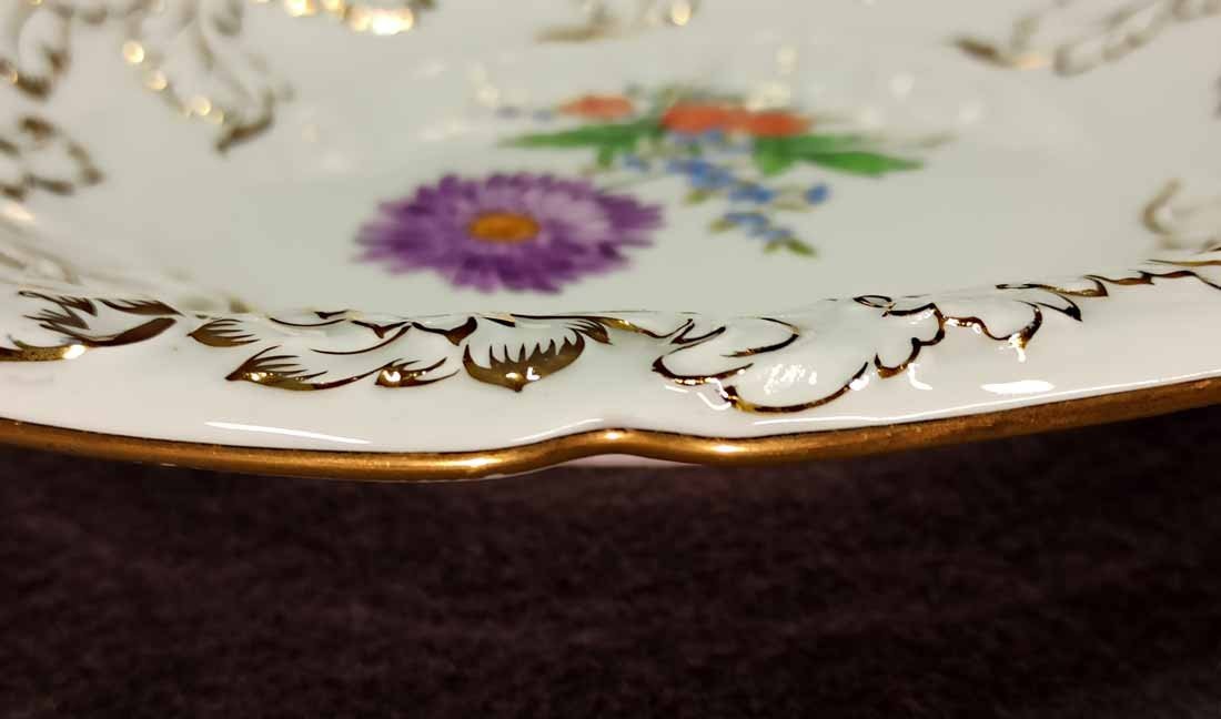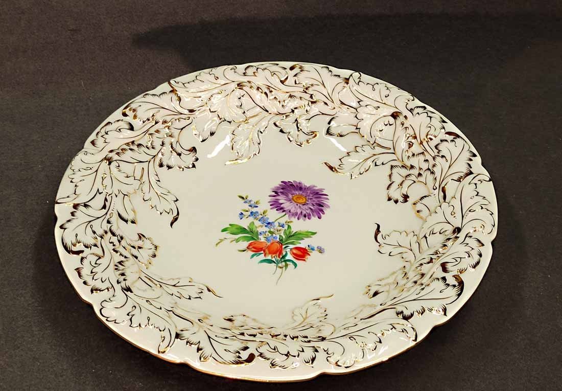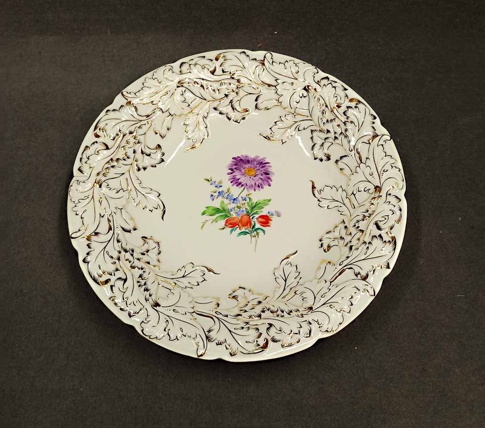 Meissen, Prunkschale/-teller mit Blumenmalerei und Reliefrand mit Gold, D. 30,5 cm