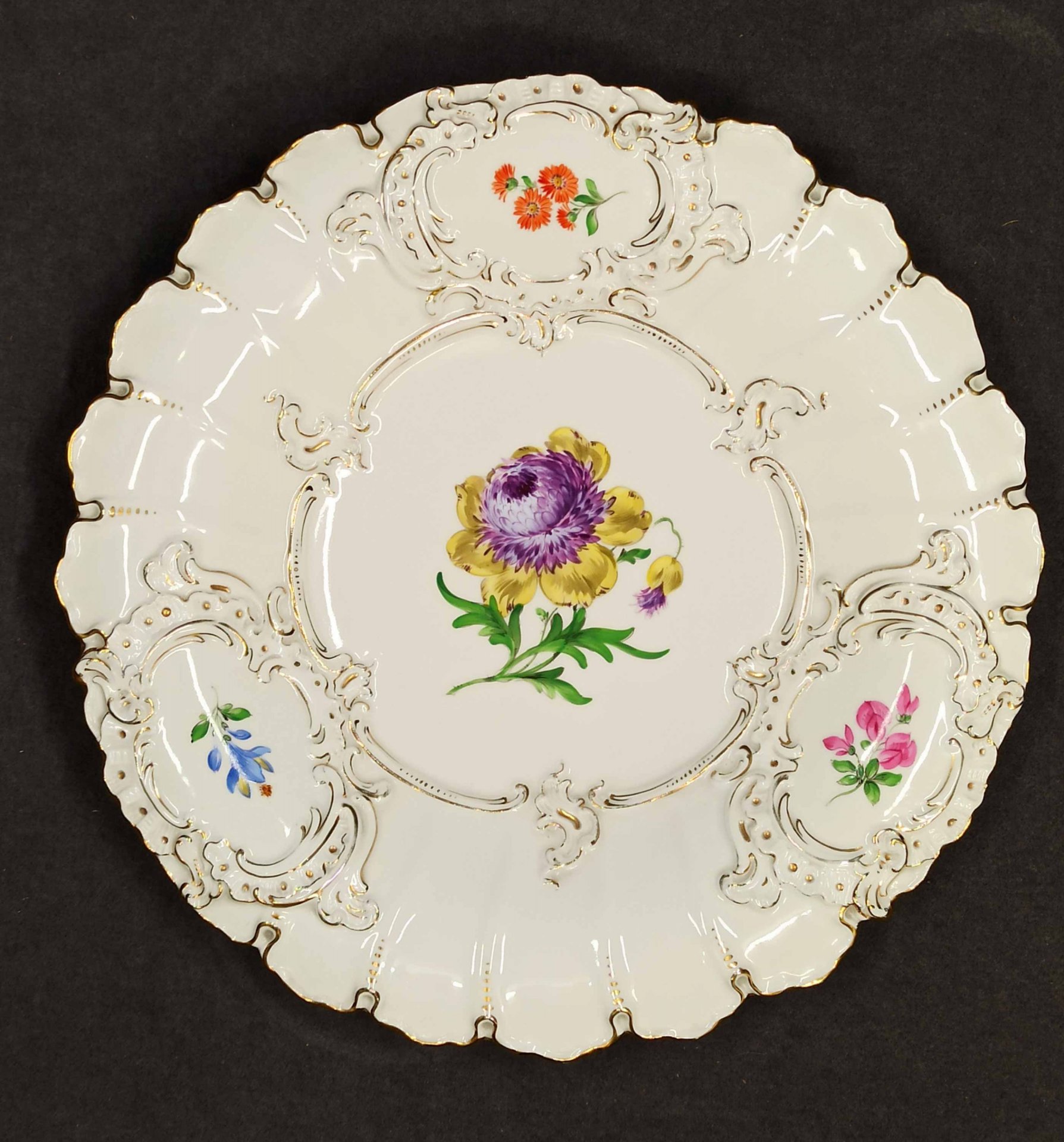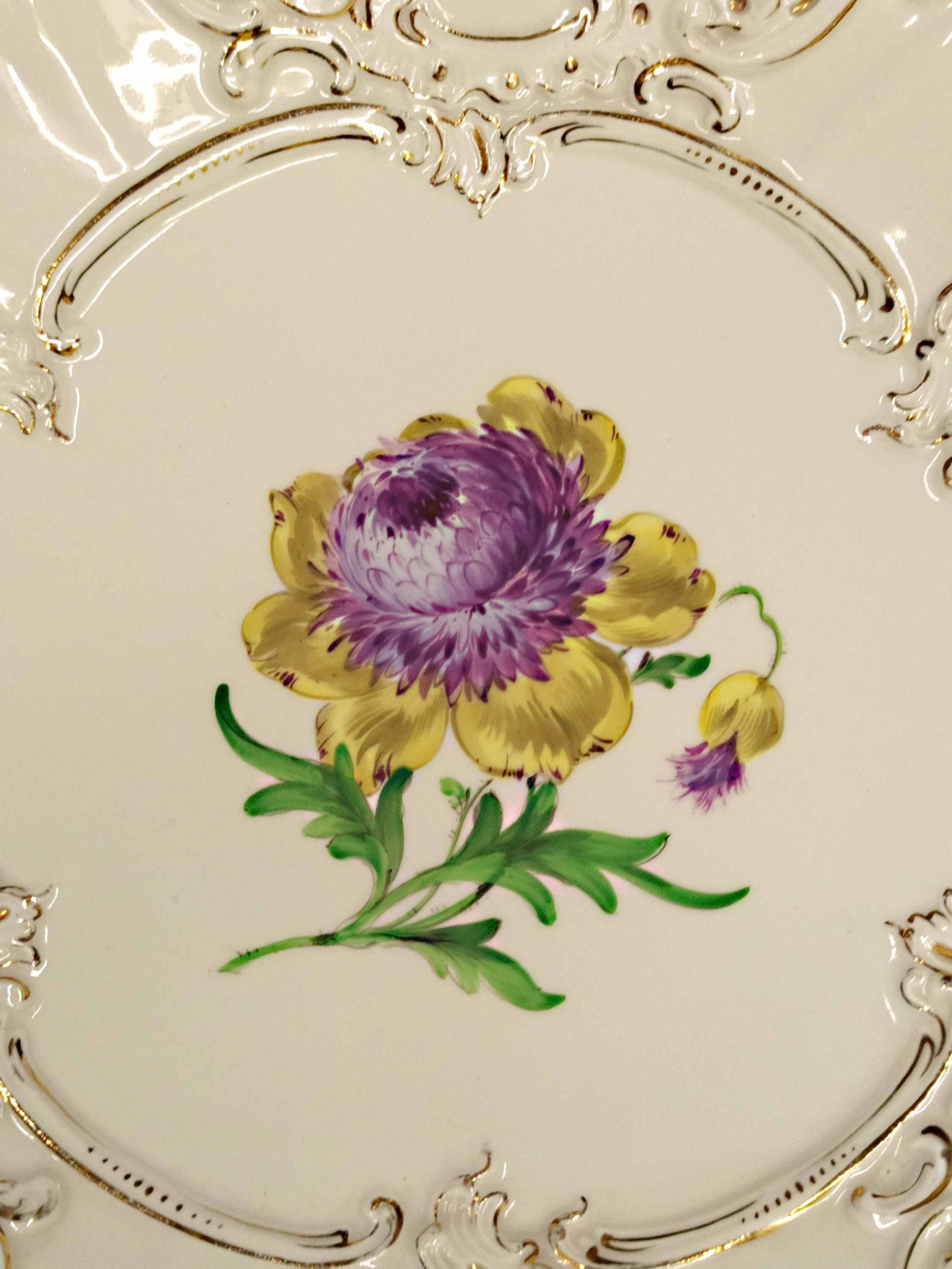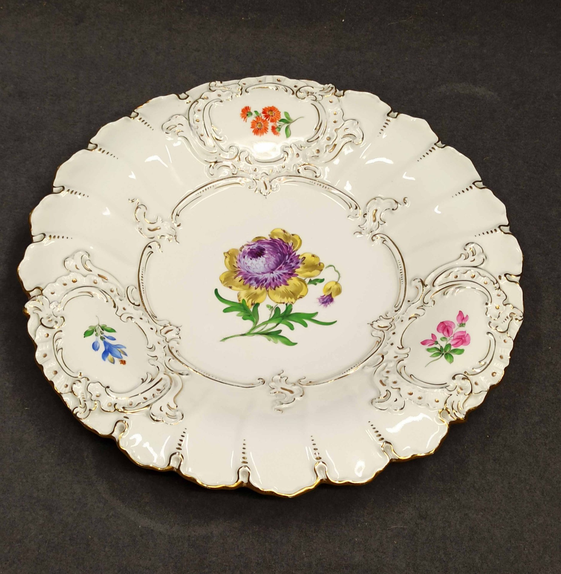 Meissen, großer Teller, Prunkschale. Mittig Blumenmalerei, Reliefierter Rand mit 3 Kartuschen mit kleinen Blumen. Reliefrand vergoldet. Alte Schale um 1900. Schwerter mit Knaufgriffen (Knaufzeit) 2x gestrichen. Sehr guter Zustand ohne Beschädigungen. D. ca 30 cm.