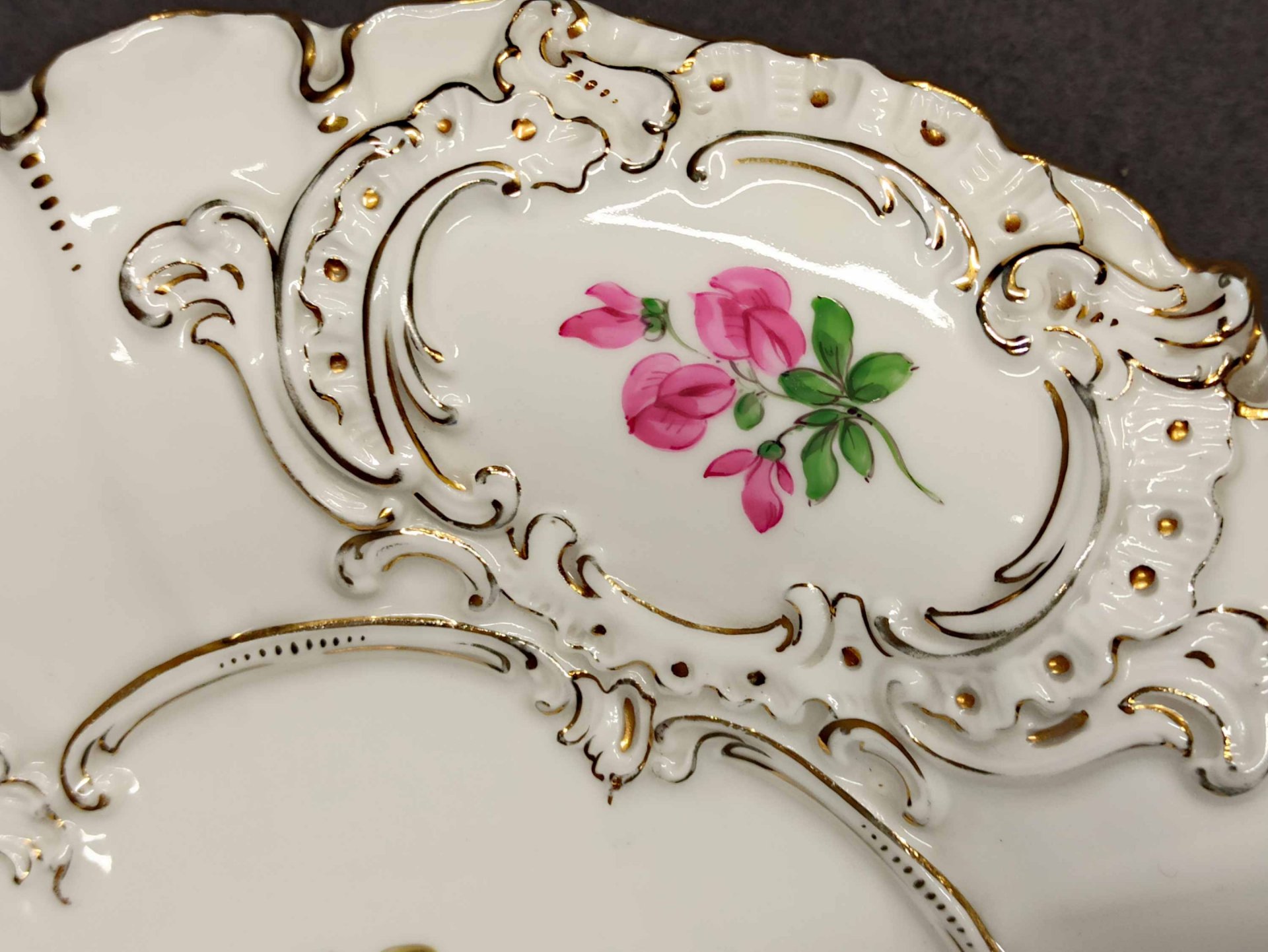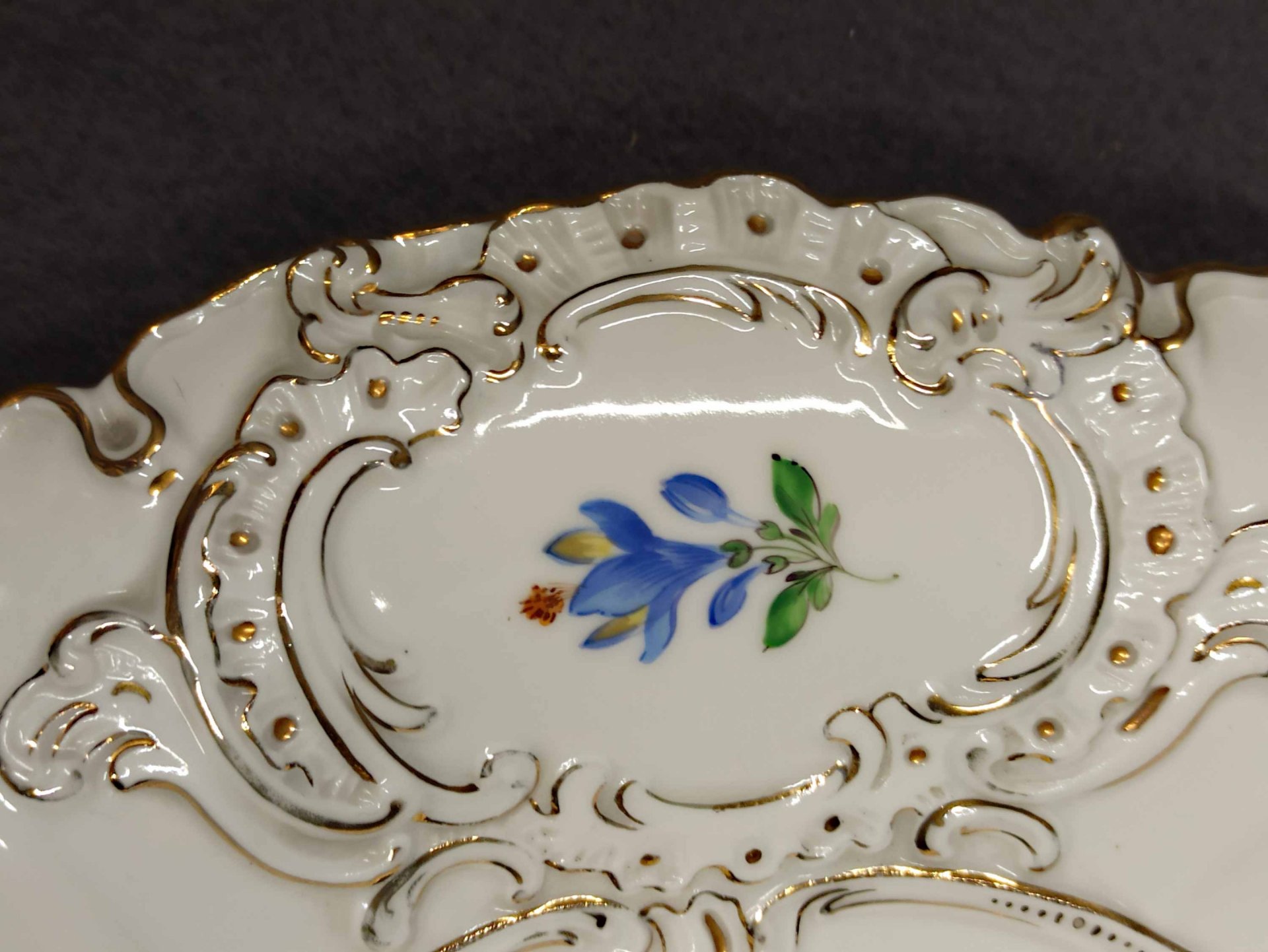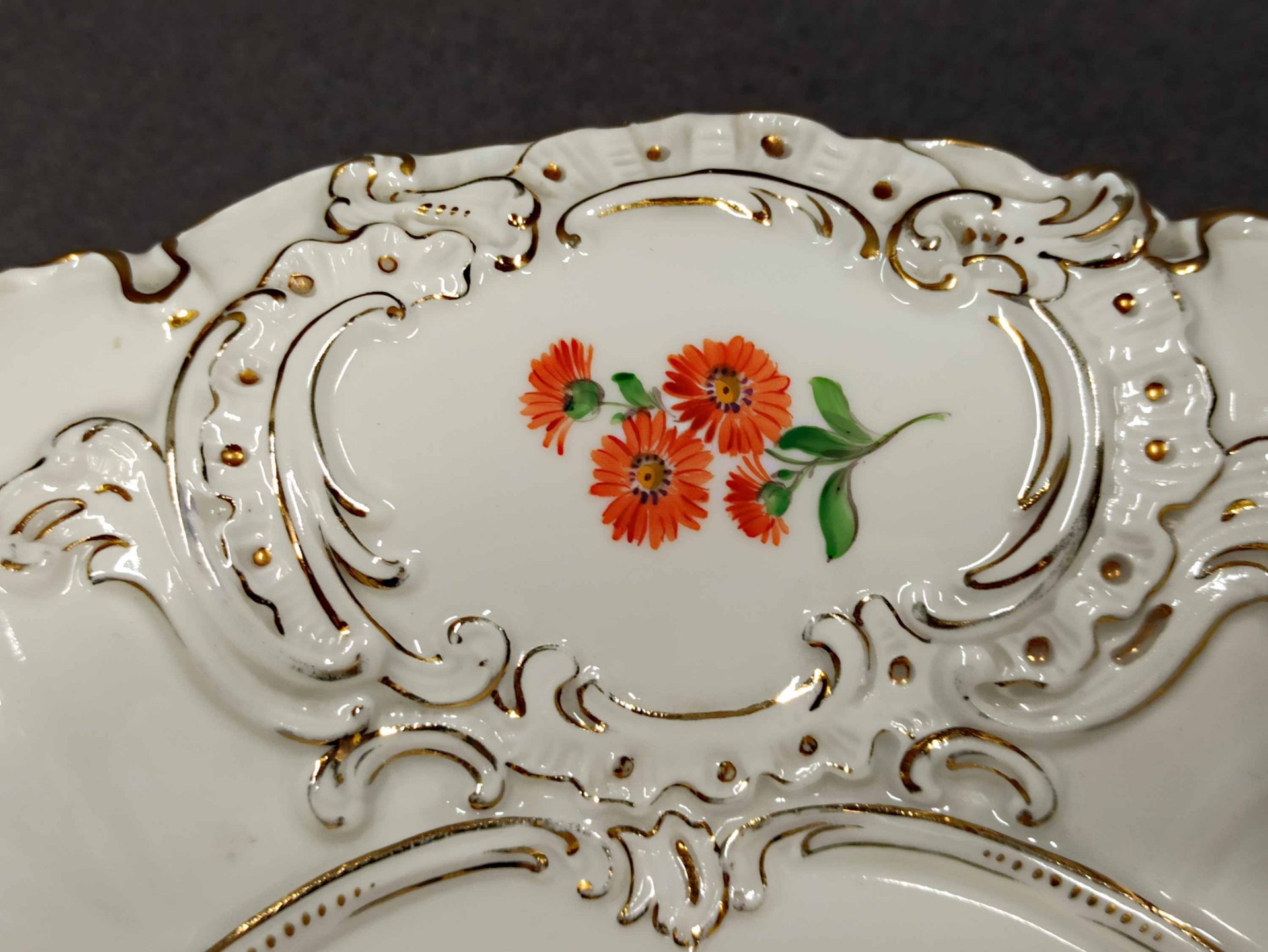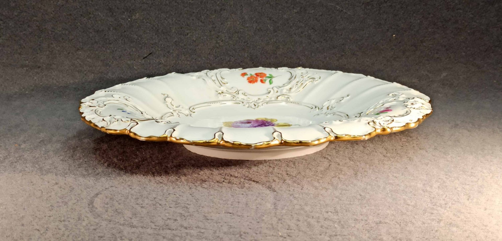 Meissen, großer Teller, Prunkschale. Mittig Blumenmalerei, Reliefierter Rand mit 3 Kartuschen mit kleinen Blumen. Reliefrand vergoldet. Alte Schale um 1900. Schwerter mit Knaufgriffen (Knaufzeit) 2x gestrichen. Sehr guter Zustand ohne Beschädigungen. D. ca 30 cm.