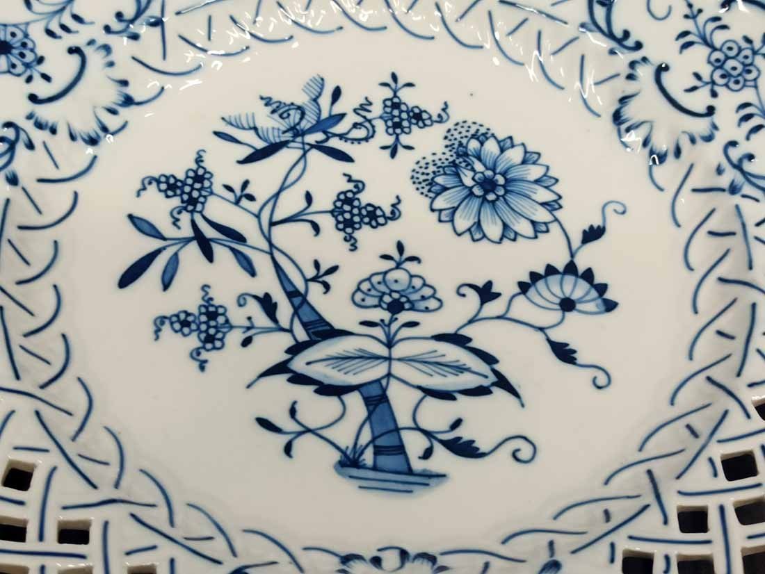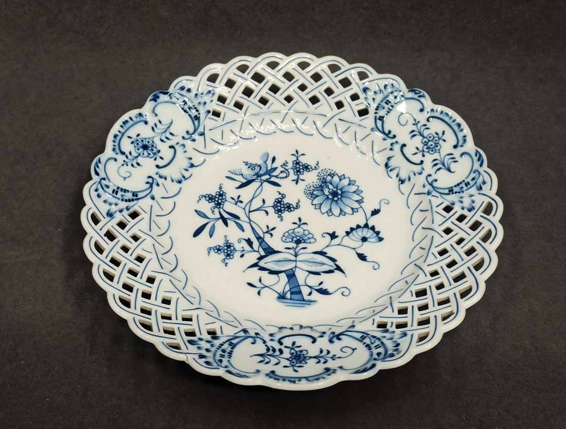 Teichert-Meissen, großer Zwiebelmuster Teller mit Flechtrand, D. 28,5 cm.Sehr guter Zustand ohne Beschädigungen. Rs. Blaue Manufakturmarke von Teichert; Schriftzug "MEISSEN" im Oval. Großer Teller D. 28,5 cm