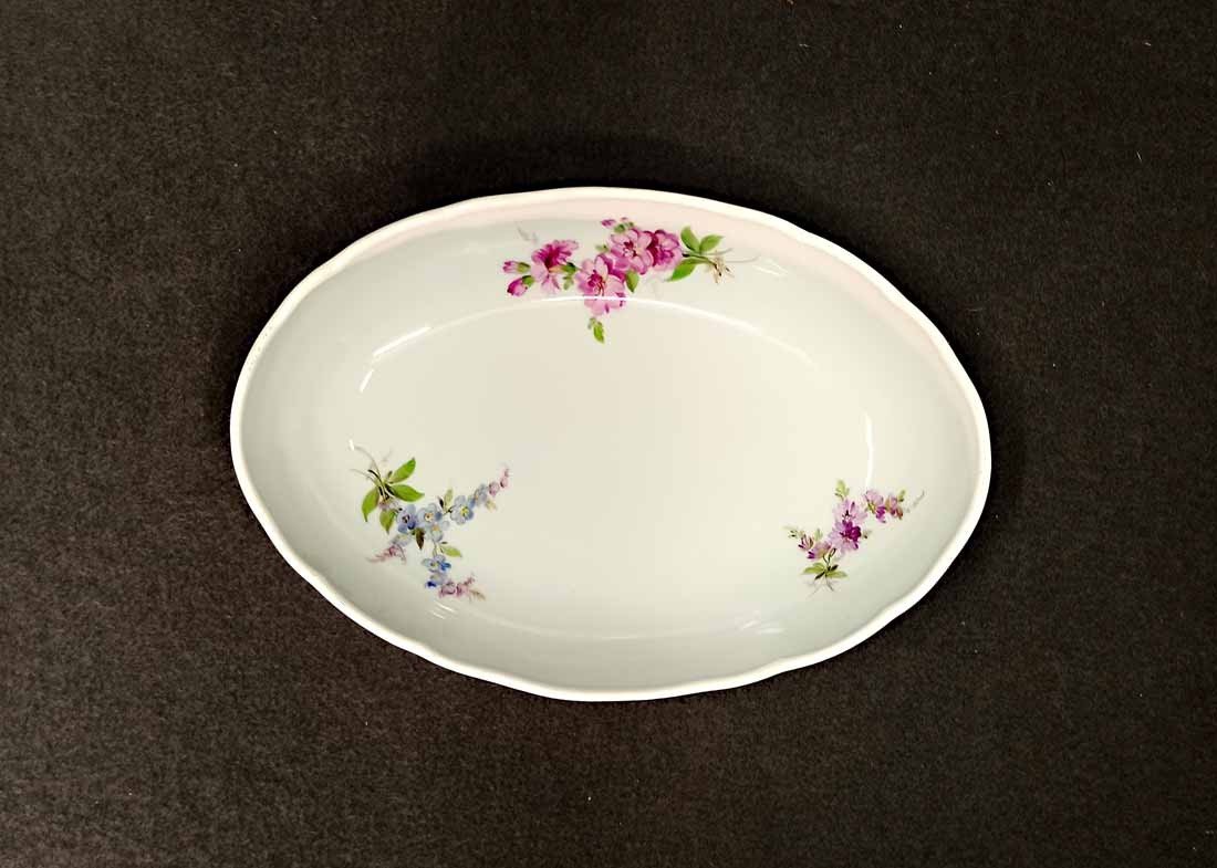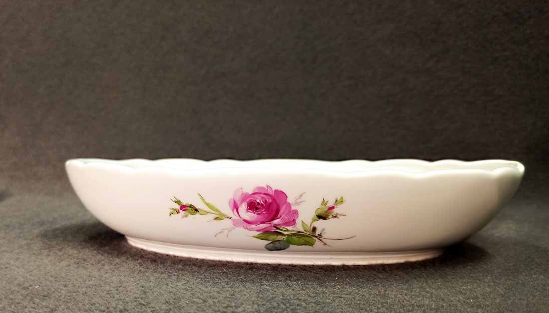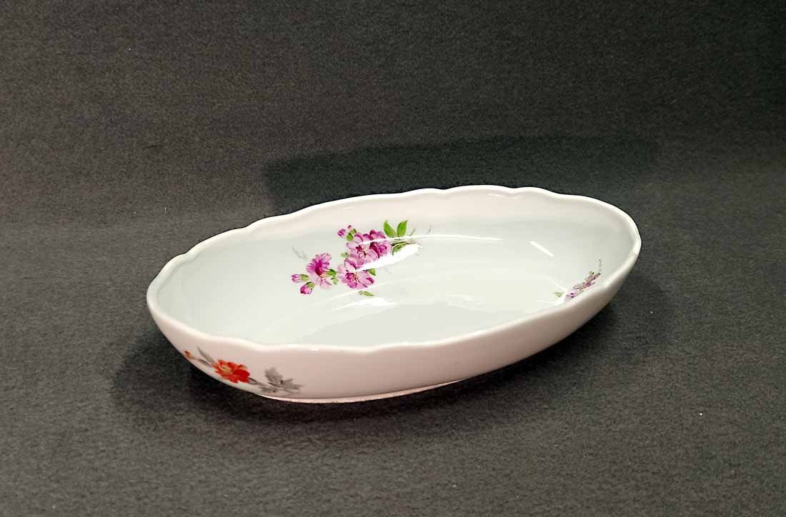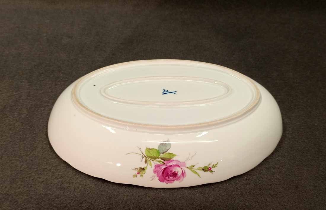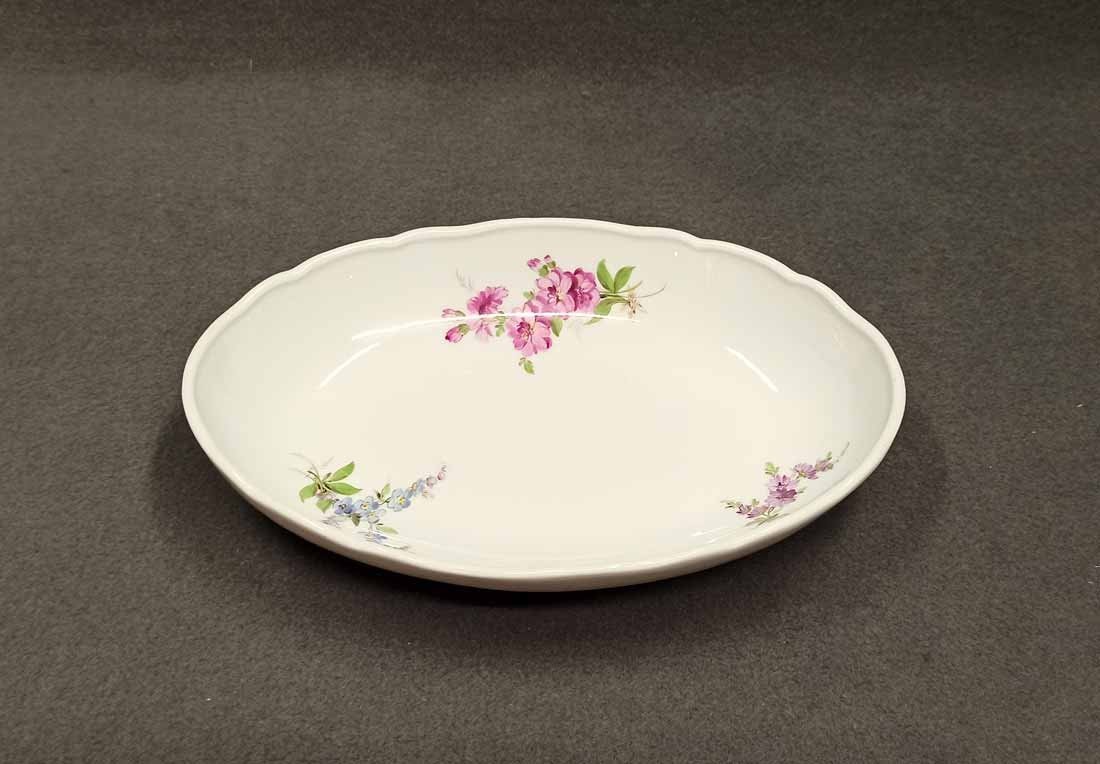 Meissen; Schale mit Blumenmalerei um 1880/1900. Schale auch außen bemalt. Guter Zustand ohne Beschädigungen. Schwertermarke der Manufaktur Meissen ohne Schleifstriche, 1.Wahl. Alte Schwertermarke mit Knaufgriffen um 1880-1900. L.xB.  25,5 cm x 17 cm, H. 5 cm.