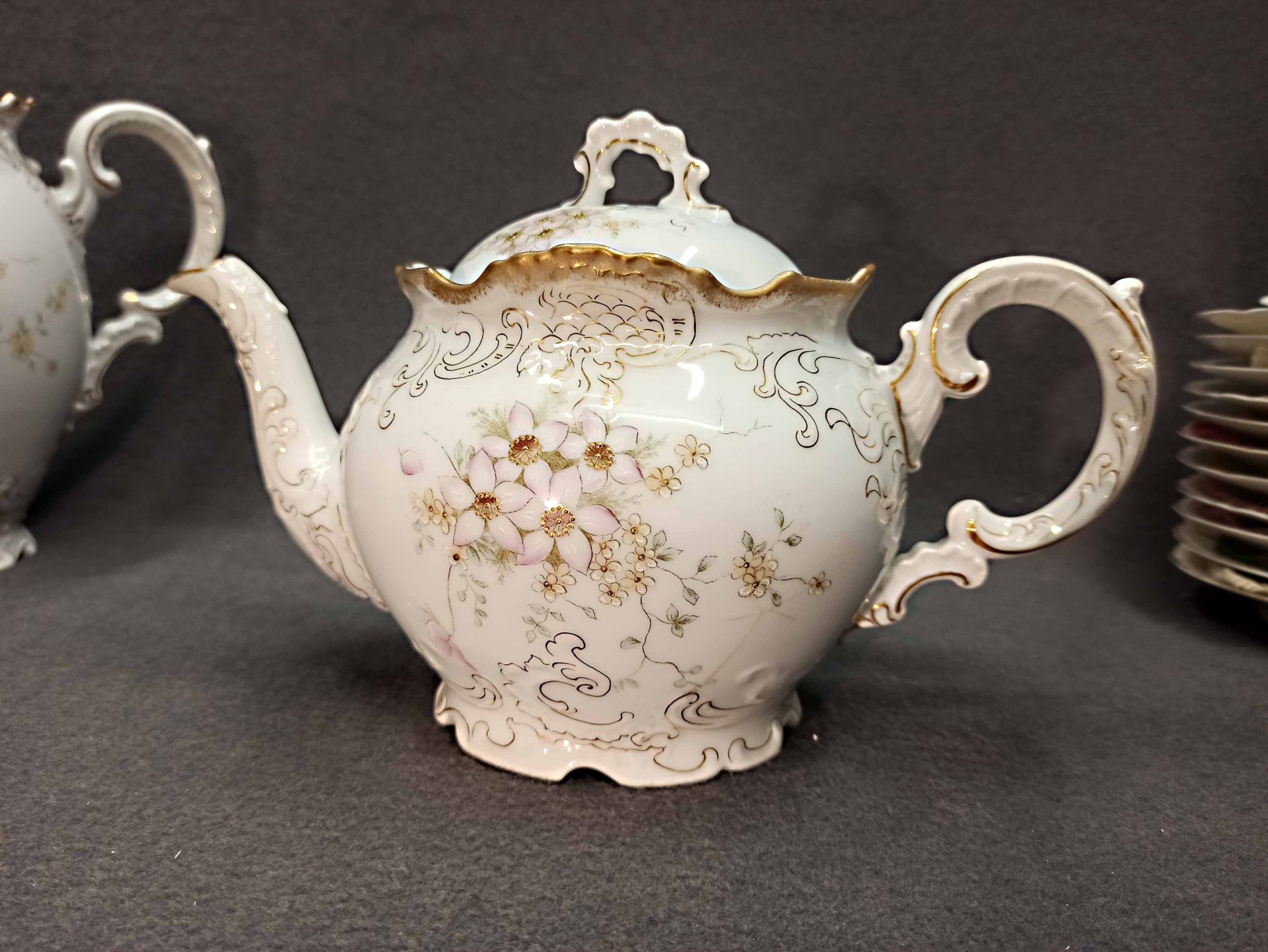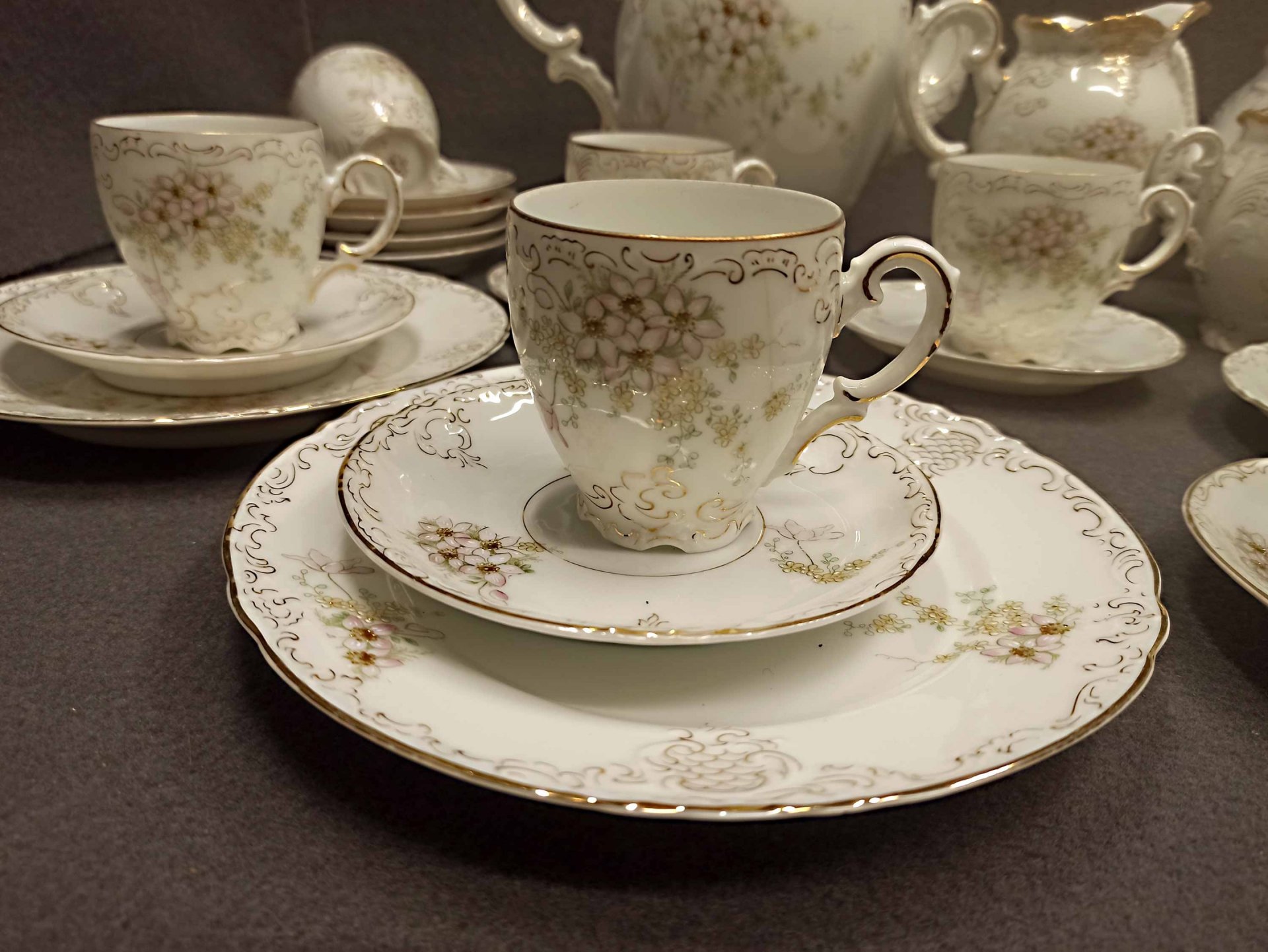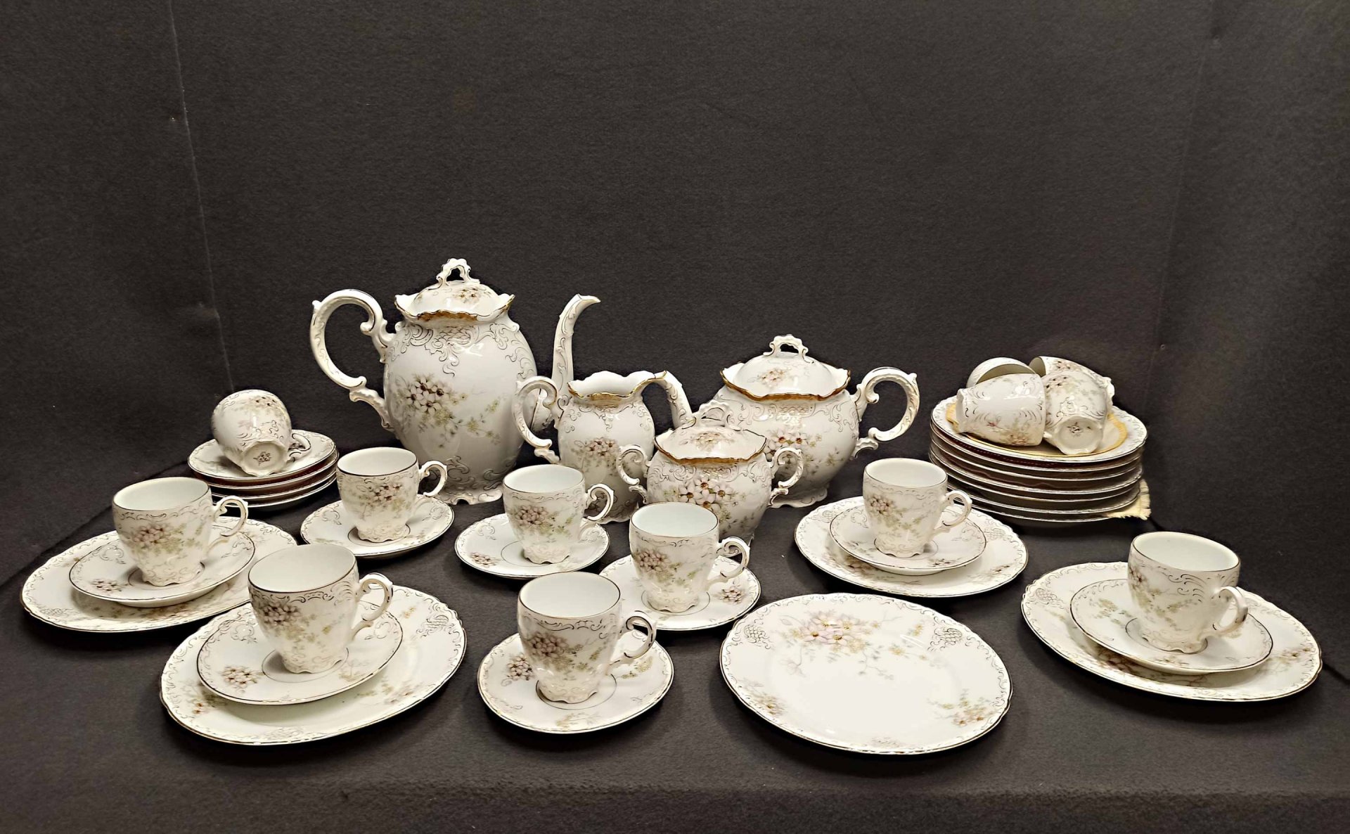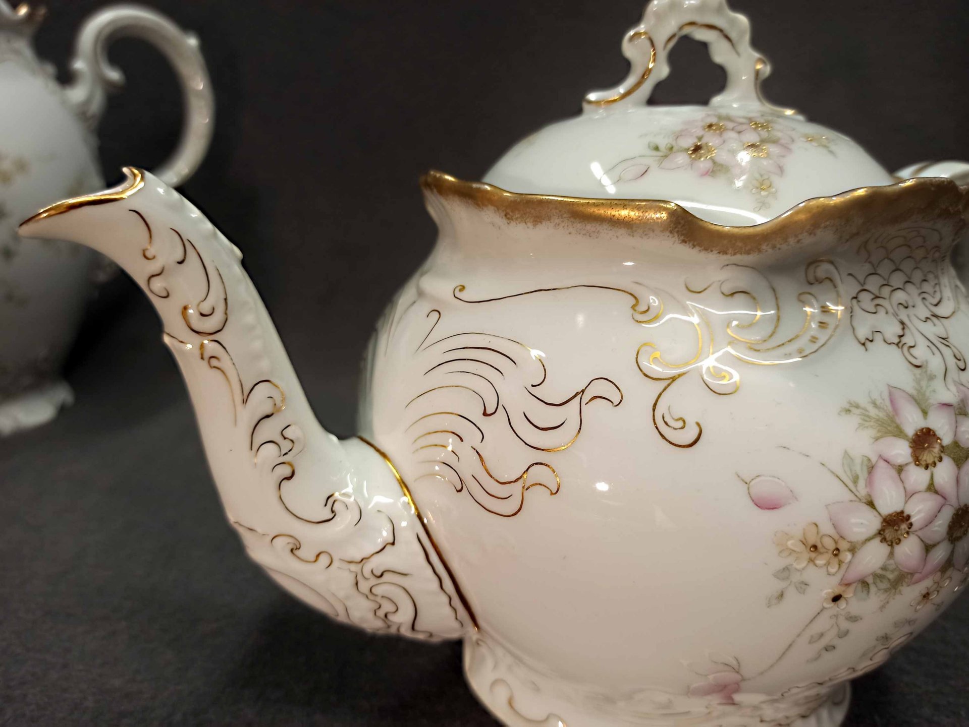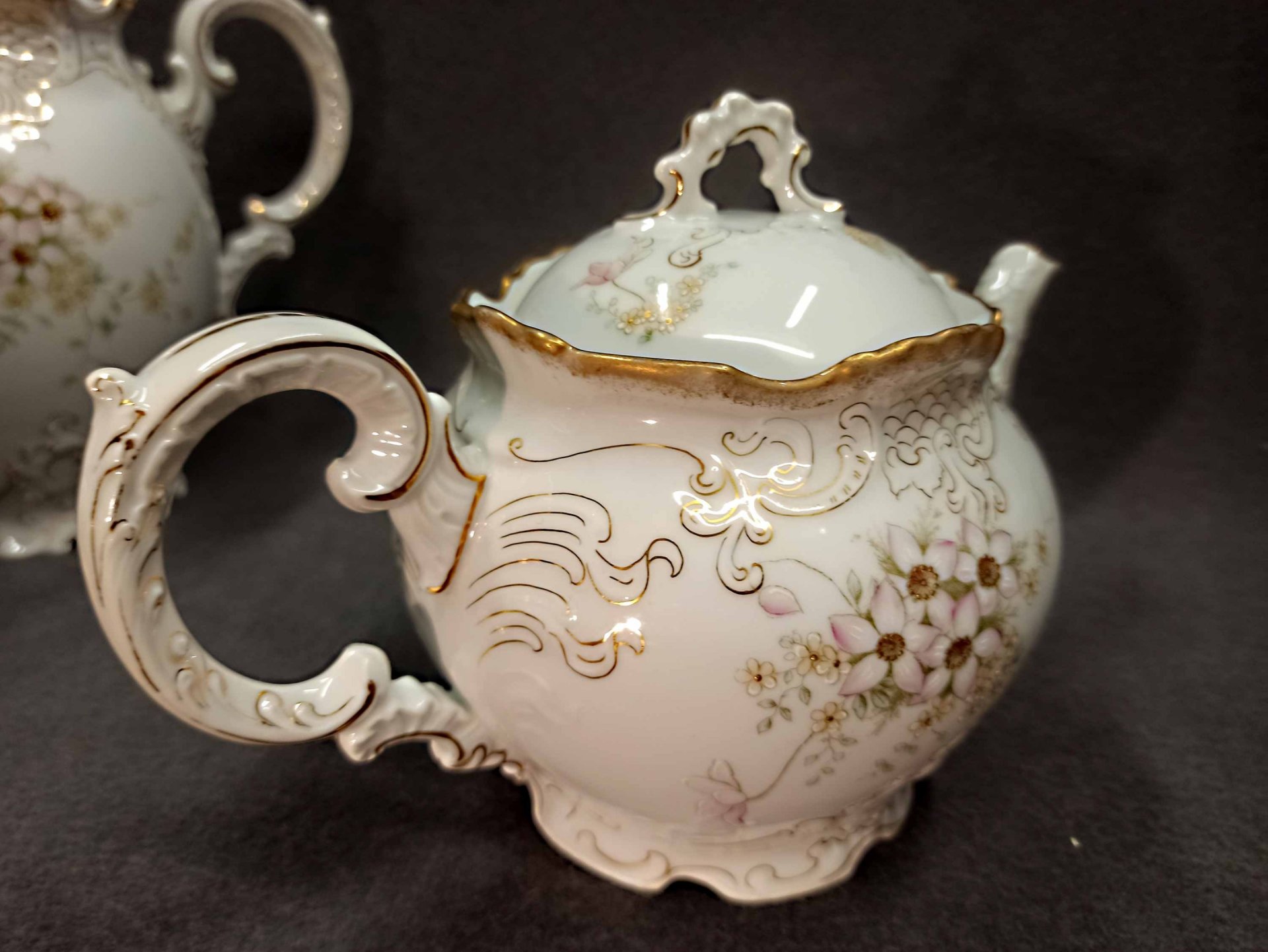 Reserviert! Krautheim & Adelberg, Selb um 1890. Teeservice, Kaffeeservice für 12 Personen. Schöne Blumenmalerei in Emaille und Golddekor. 40 Teilig: 1x Teekanne, 1x Kaffeekanne, Sahnegießer und Zuckerdose sowie 12 Gedecke je Tasse mit Untertasse und Kuchenteller. Gut/sehr gut erhalten. Eine Tasse mit Beschädigung, Abplatzer mit Riss (Foto). Alles andere i.O. Die Malerei ist sehr gut und es gibt keine Gebrauchsspuren.