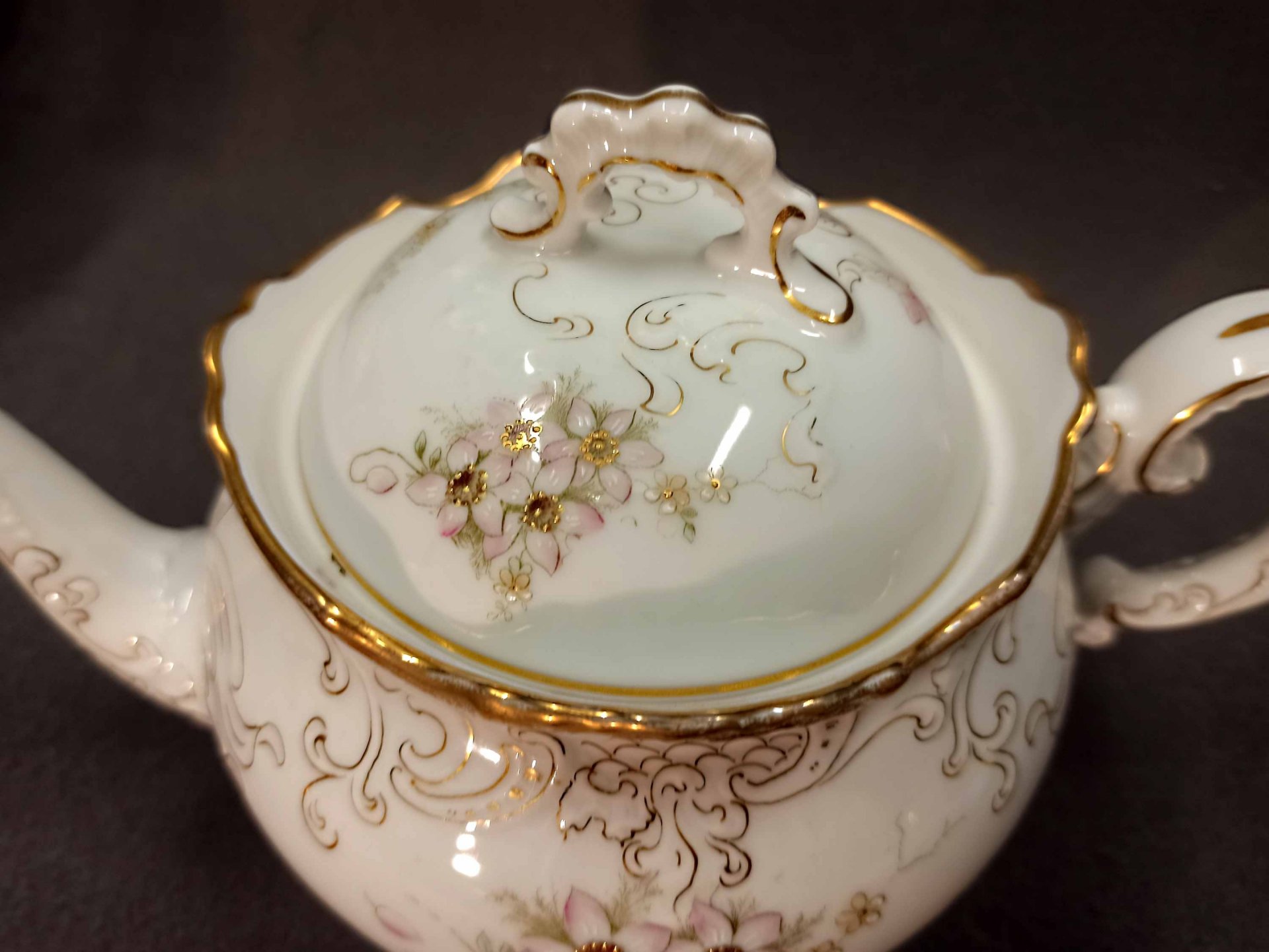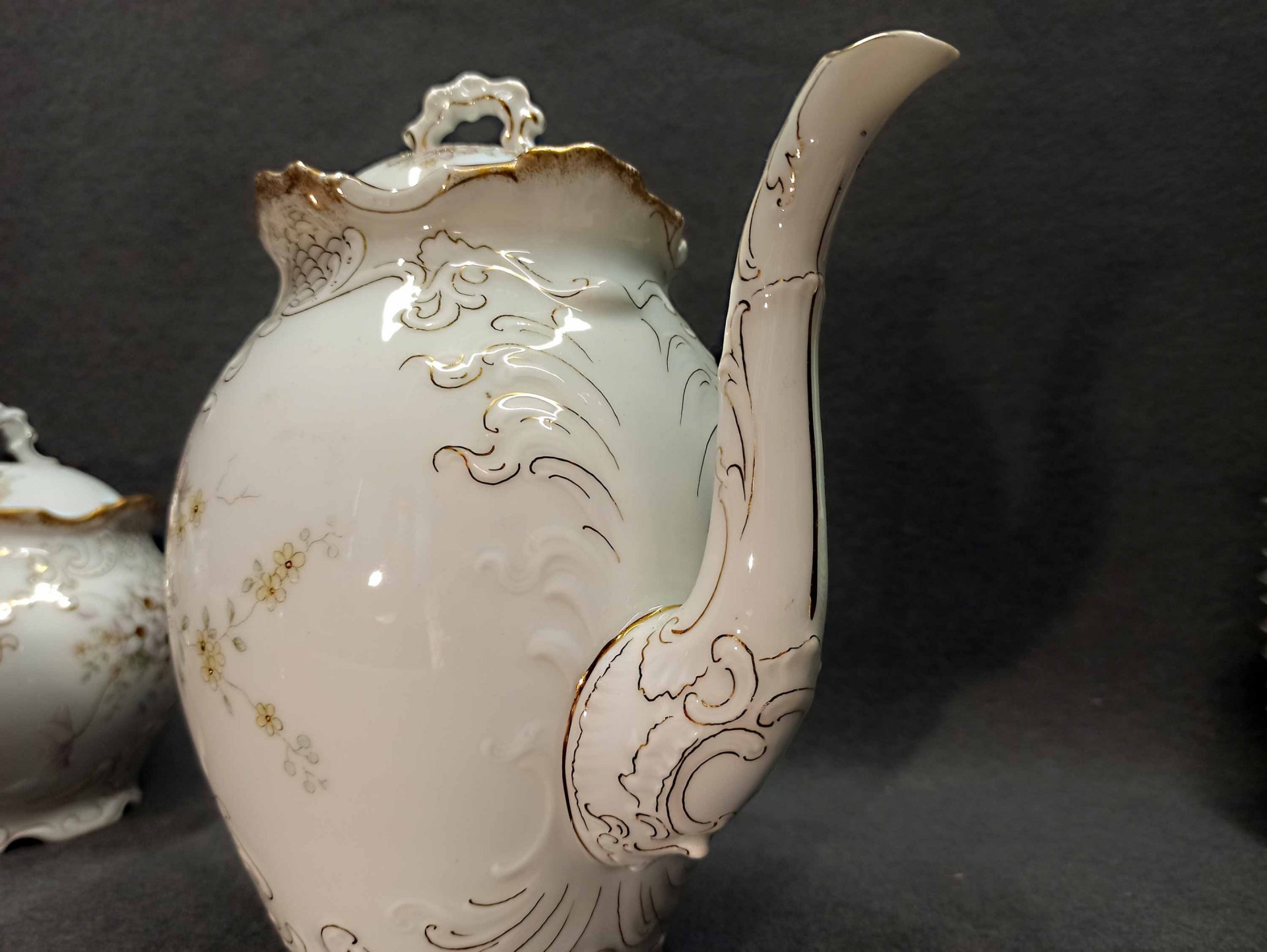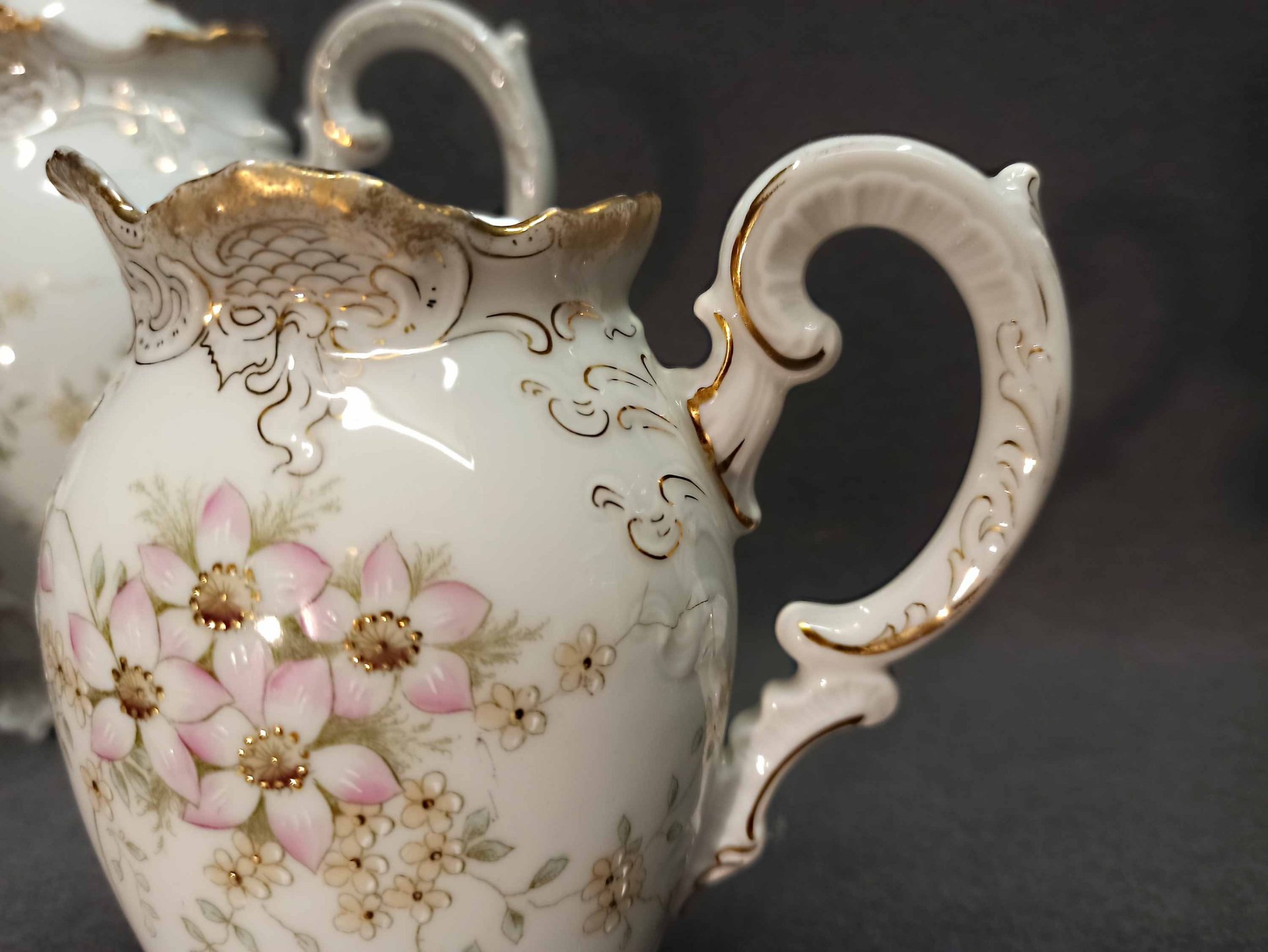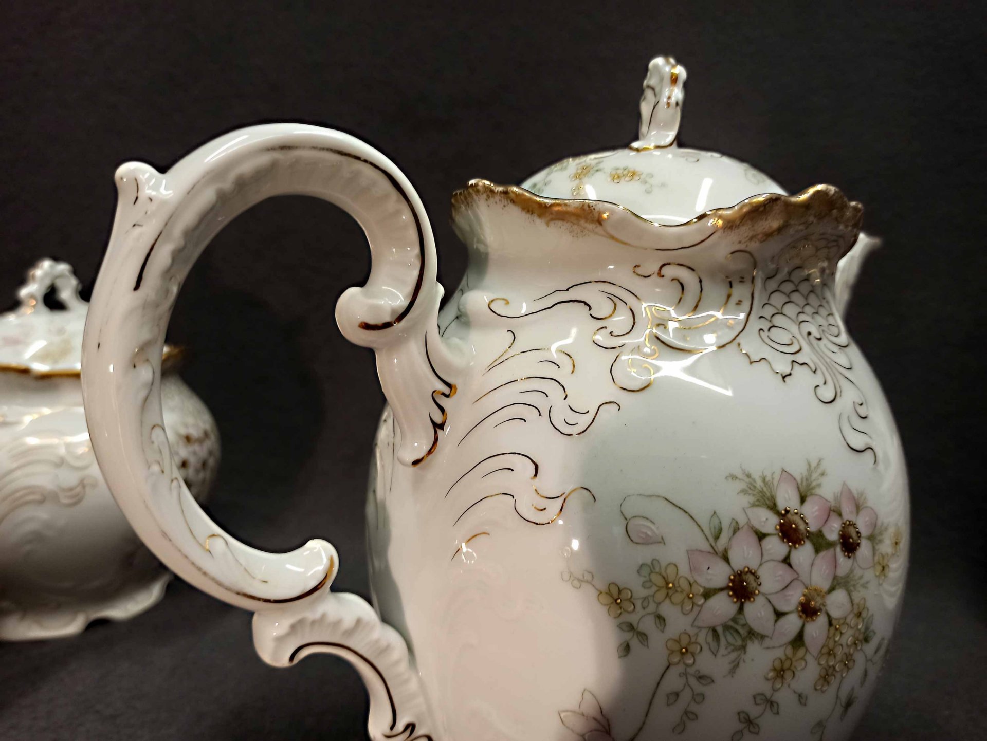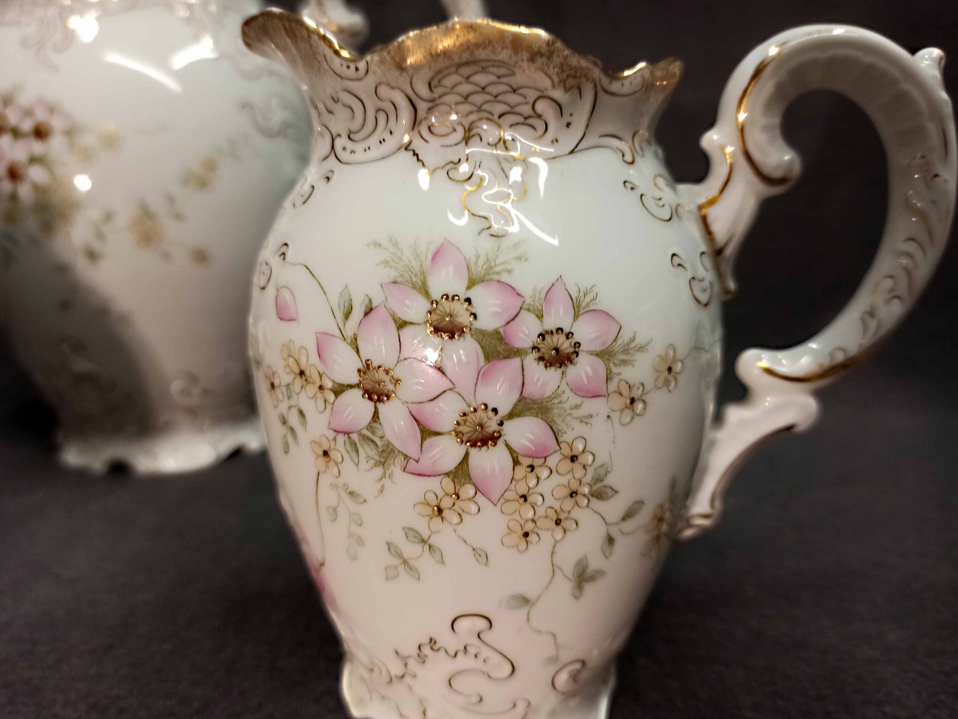 Reserviert! Krautheim & Adelberg, Selb um 1890. Teeservice, Kaffeeservice für 12 Personen. Schöne Blumenmalerei in Emaille und Golddekor. 40 Teilig: 1x Teekanne, 1x Kaffeekanne, Sahnegießer und Zuckerdose sowie 12 Gedecke je Tasse mit Untertasse und Kuchenteller. Gut/sehr gut erhalten. Eine Tasse mit Beschädigung, Abplatzer mit Riss (Foto). Alles andere i.O. Die Malerei ist sehr gut und es gibt keine Gebrauchsspuren.
