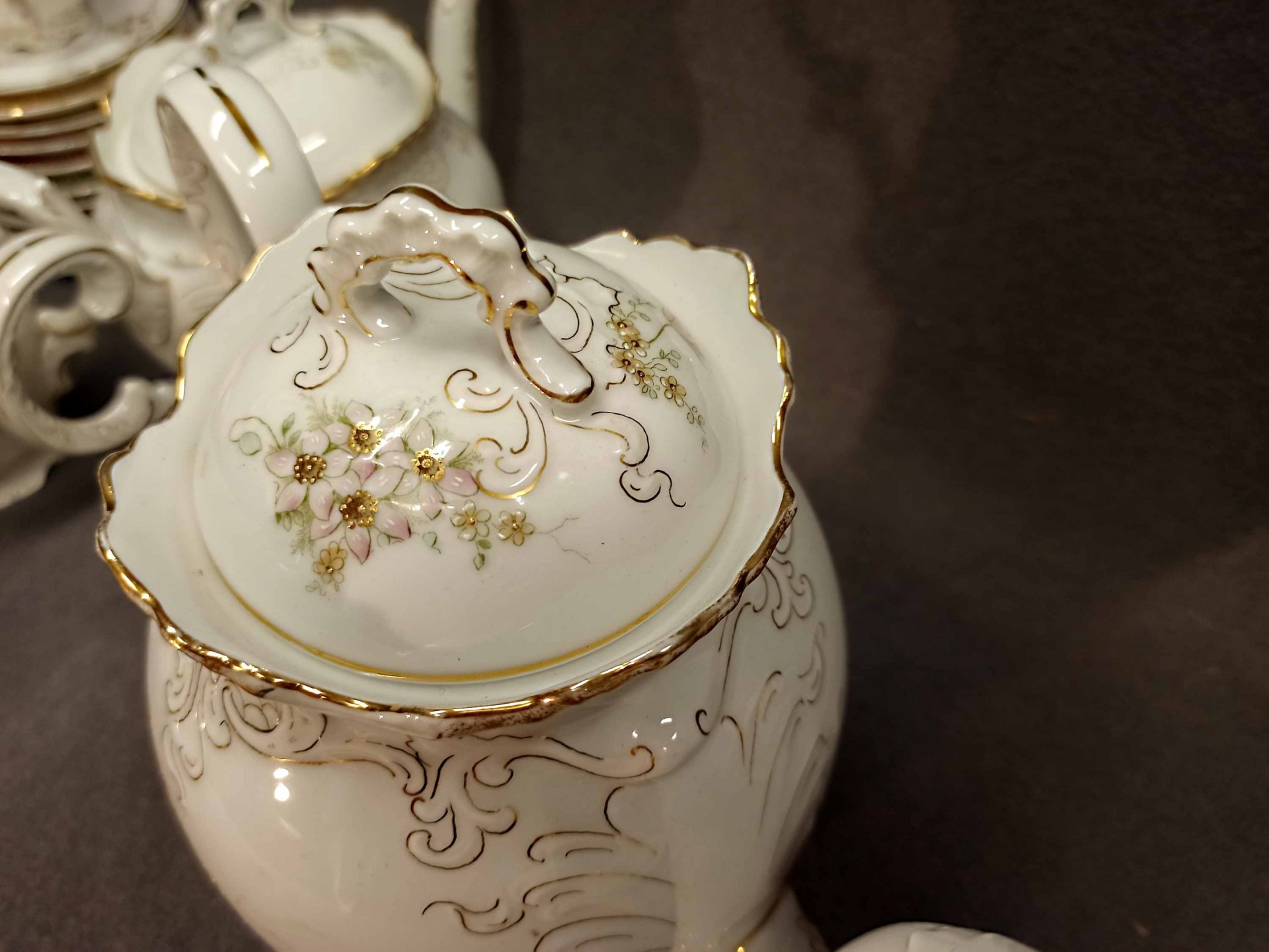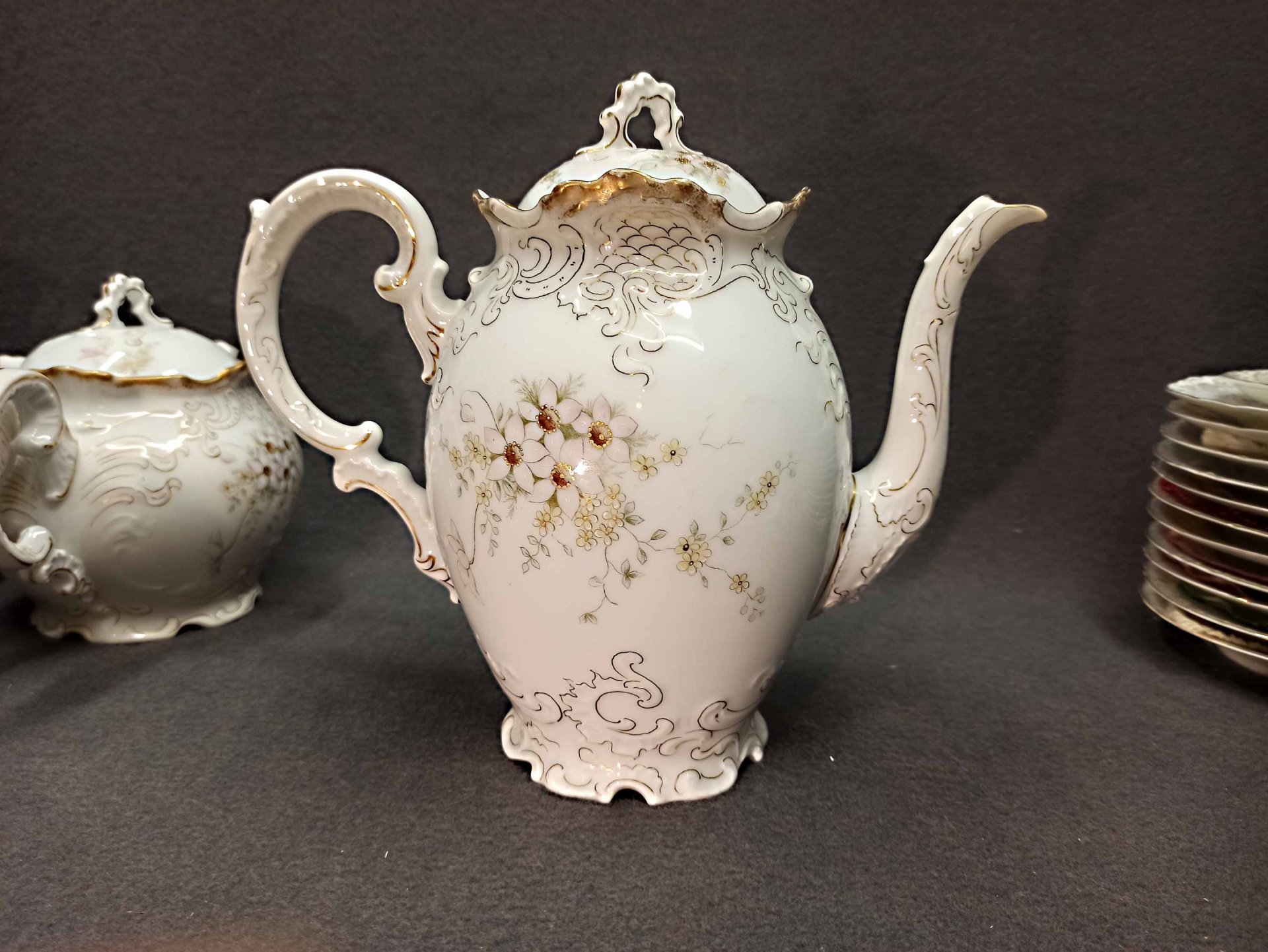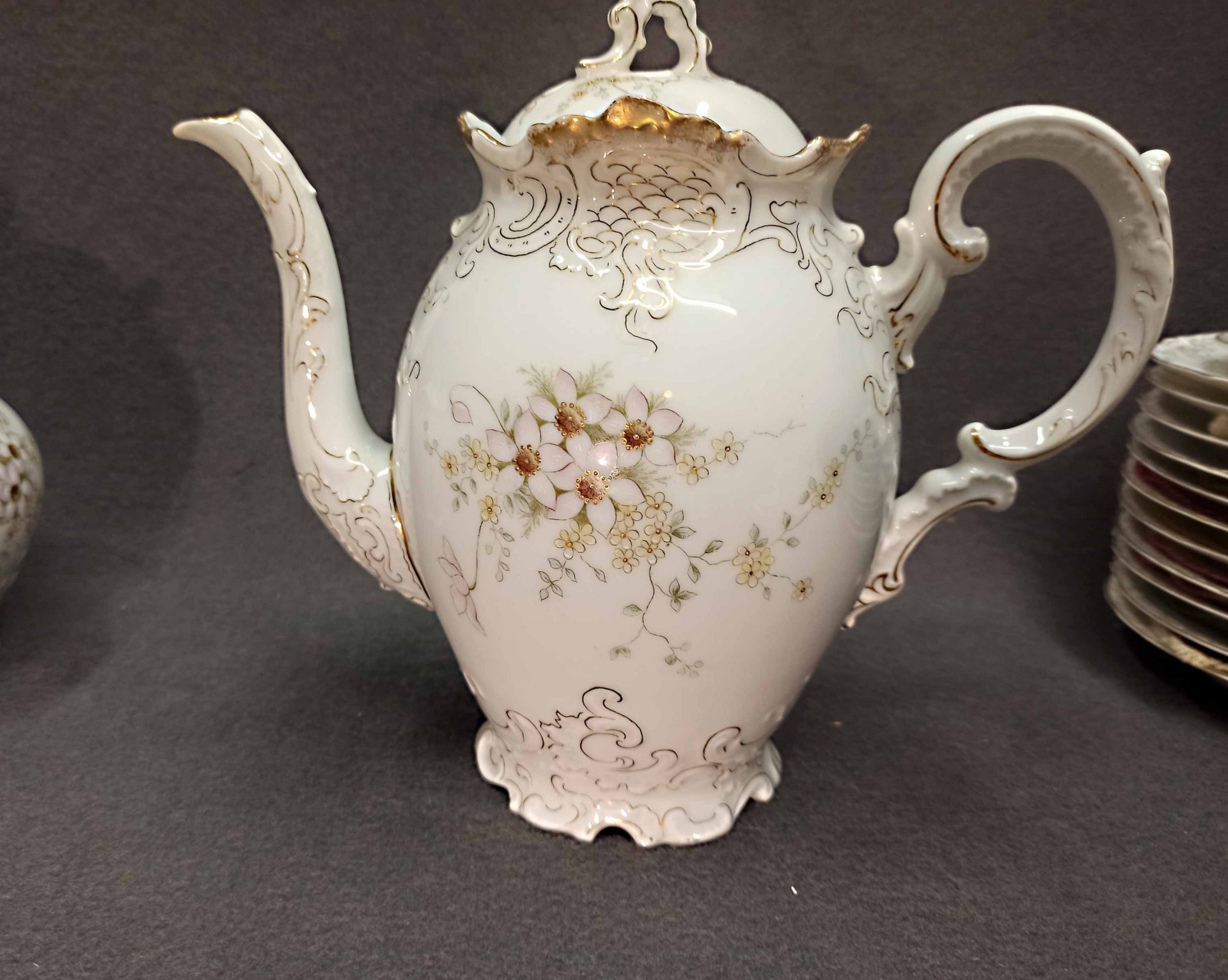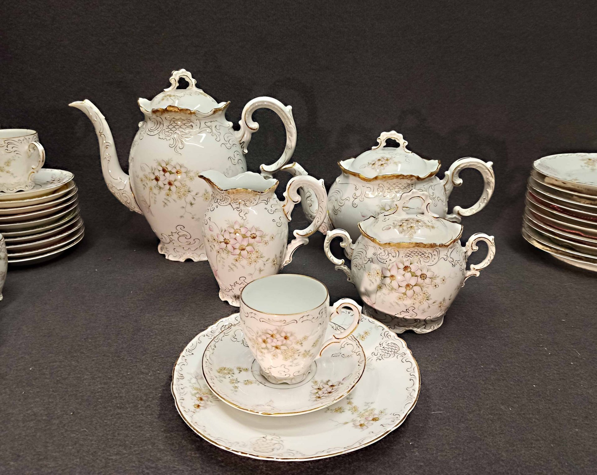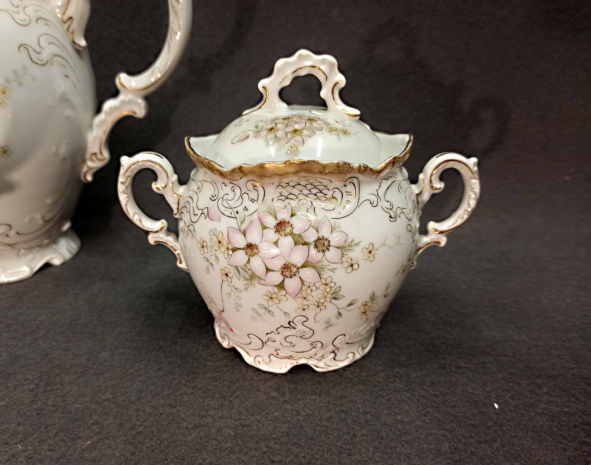 Reserviert! Krautheim & Adelberg, Selb um 1890. Teeservice, Kaffeeservice für 12 Personen. Schöne Blumenmalerei in Emaille und Golddekor. 40 Teilig: 1x Teekanne, 1x Kaffeekanne, Sahnegießer und Zuckerdose sowie 12 Gedecke je Tasse mit Untertasse und Kuchenteller. Gut/sehr gut erhalten. Eine Tasse mit Beschädigung, Abplatzer mit Riss (Foto). Alles andere i.O. Die Malerei ist sehr gut und es gibt keine Gebrauchsspuren.