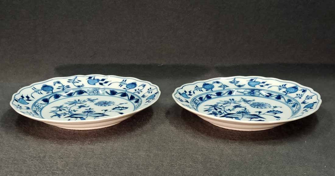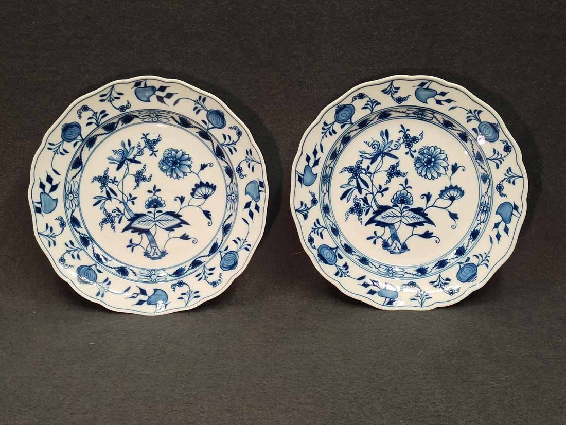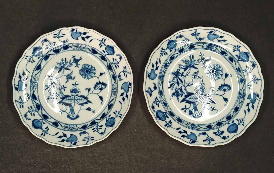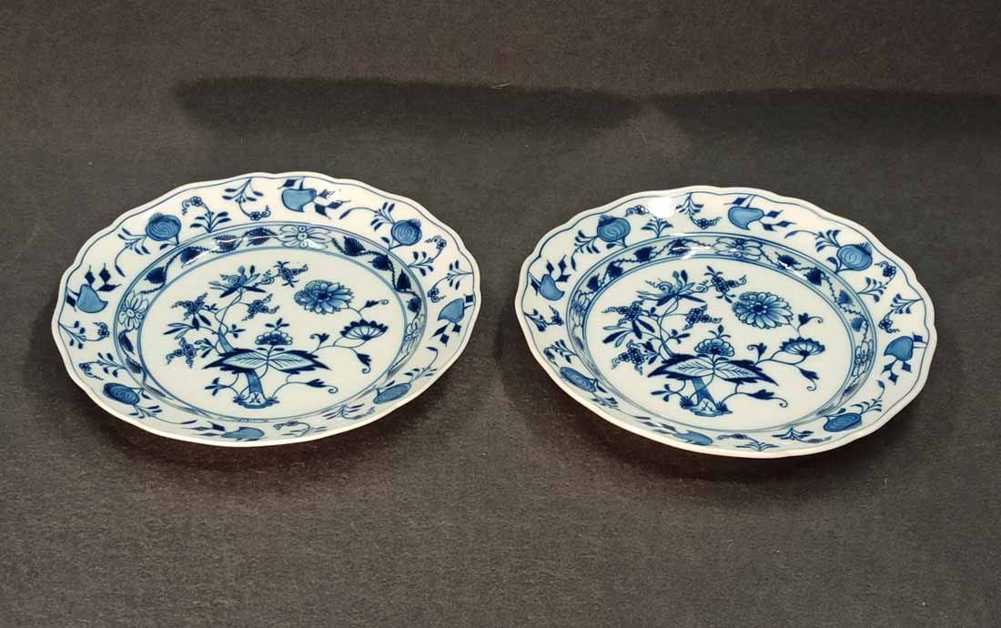 2x Meissen, Zwiebelmuster zwei alte Teller um 1880. Sehr guter Zustand ohne Beschädigungen. Teller leicht different in Malerei und Form, alterstypisch. Schwertermarke der Manufaktur Meissen mit Knauff Griffen (Knaufschwerter) um 1880, 4x gestrichen. D. ca 24,5 cm, H. ca 3,7 cm.