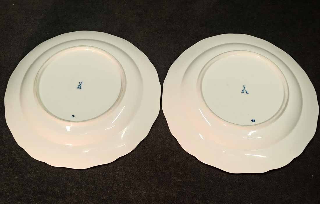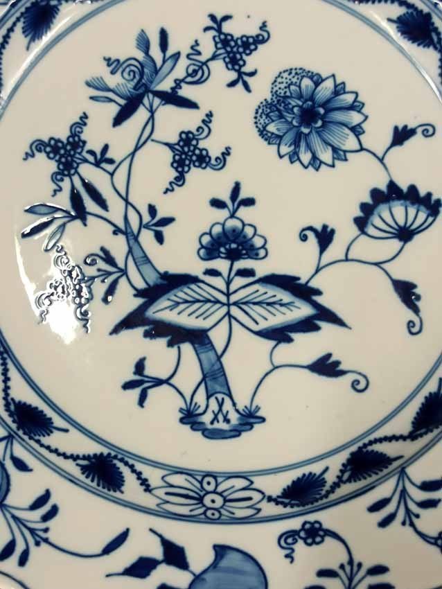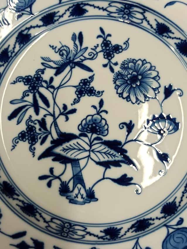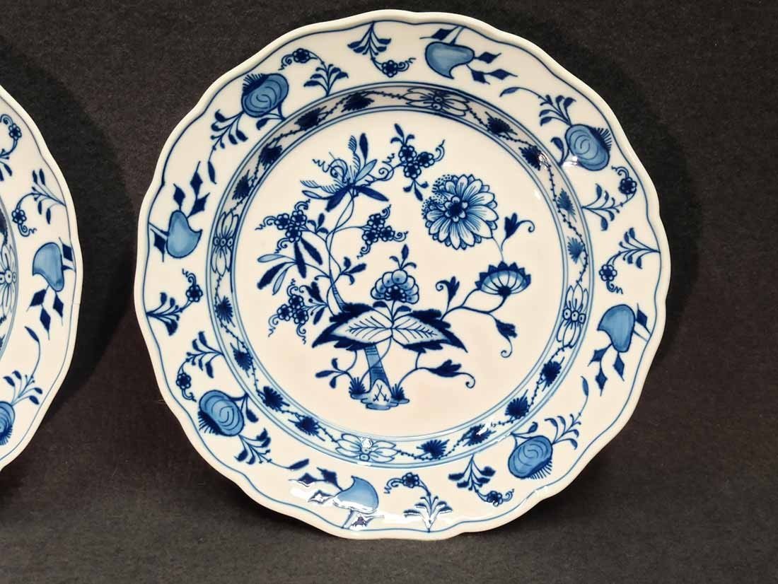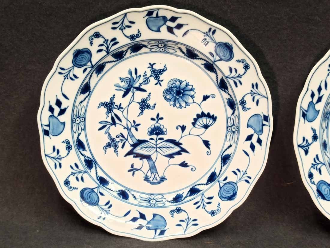 2x Meissen, Zwiebelmuster zwei alte Teller um 1880. Sehr guter Zustand ohne Beschädigungen. Teller leicht different in Malerei und Form, alterstypisch. Schwertermarke der Manufaktur Meissen mit Knauff Griffen (Knaufschwerter) um 1880, 4x gestrichen. D. ca 24,5 cm, H. ca 3,7 cm.