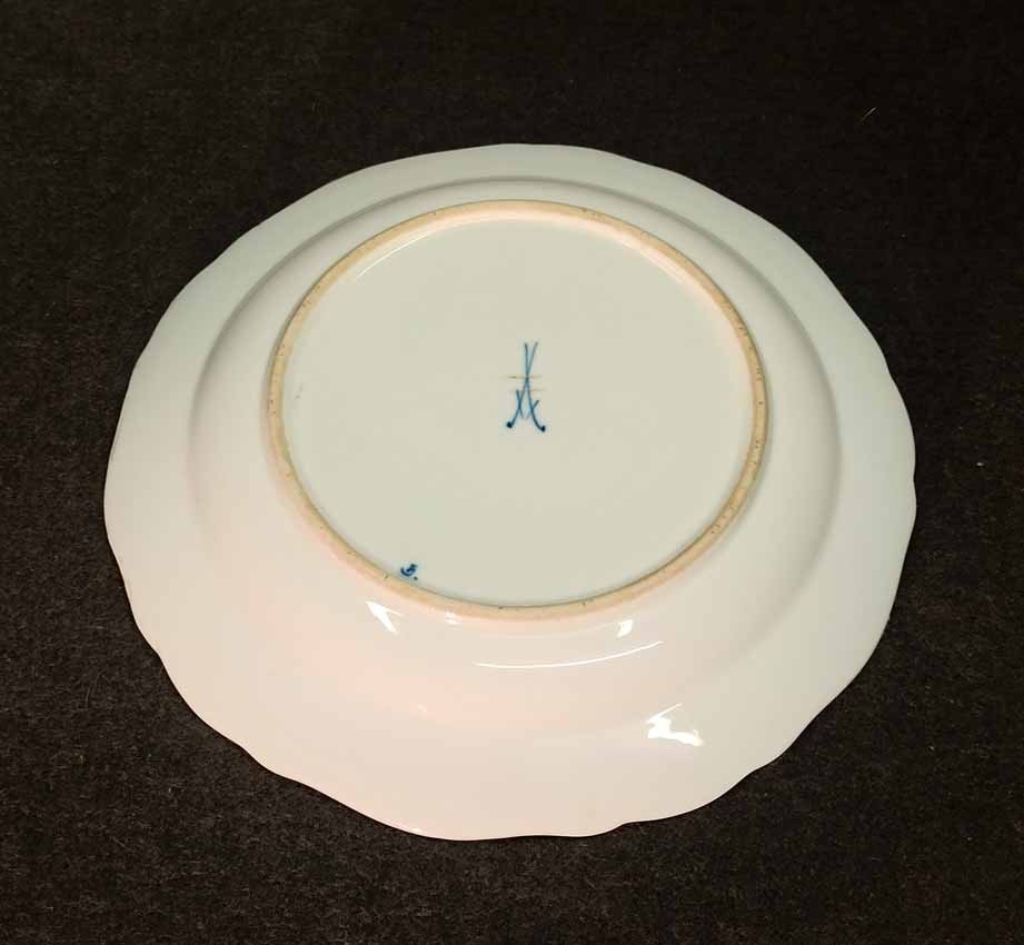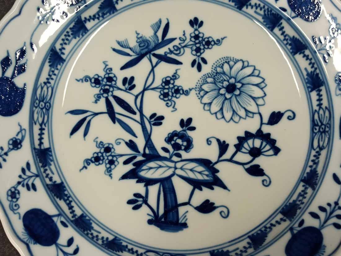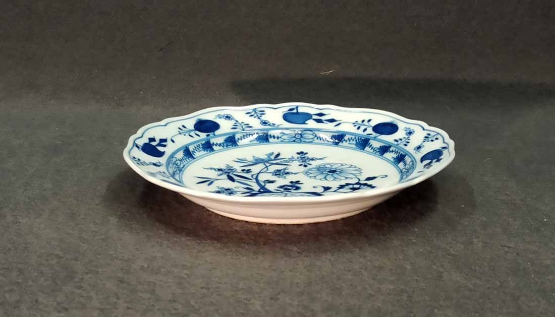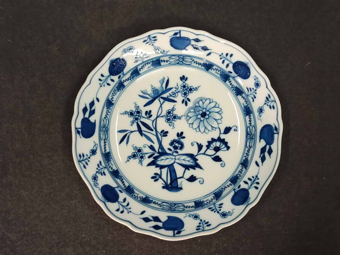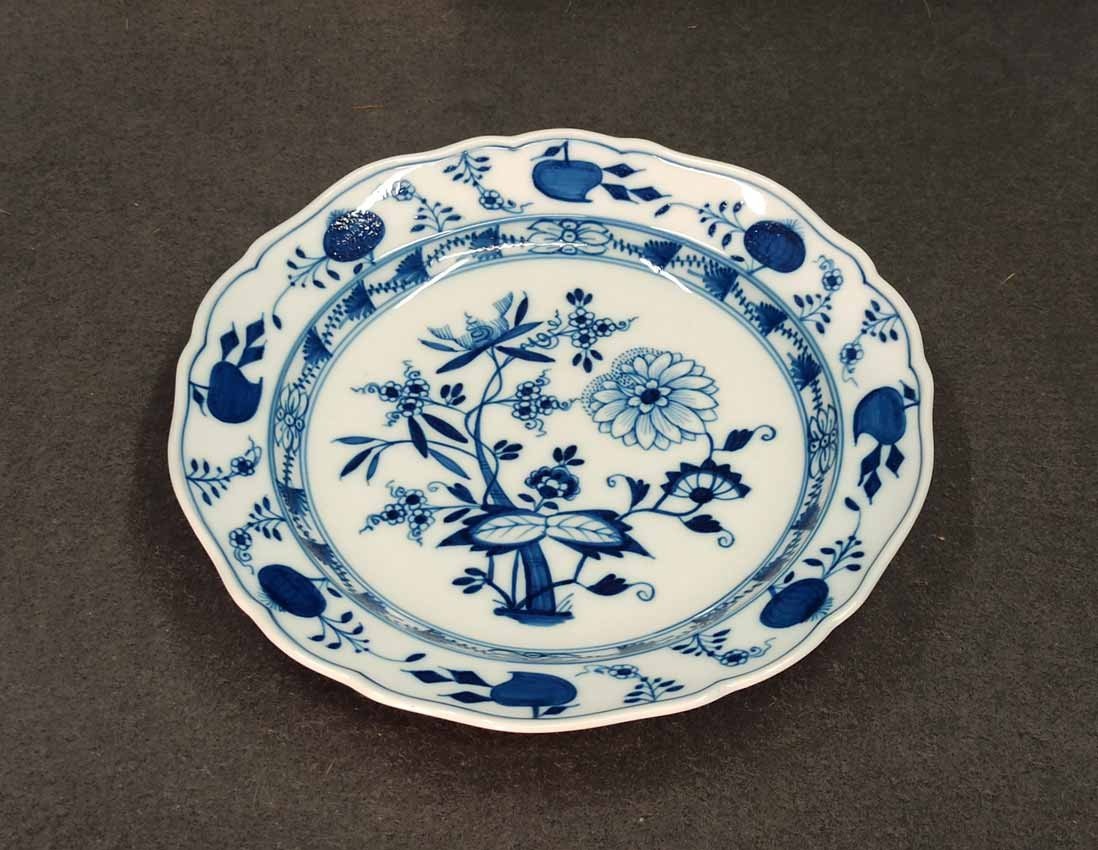 Meissen alt, Zwiebelmuster Teller um 1860, Speiseteller. Sehr guter Zustand ohne Beschädigungen. Alter Teller vor 1880, die Schwerter wiederholen sich nicht in der Wurzel a.d. Vorderseite. D. 21 cm, H. 3,5 cm. Schwertermarke der Manufaktur Meissen, große Knauffschwerter 2x gestrichen.