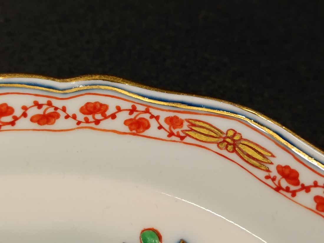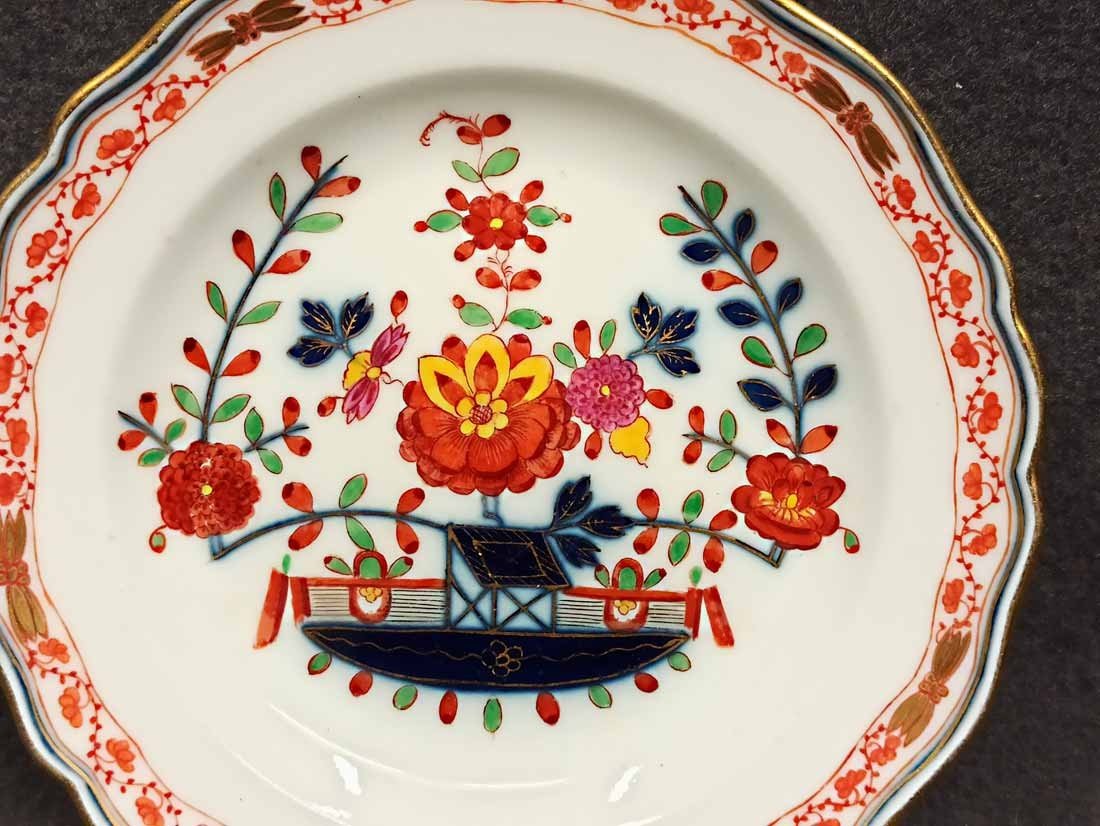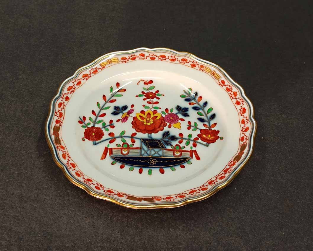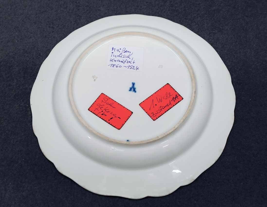 Meissen, Teller, Dekor Tischchenmuster, asiatische Malerei. Kleiner Speiseteller um 1880. D. 19 cm, 1. Wahl. Schwertermarke mit Knaufgriffen 1860 - 1924, Marke ohne Schleifstriche 1. Wahl. Zustand ohne Beschädigungen, keine Chips oder Abplatzer. Rs. alte Sammleretiketten.